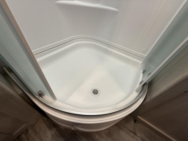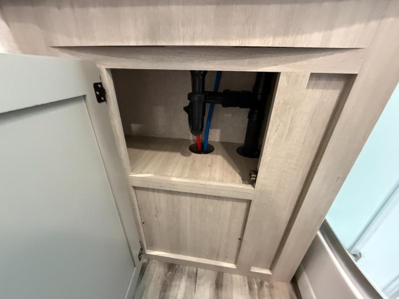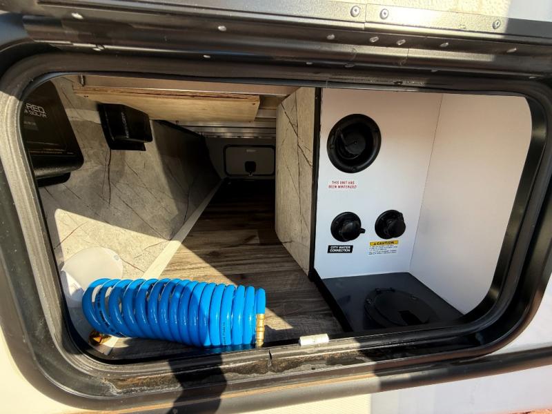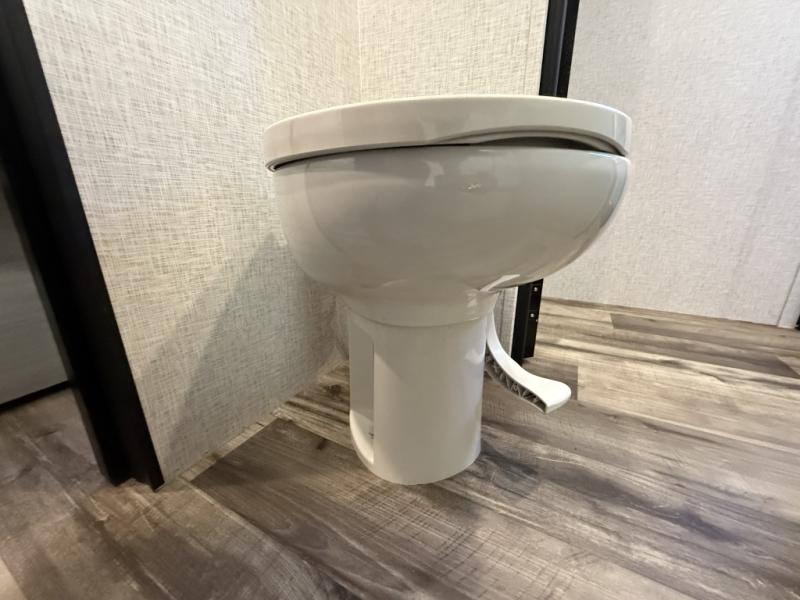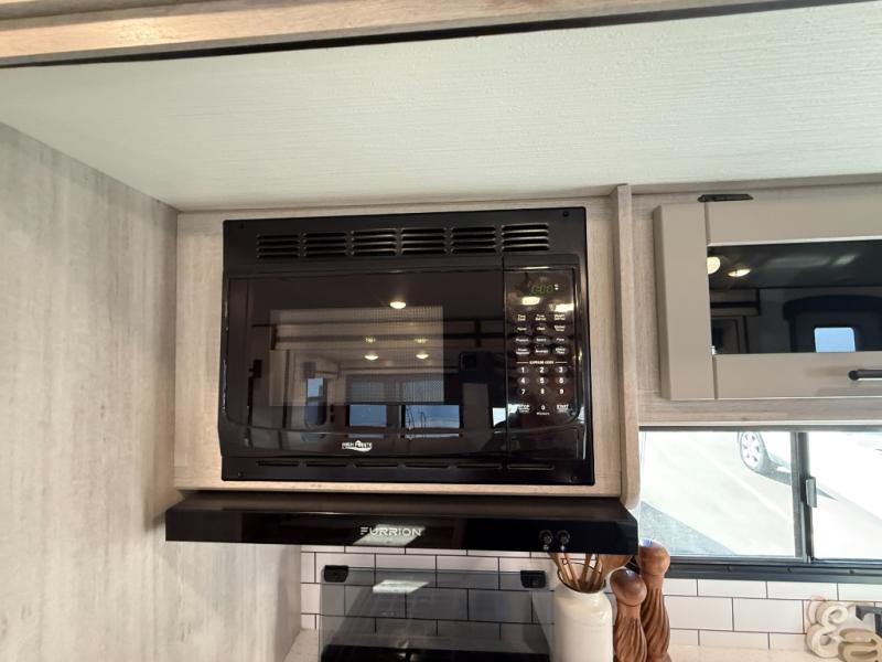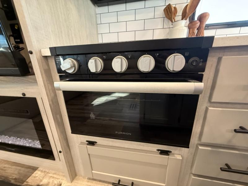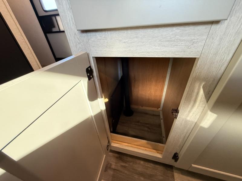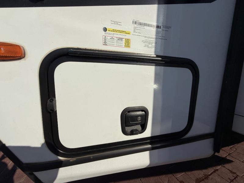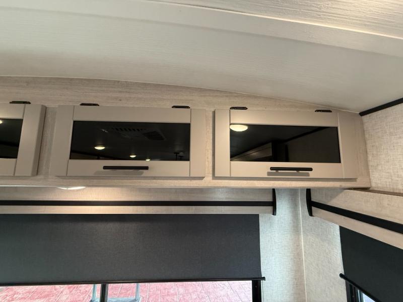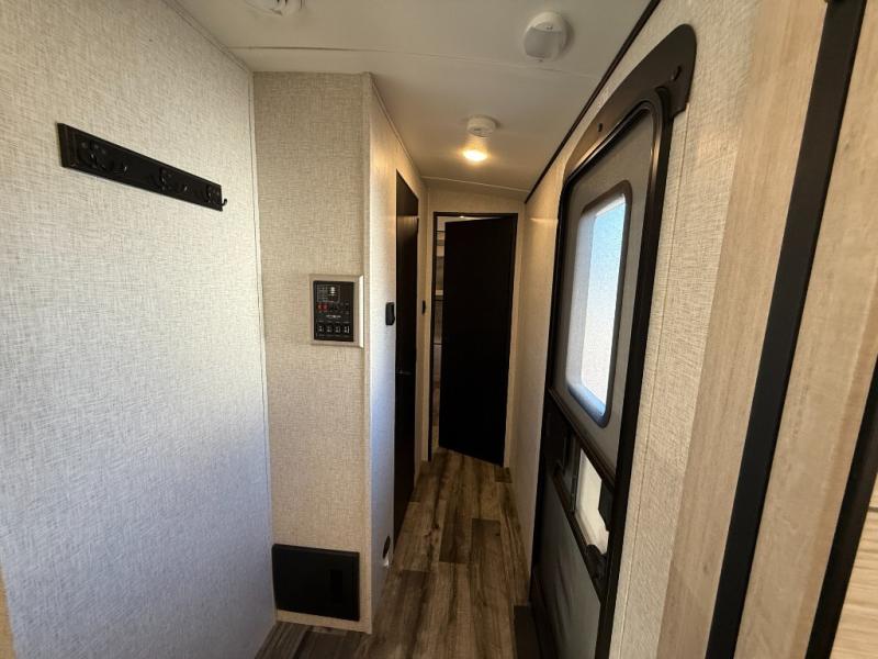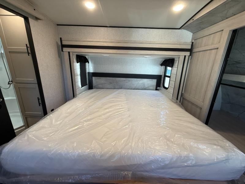 This spacious travel trailer is beaming with luxurious features you are sure to love. The dual opposing slides in the main living area open up the whole space, plus there is a third slide out in the front master suite. The chef of the family will appreciate the kitchen island for additional counter space, and there is a large pantry for all your non-perishables. This space has also been prepped to add an optional washer and dryer if you choose. Your family will find plenty of seating space on the rear 82" tri-fold sofa, the XL booth dinette, and the theater seating. The dual entry bath creates a front master bedroom, and you'll find plenty of storage space here, including a chest of drawers and a large front shelf!