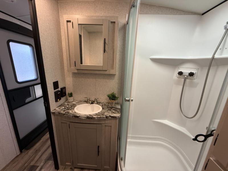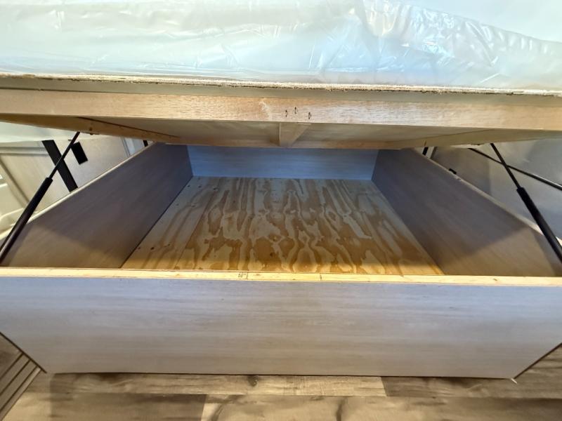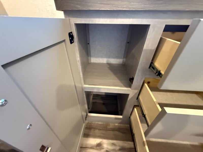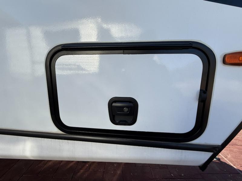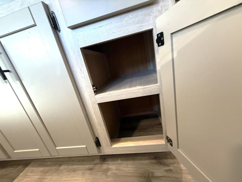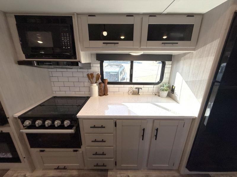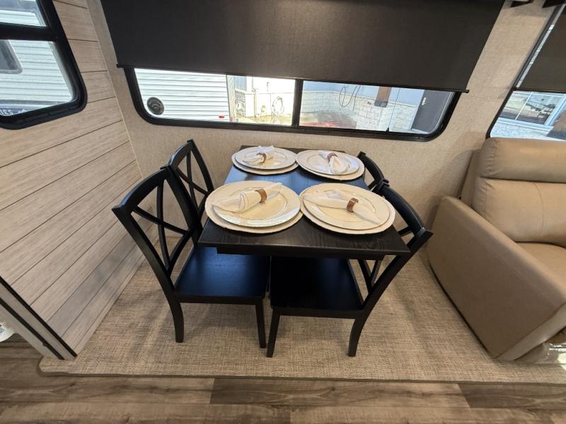 With any Sunset Trail travel trailer by CrossRoads RV, the interior offers a stainless steel farmhouse sink with a cover, solid surface kitchen countertops, and a docking station with 12 Volt, USB Port, and 110 Outlets. Also included is a 13,500 BTU air conditioner plus upgraded insulation with roof and floor reflective foil for added comfort, plus sturdy construction elements like a plywood bed board with strut assist, residential wood window trim, and hardwood cabinet doors. Make your lightweight and comfortable RV decision today!