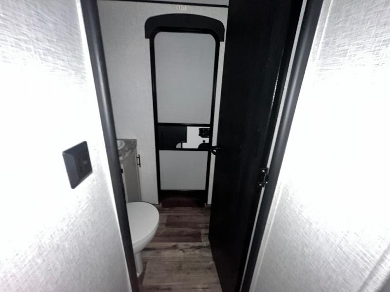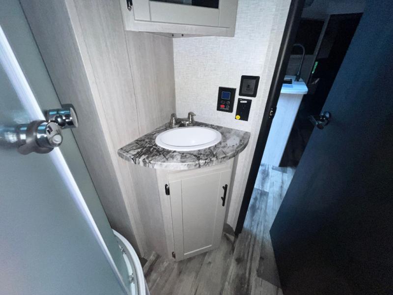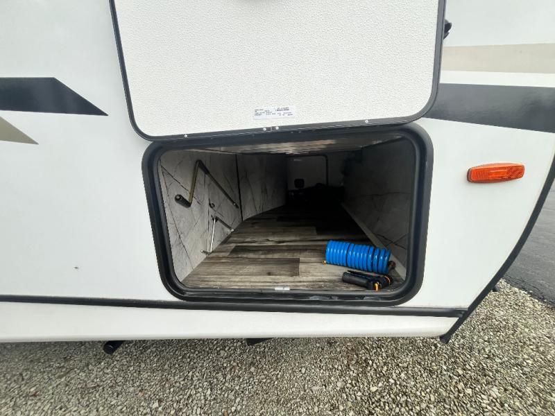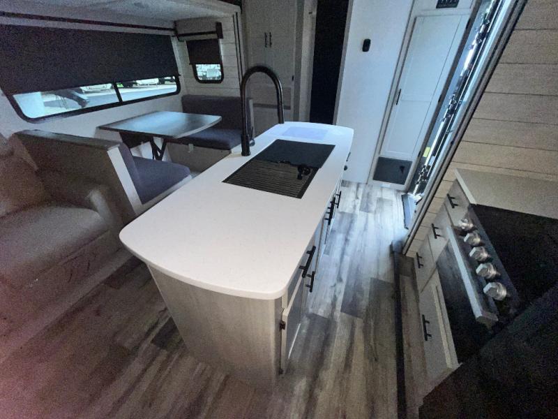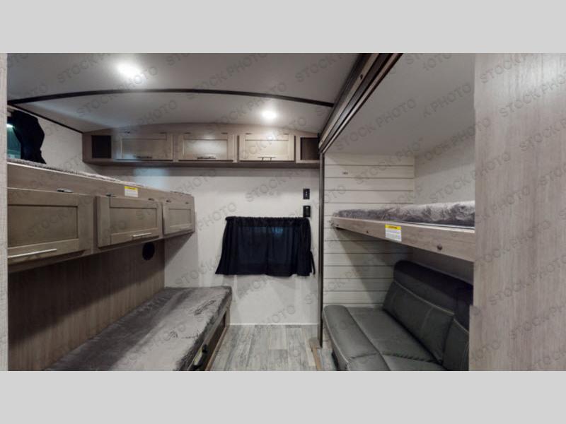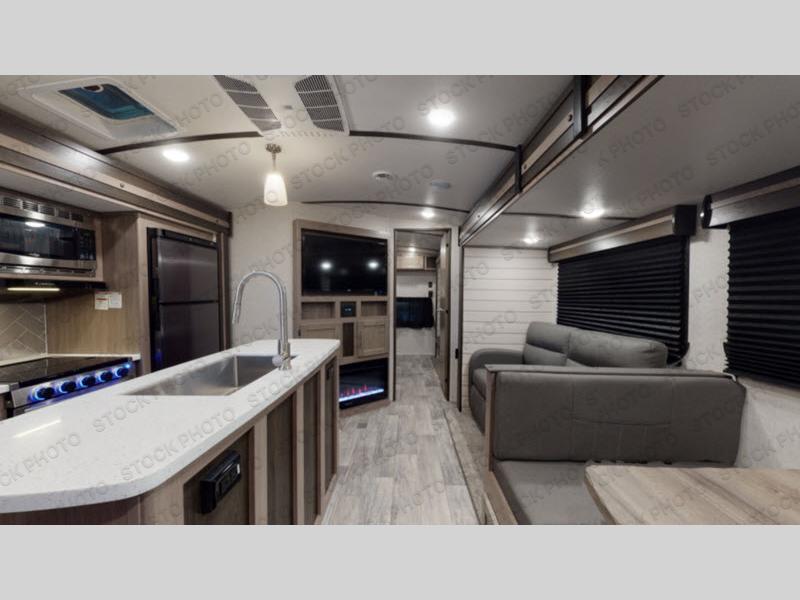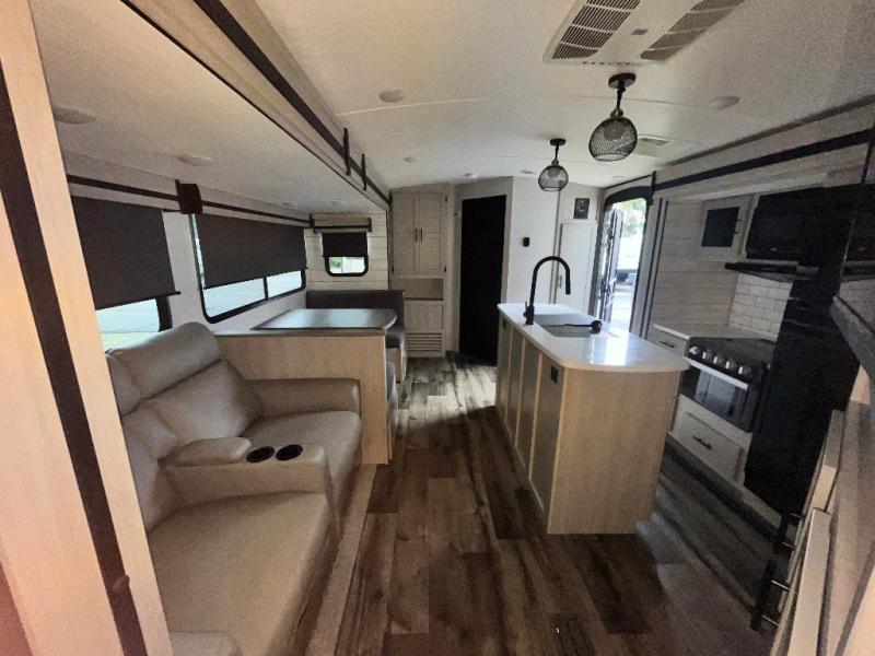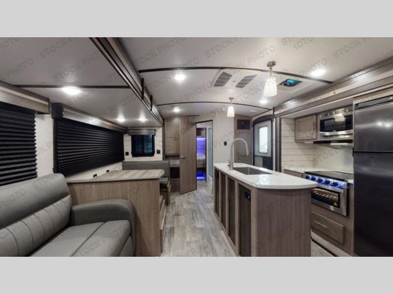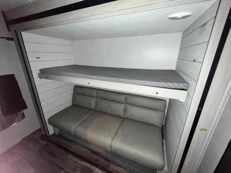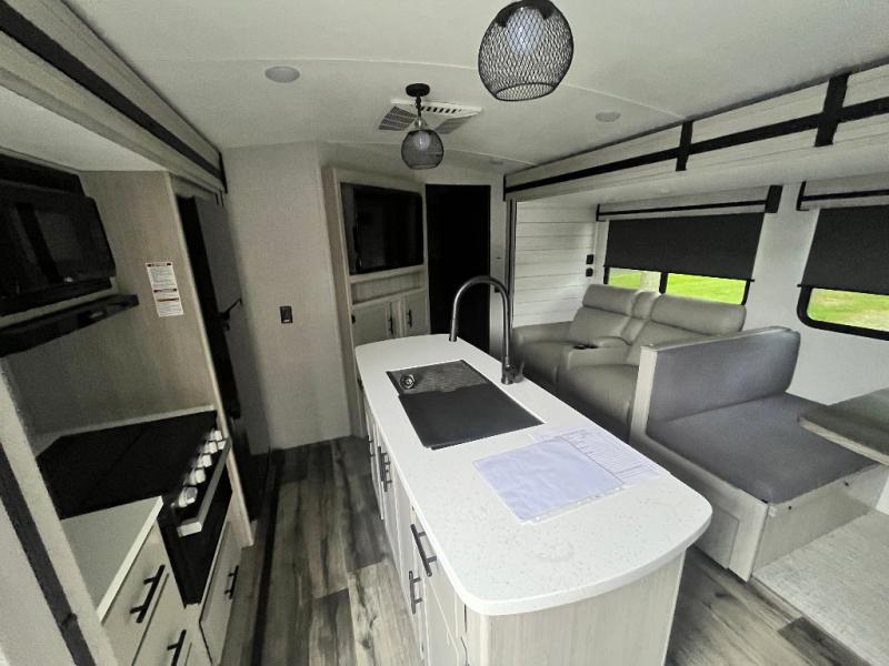 This travel trailer is packed with convenient features and luxury comforts for a camping trip you won't soon forget. Once you arrive at the campground, put out the electric awning and make a quick lunch on the exterior camp kitchen. The kitchen island inside will be the perfect place to cut up all the fixings for the burgers and you can grab the chips from the pantry. The kids will love the private bunkhouse that includes two bunks, a jackknife sofa with a kick, plus a dual entry half bath for convenience. The full walk-through bath will create a front master bedroom you are sure to love. Here, the king bed will provide a great night's rest and there are dual wardrobes for all your clothes. Plus there is a convenient shoe storage and pet station for your trusted loyal friends!