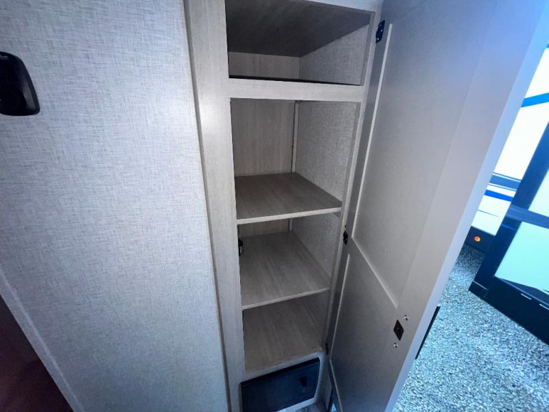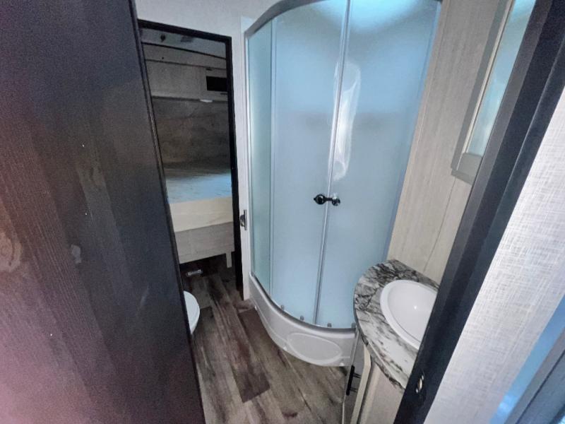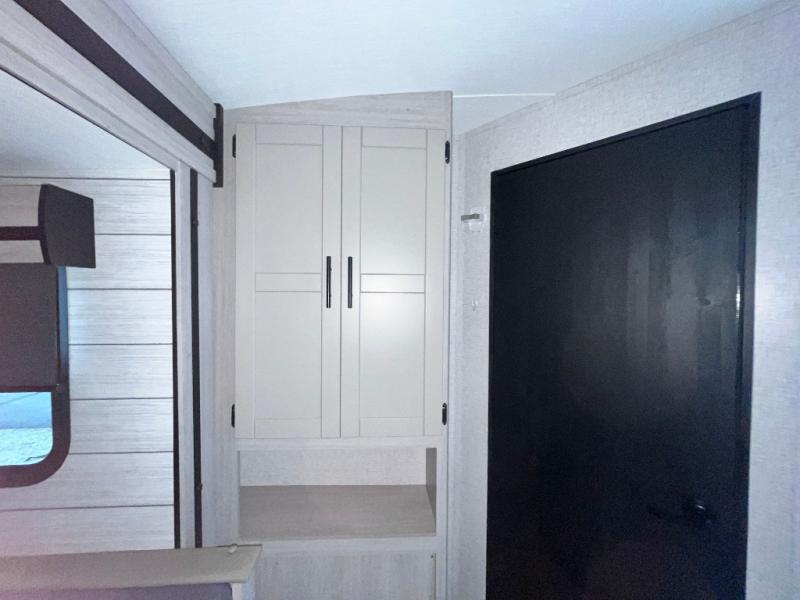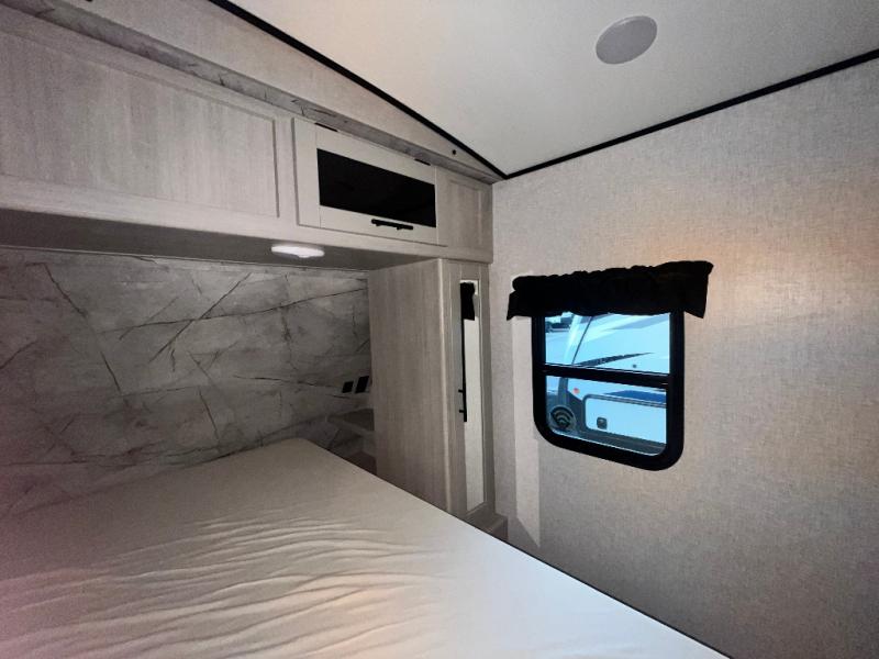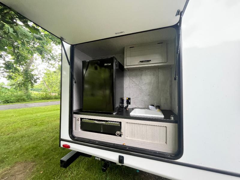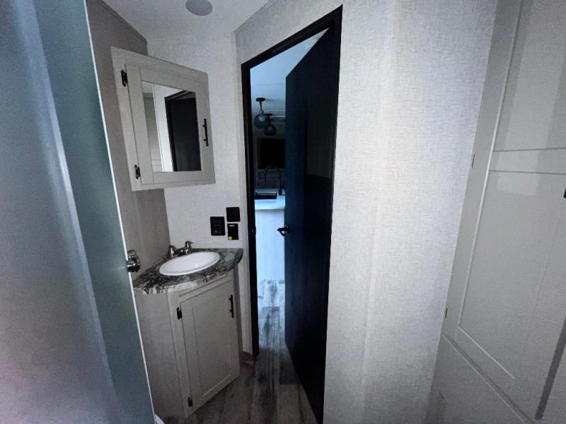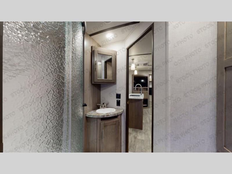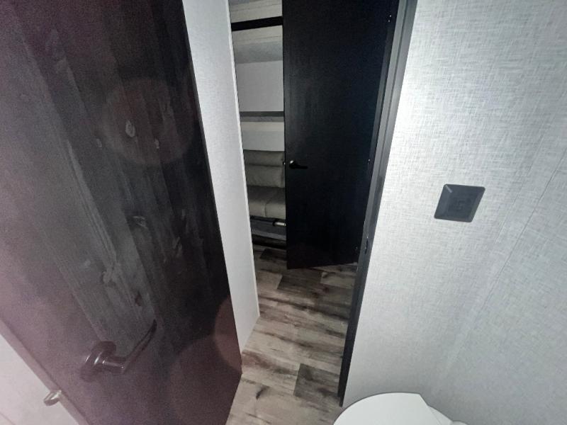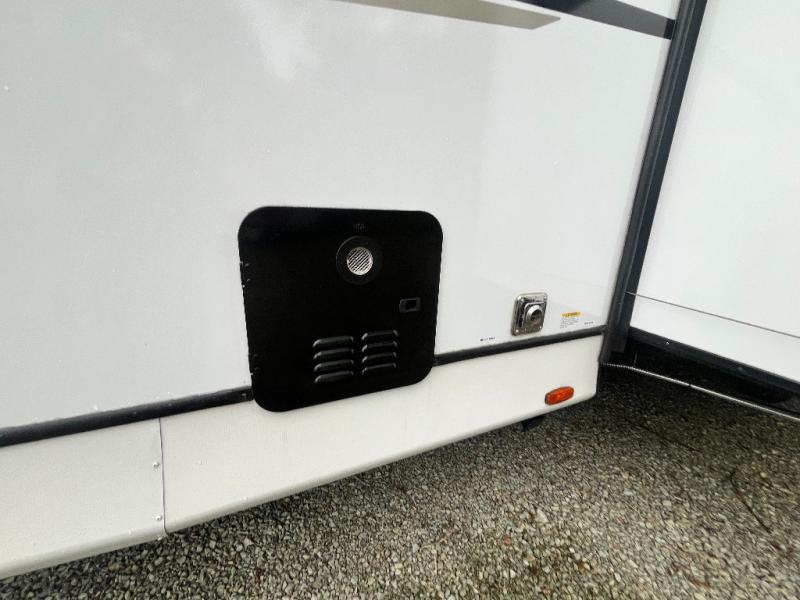 This travel trailer is packed with convenient features and luxury comforts for a camping trip you won't soon forget. Once you arrive at the campground, put out the electric awning and make a quick lunch on the exterior camp kitchen. The kitchen island inside will be the perfect place to cut up all the fixings for the burgers and you can grab the chips from the pantry. The kids will love the private bunkhouse that includes two bunks, a jackknife sofa with a kick, plus a dual entry half bath for convenience. The full walk-through bath will create a front master bedroom you are sure to love. Here, the king bed will provide a great night's rest and there are dual wardrobes for all your clothes. Plus there is a convenient shoe storage and pet station for your trusted loyal friends!