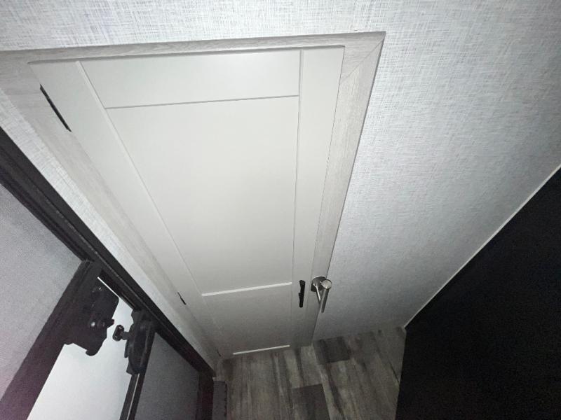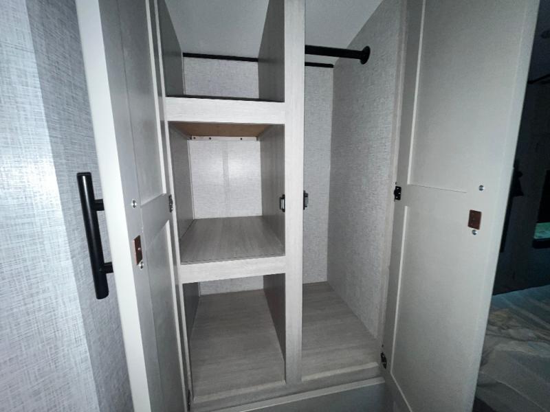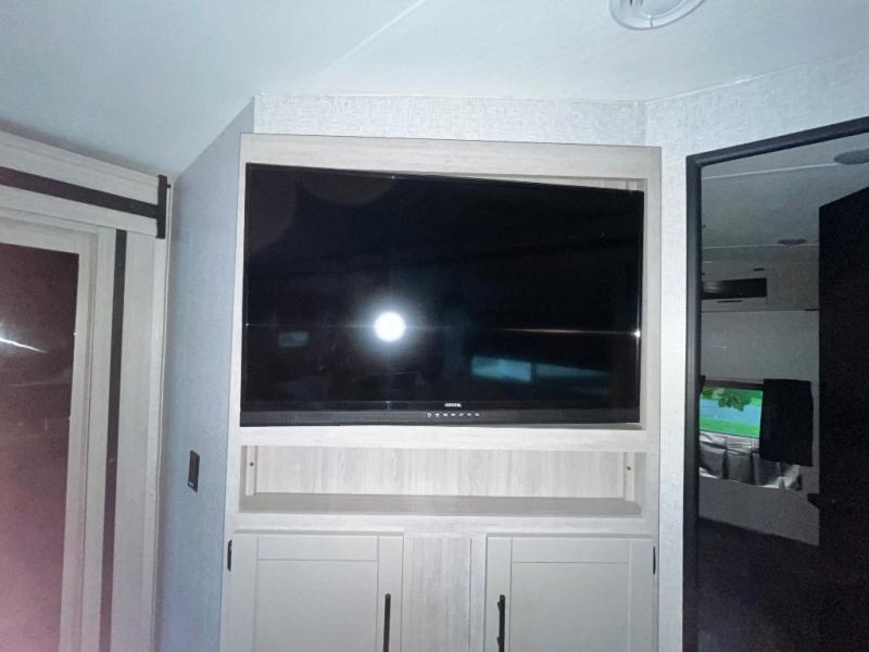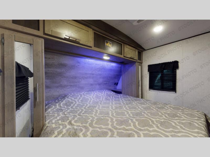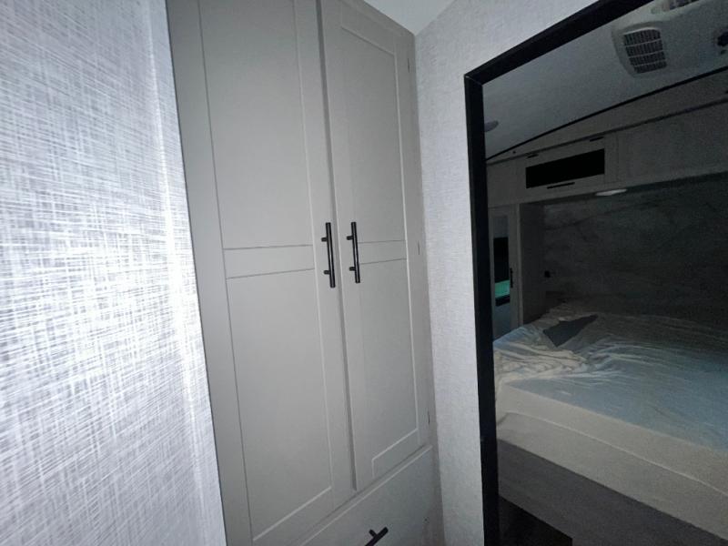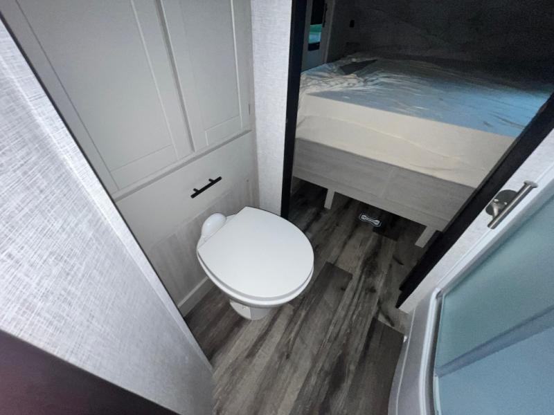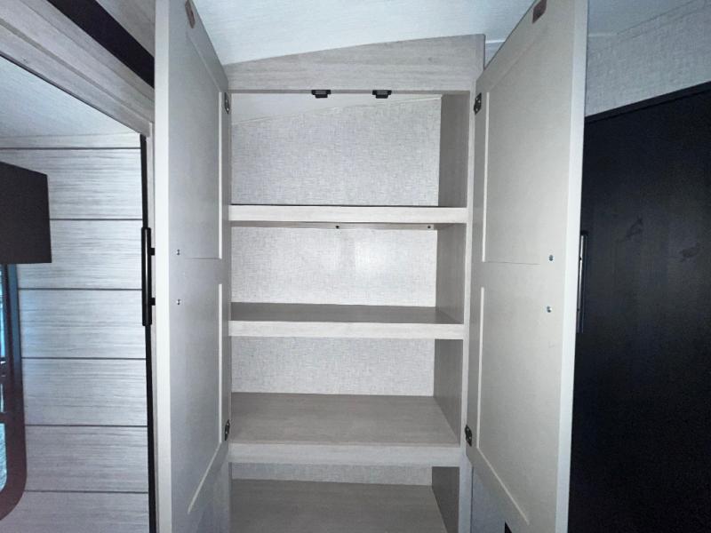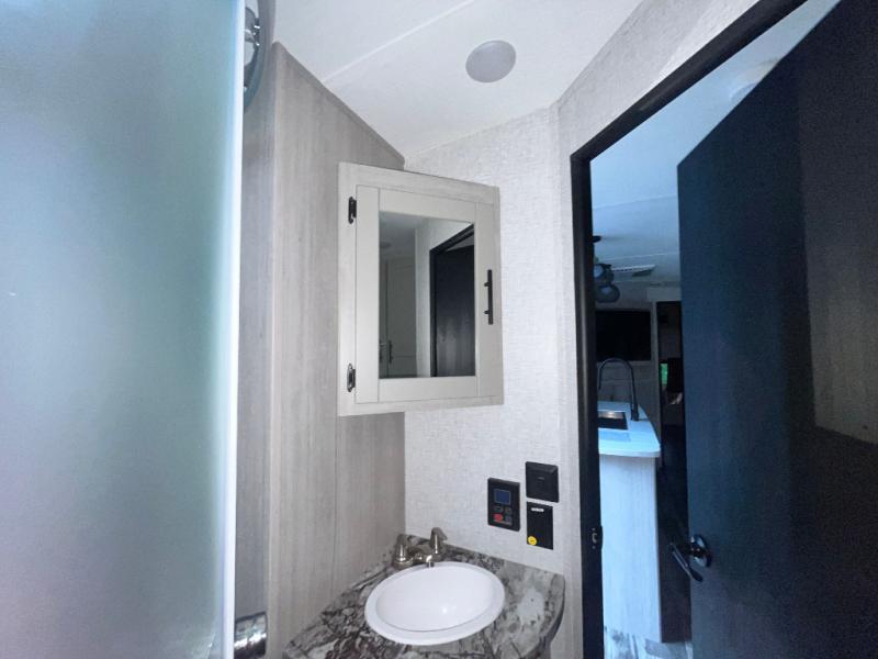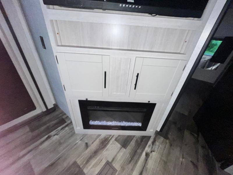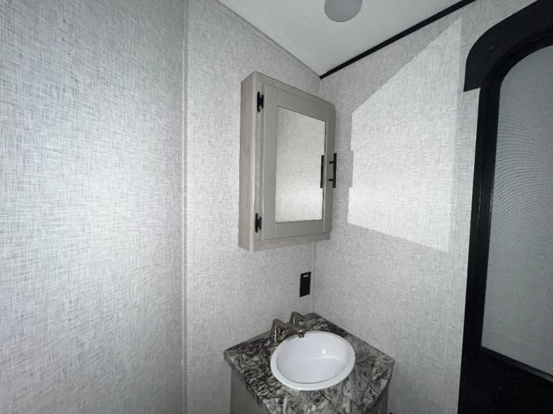This travel trailer is packed with convenient features and luxury comforts for a camping trip you won't soon forget. Once you arrive at the campground, put out the electric awning and make a quick lunch on the exterior camp kitchen. The kitchen island inside will be the perfect place to cut up all the fixings for the burgers and you can grab the chips from the pantry. The kids will love the private bunkhouse that includes two bunks, a jackknife sofa with a kick, plus a dual entry half bath for convenience. The full walk-through bath will create a front master bedroom you are sure to love. Here, the king bed will provide a great night's rest and there are dual wardrobes for all your clothes. Plus there is a convenient shoe storage and pet station for your trusted loyal friends!