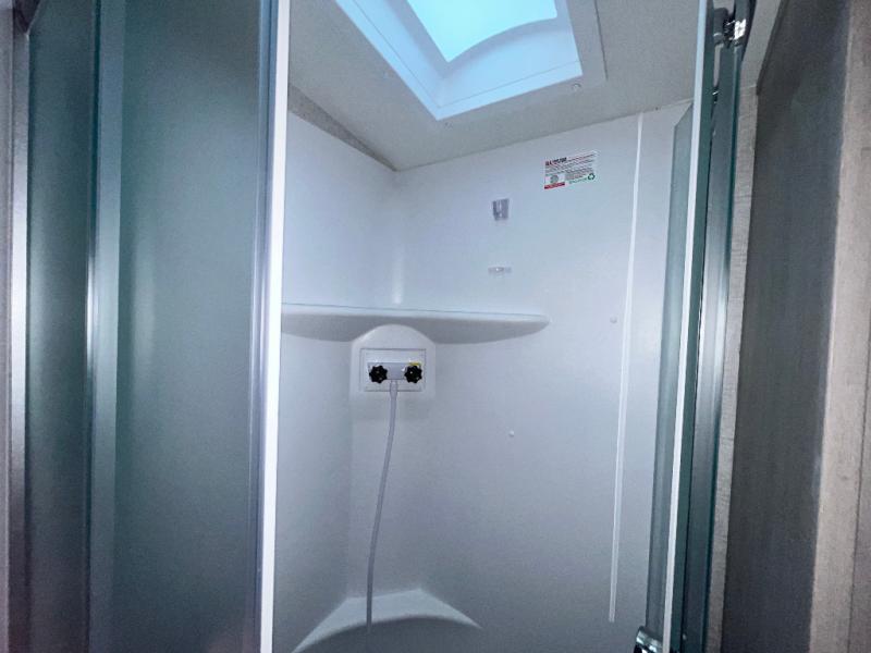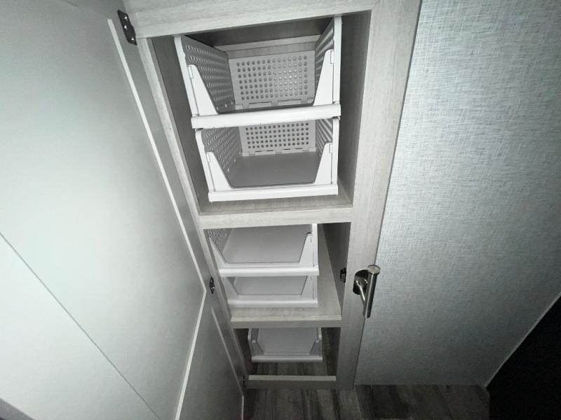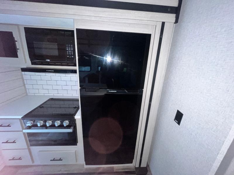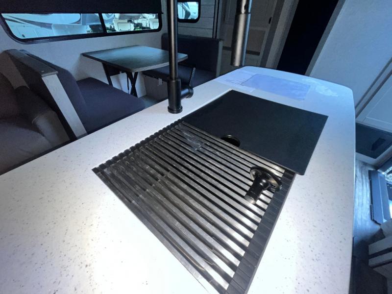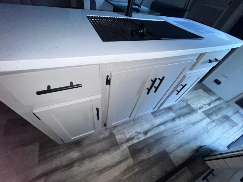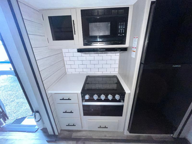 With any Sunset Trail travel trailer by CrossRoads RV, the interior offers a stainless steel farmhouse sink with a cover, solid surface kitchen countertops, and a docking station with 12 Volt, USB Port, and 110 Outlets. Also included is a 13,500 BTU air conditioner plus upgraded insulation with roof and floor reflective foil for added comfort, plus sturdy construction elements like a plywood bed board with strut assist, residential wood window trim, and hardwood cabinet doors. Make your lightweight and comfortable RV decision today!