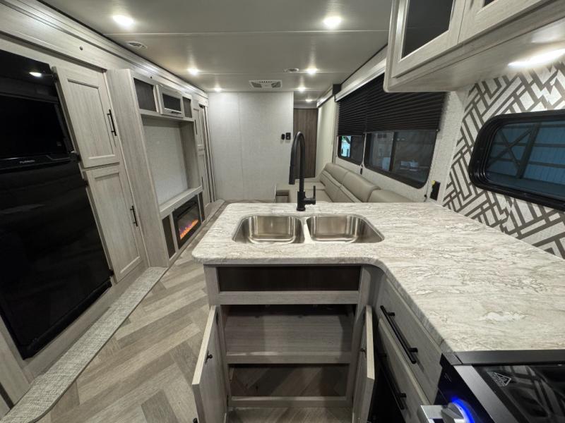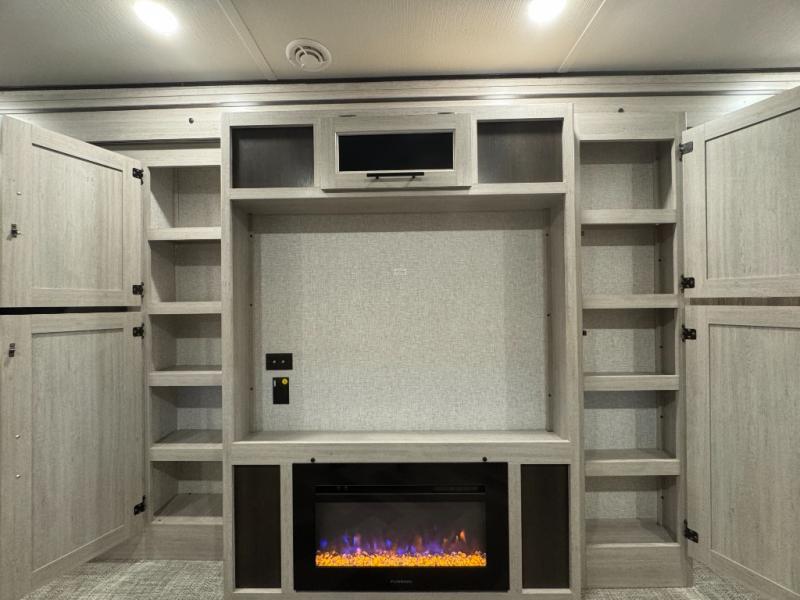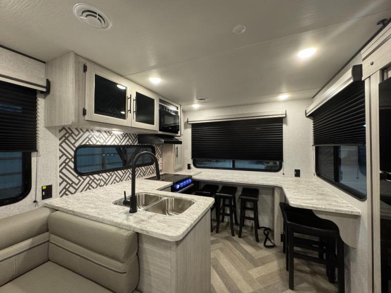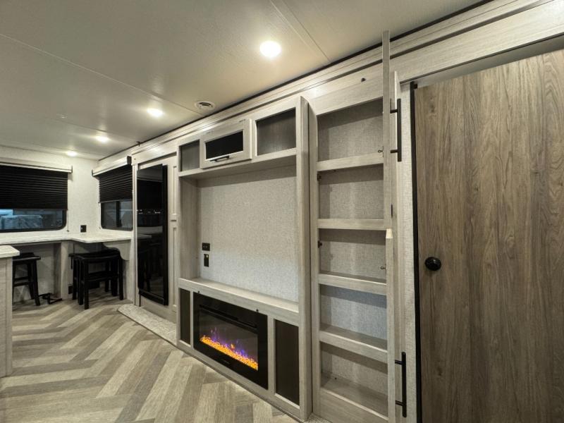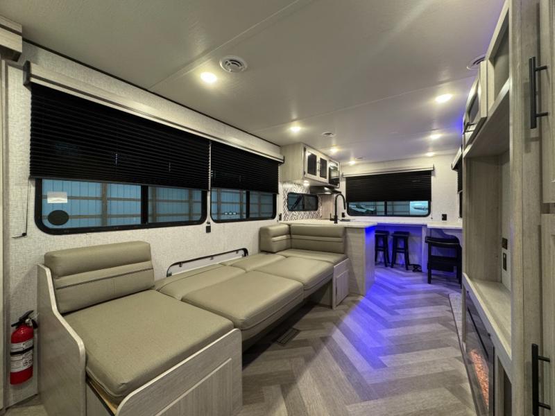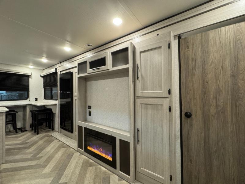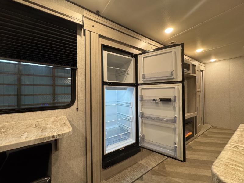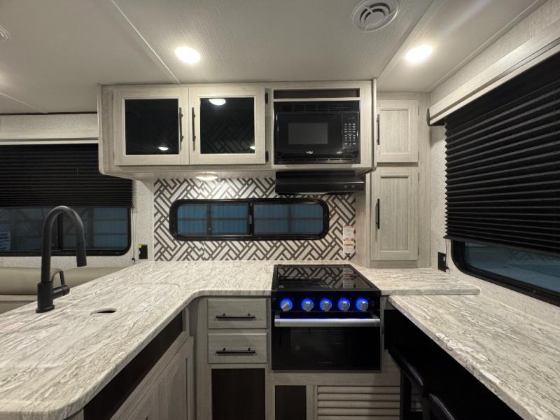 You won't want to camp any other way once you step inside this travel trailer! The rear kitchen has everything you need to prepare your best home cooked meals including two hutches and four bar stools to enjoy your meals at the countertop. You also have an outside kitchen with a refrigerator to enjoy a cold beverage while cooking at the two burner cooktop. After a fun day exploring, you can relax on the 60" jackknife sofa across from the entertainment center with a 50" TV to watch your favorite movies. Behind the entertainment center is a set of 28" x 74" bunk beds next to a desk with a chair for you to get some work done while you're away. The full bathroom has a 30" x 36" shower to freshen up in each morning, and the front private bedroom has a king bed to lay your head on at night, plus a closet that is prepped for a washer and dryer.