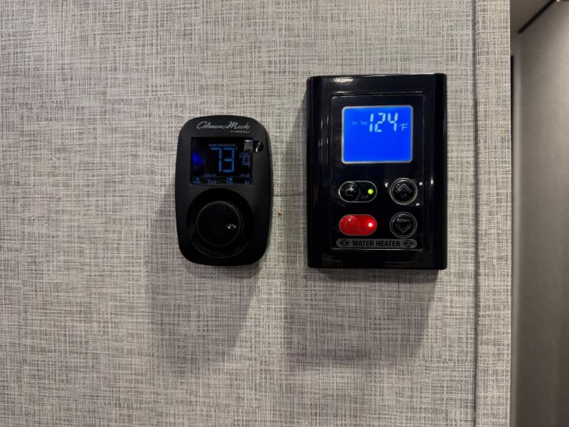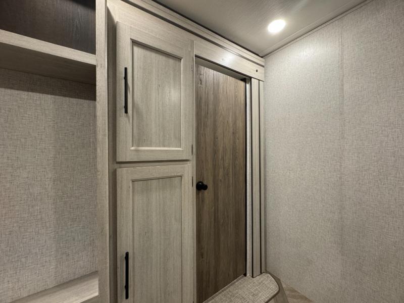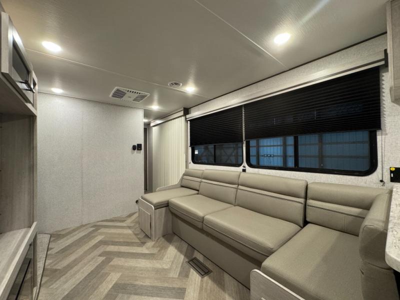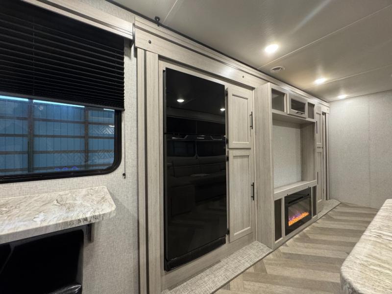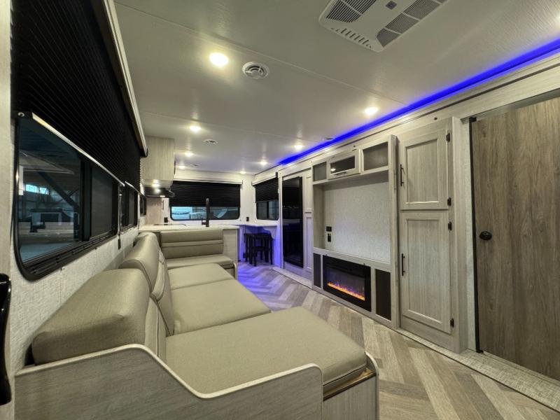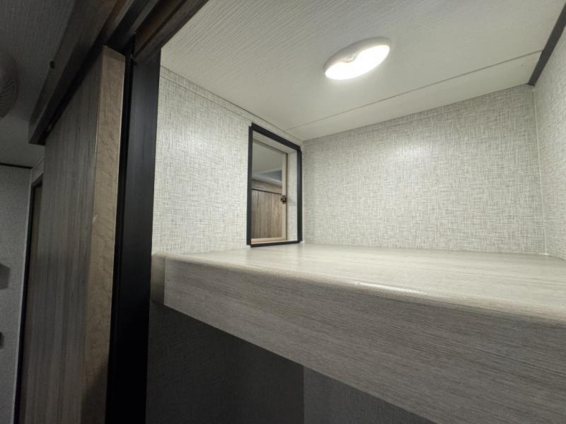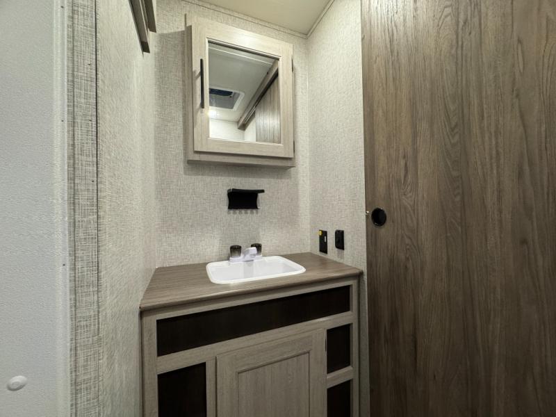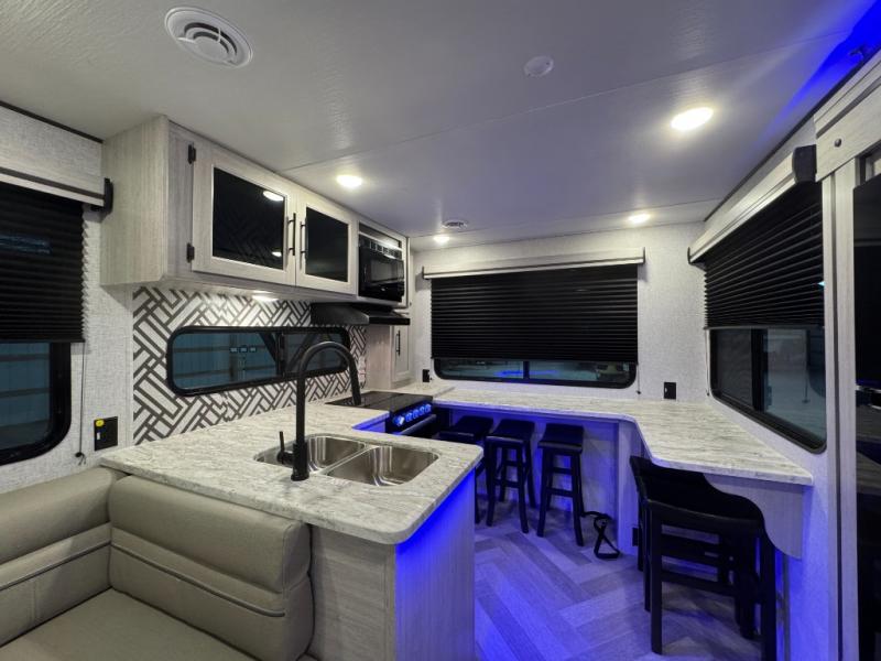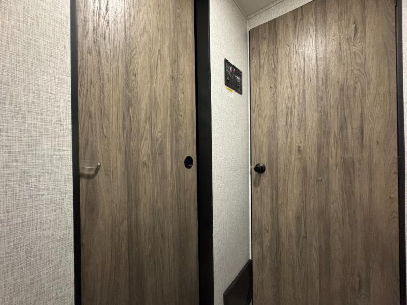 You won't want to camp any other way once you step inside this travel trailer! The rear kitchen has everything you need to prepare your best home cooked meals including two hutches and four bar stools to enjoy your meals at the countertop. You also have an outside kitchen with a refrigerator to enjoy a cold beverage while cooking at the two burner cooktop. After a fun day exploring, you can relax on the 60" jackknife sofa across from the entertainment center with a 50" TV to watch your favorite movies. Behind the entertainment center is a set of 28" x 74" bunk beds next to a desk with a chair for you to get some work done while you're away. The full bathroom has a 30" x 36" shower to freshen up in each morning, and the front private bedroom has a king bed to lay your head on at night, plus a closet that is prepped for a washer and dryer.