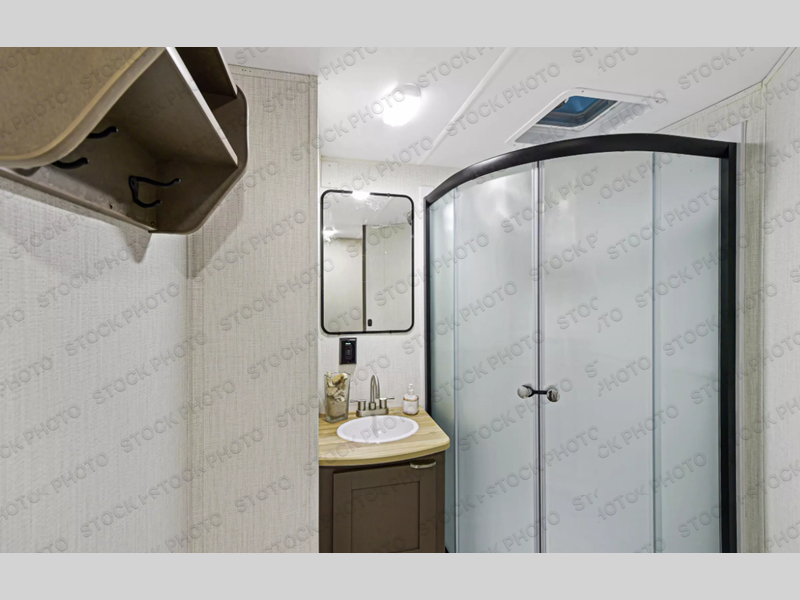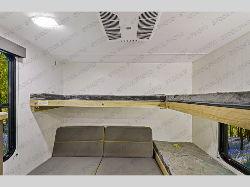 The largest of the Avenir line offers sleeping for a large group with a private bunkhouse in back featuring a bunk over a jackknife sofa and a second set of bunks sleeping five total in this space. There is also a dresser for storage opposite the sofa with TV prep above it. In the main combined kitchen and living room you will enjoy added space thanks to a large slide out 42" x 76" booth dinette and Lux Lounge which can both be converted to extra sleeping space if needed. An angled interior wall from the bathroom is where you will view the fireplace. Opposite the slide is your kitchen area where you can easily create meals and snacks just like home. You will find a large pantry, refrigerator, three burner cooktop and large sink for cleaning up. There is also a microwave oven and overhead storage for all of your dishes. An outside refrigerator under the 18' awning allows you to keep drinks and cold snacks readily available when spending time outside. A full bath with radius shower will keep everyone feeling clean and fresh, and the private front bedroom offers a queen bed, dual nightstands and storage with a full pass-through on the outside beneath the head of the bed for all of your outdoor gear.