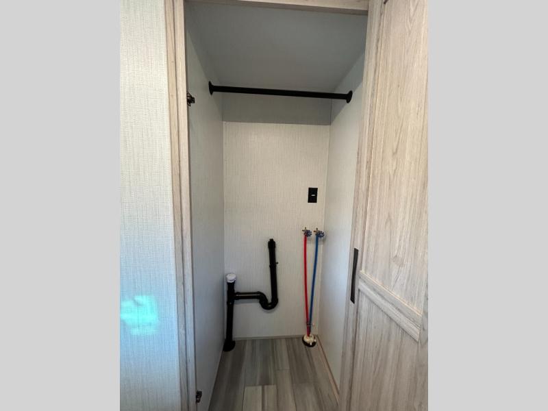You and your spouse will have a great time camping in this fifth wheel! The front private bedroom has a pillowtop queen bed with under bed storage and an area prepped for a washer and dryer so you could have clean clothes throughout your entire trip. Freshen up each morning in the full bathroom with the upgraded shower surround then head to the fully equipped kitchen to whip up some eggs on the three burner cooktop and enjoy a cold cup of orange juice stored in the 16.2 cu. ft. 12V four door refrigerator. You even have an air fryer oven for quick meals and an outside refrigerator to enjoy a cold beverage while relaxing under the 16' awning. Your meals can be eaten at the 42" booth dinette and your belly can settle as you relax in the theater seating across from the overhead TV above the dinette!