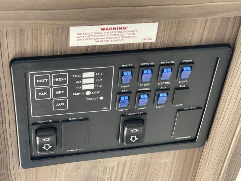Step into this rear kitchen travel trailer for fun in the great outdoors. You will love the amount of counter space you have, plus there is a booth dinette for dining and hanging out. The large slide out opposite provides more floor space, a sofa, a walk-in pantry and refrigerator for your perishables. The front private bedroom will feel just like home with its dual wardrobes, a dresser/wardrobe, plus a sliding king bed for more space to get dressed each morning. And don't forget to relax outside under the 20' awning with LED light, and utilize the outdoor refrigerator and griddle when feeding a crew.