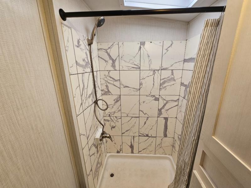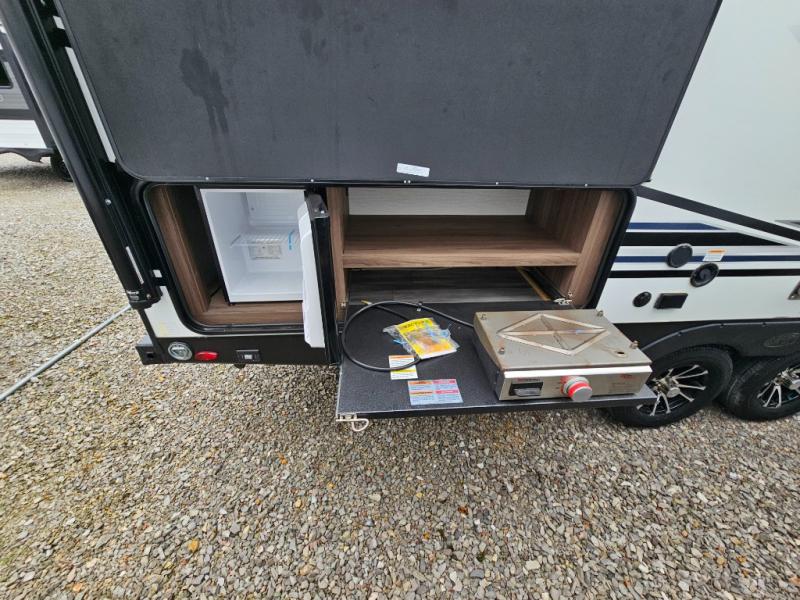 Double bed bunks, an outside kitchen, one large slide for added roominess, and a private front bedroom makes this a great choice for your larger family. The rear corner bathroom offers privacy and is located near the bunks for quick access at night for little ones. The opposite rear corner features double bed bunks so let everyone bring along a friend since you can also convert the u-shaped dinette for added sleeping within the slide. A full chef kitchen inside, and an outside kitchen offers you options when it comes to cooking and dining. You will love the air fryer oven, solid surface countertops, and 10 cu. ft. stainless steel refrigerator. When you're ready to wind down your nights, head to the front private bedroom with dual entry doors, one on either side of the entertainment center, for a good night's rest on a king-size sliding bed with a true Serta Comfort mattress!
