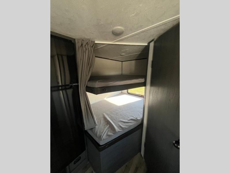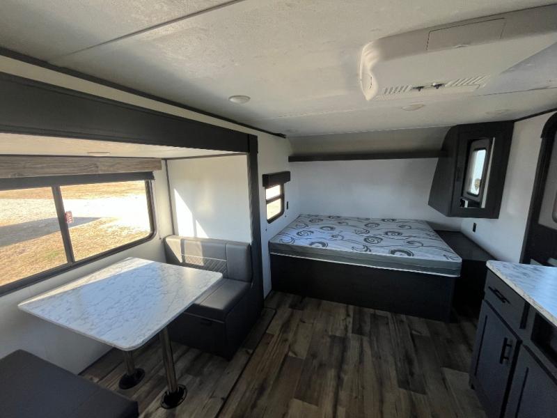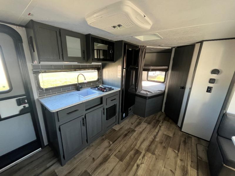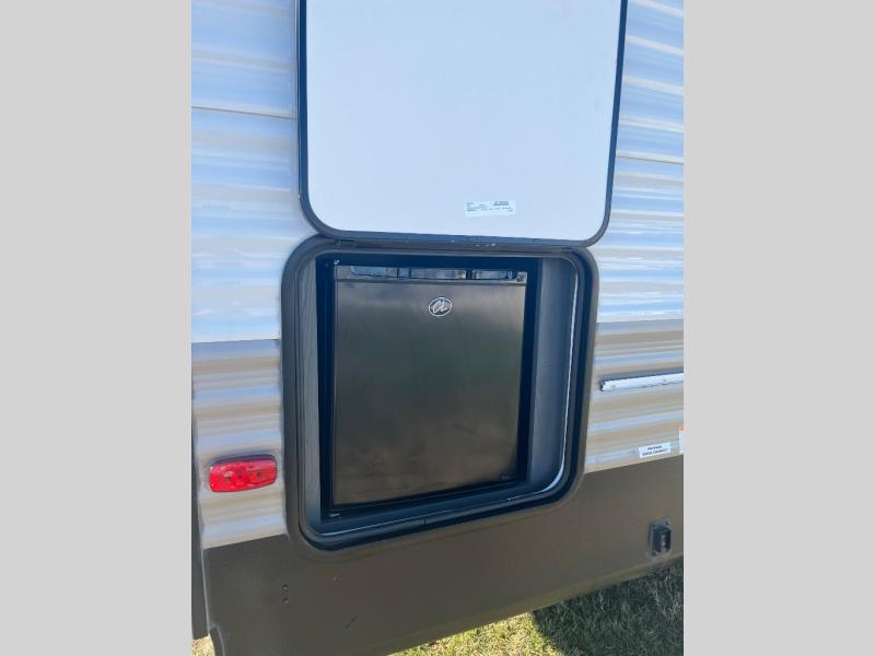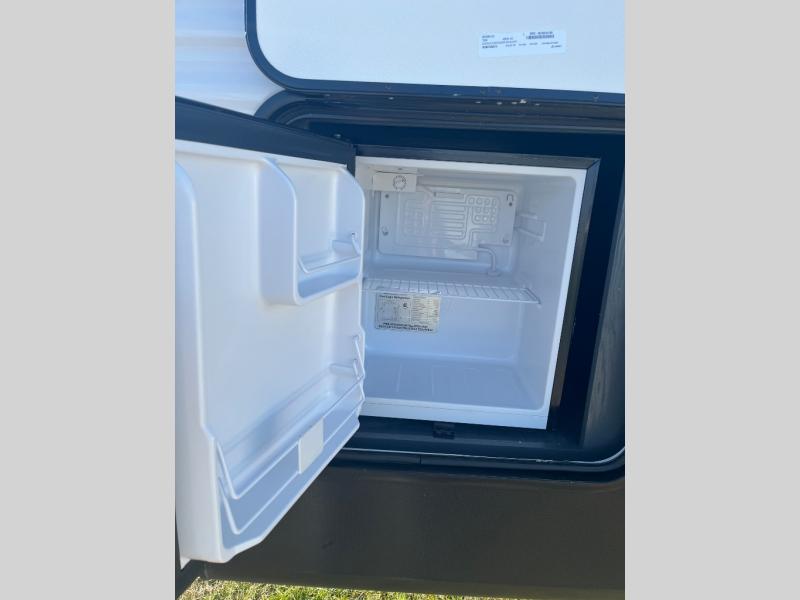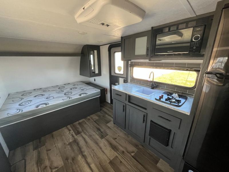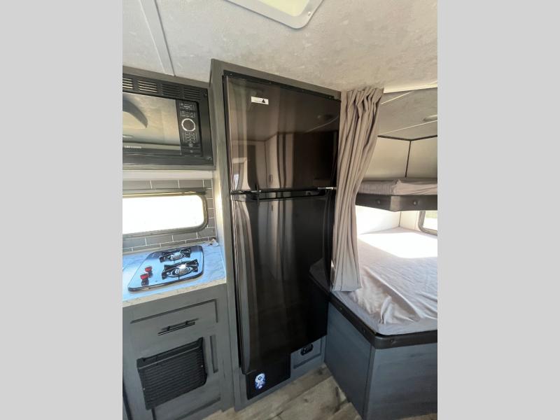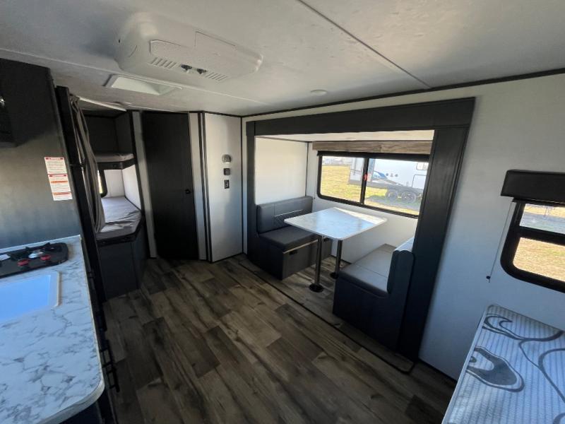 If you need space for seven or eight travelers, this Aspen Trail Mini might be it for you! There is a set of bunks in the rear curbside corner. Beneath this on the outside you will find an outdoor refrigerator that is perfect for drinks and snacks. A single slide features a booth dinette for all to enjoy meals and games at, and you will appreciate the added interior space inside as well. Up front, a queen bed with side closet at the foot of the bed, plus an overhead shelf across the front of the unit for your things. Along the curbside, your inside kitchen featuring a 10 cu. ft. 12V refrigerator, microwave oven, two-burner cooktop, and sink, plus overhead storage for your dishes and things. An outside 10' awning offers protection from the elements and also creates another outdoor living space for you to place camp chairs and a table, plus more.
