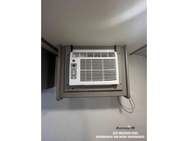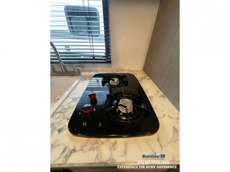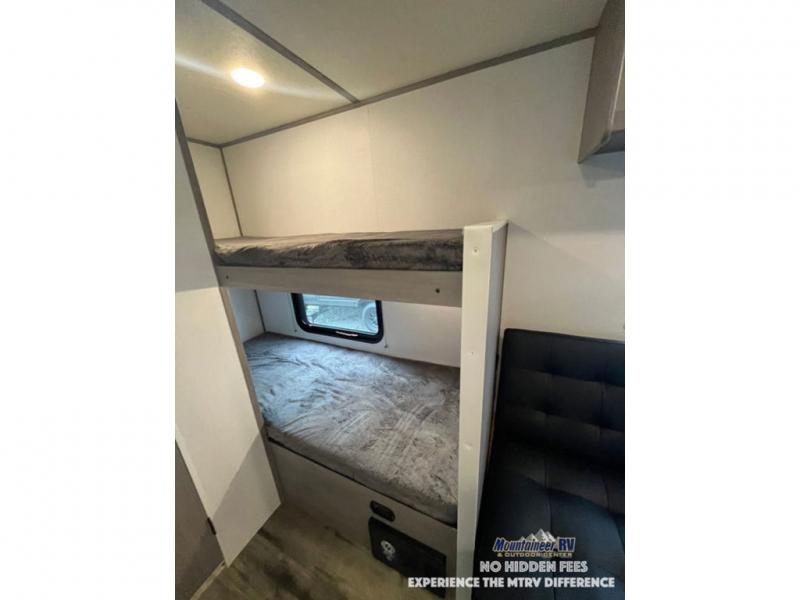 After making dinner on the two burner cooktop or inside the microwave, you can dine at the booth dinette or outside under the 8' power awning if you brought along your camping chairs. Either way you will be comfortable and the dinette may even sleep one person if needed. After playing outdoors all day, everyone can return to get cleaned up in the private bath with a shower and toilet, then fall asleep on the queen bed up front or the bunk beds in the rear corner.