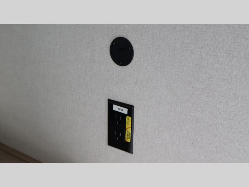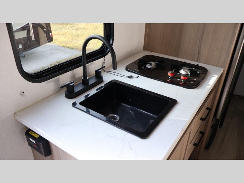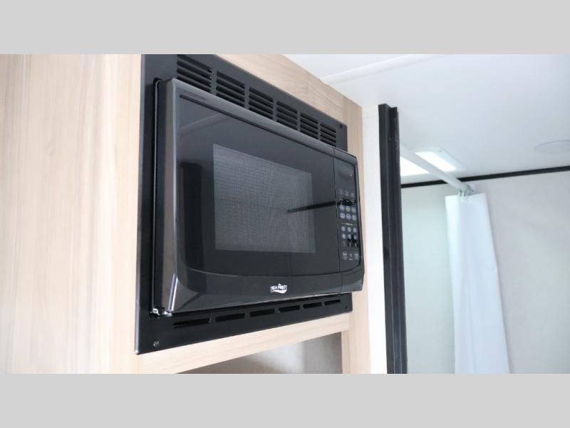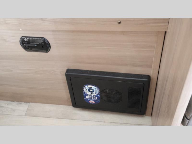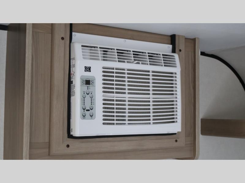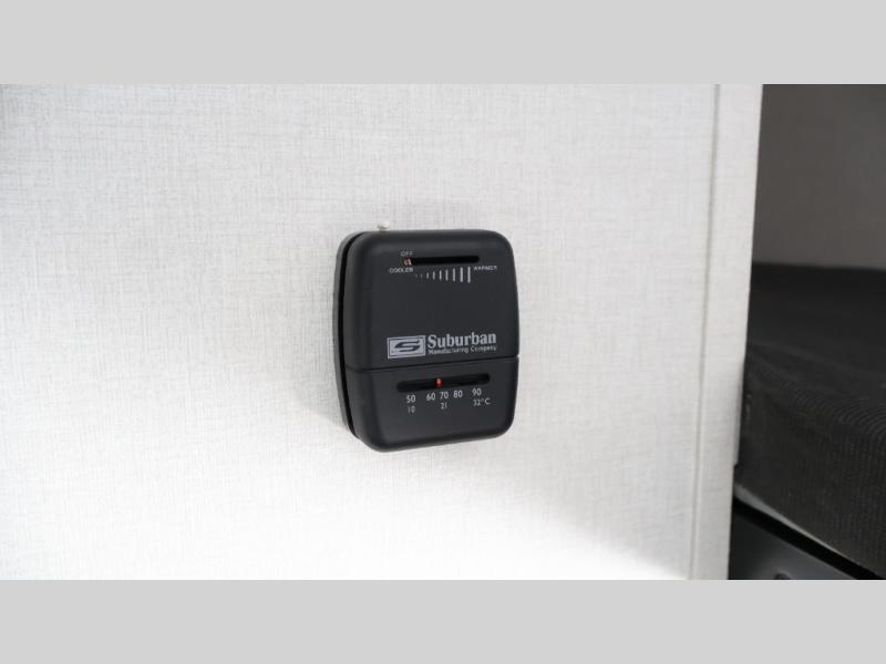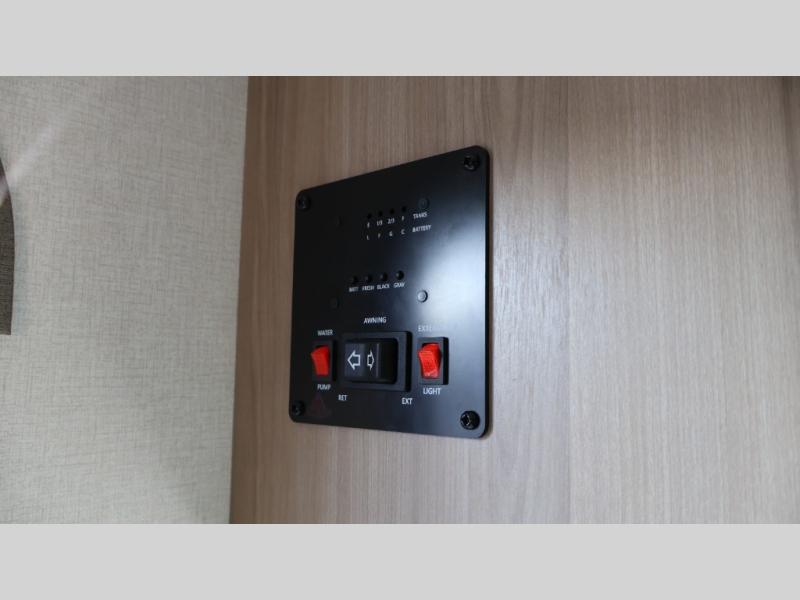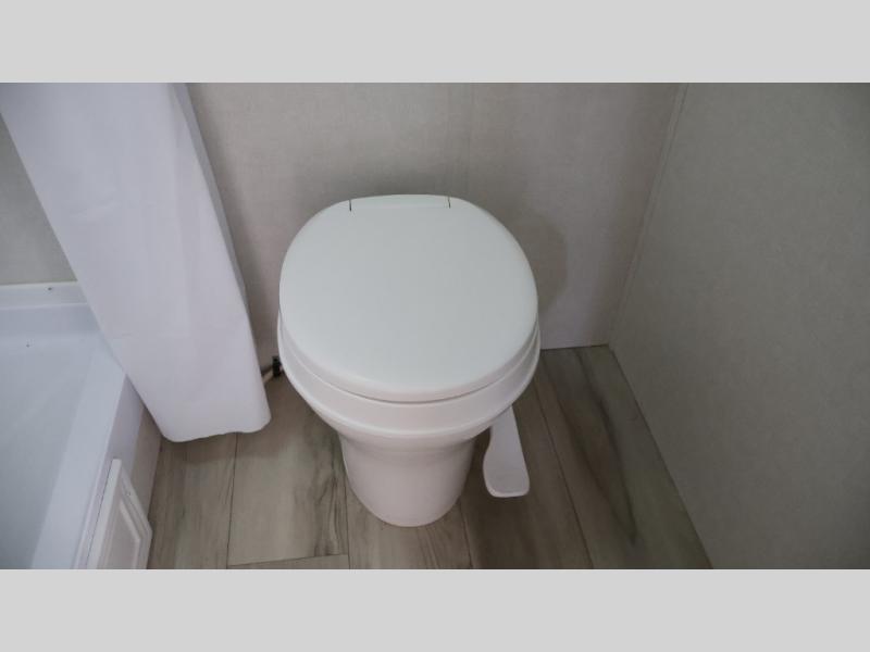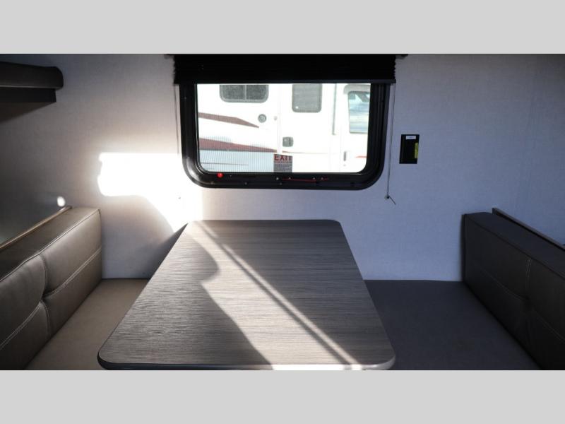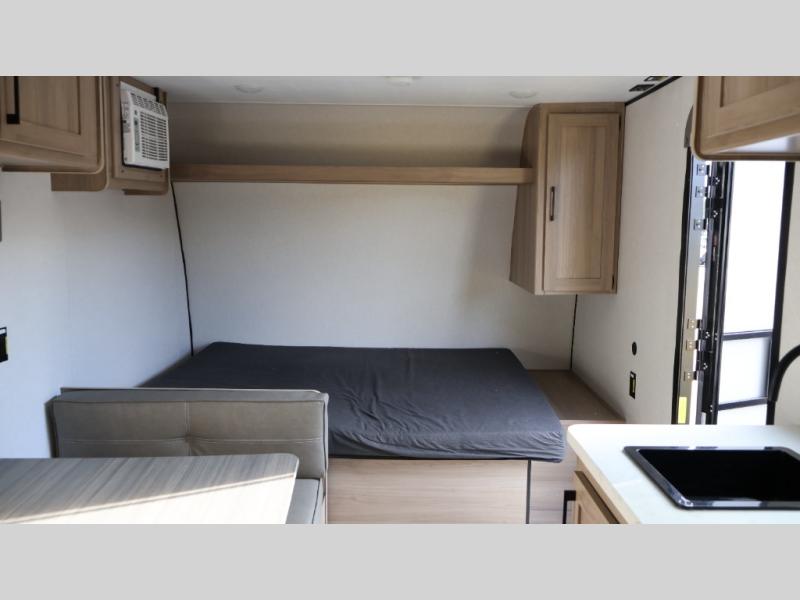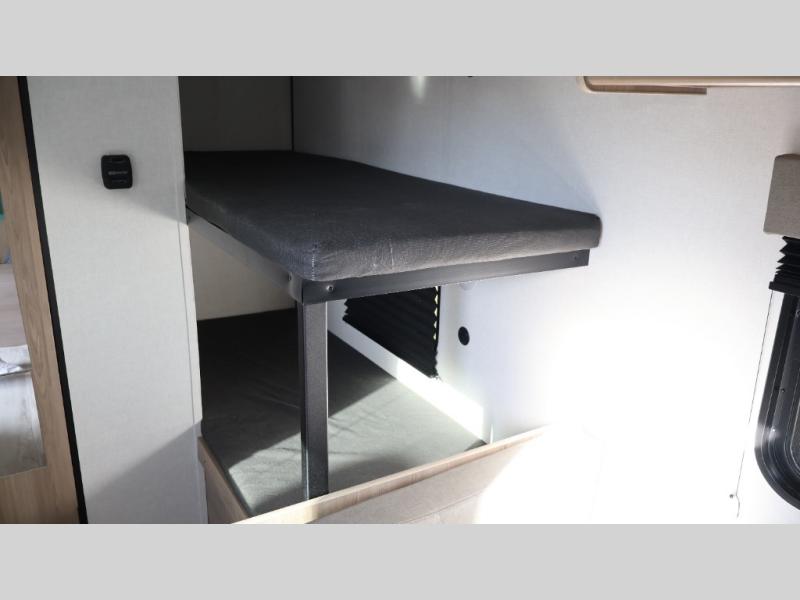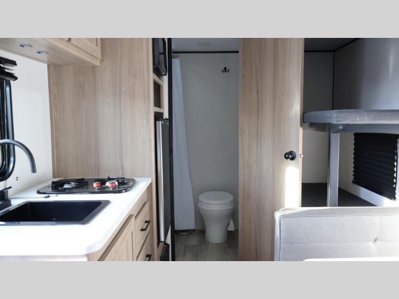 After making dinner on the two burner cooktop or inside the microwave, you can dine at the booth dinette or outside under the 8' power awning if you brought along your camping chairs. Either way you will be comfortable and the dinette may even sleep one person if needed. After playing outdoors all day, everyone can return to get cleaned up in the private bath with a shower and toilet, then fall asleep on the queen bed up front or the bunk beds in the rear corner.