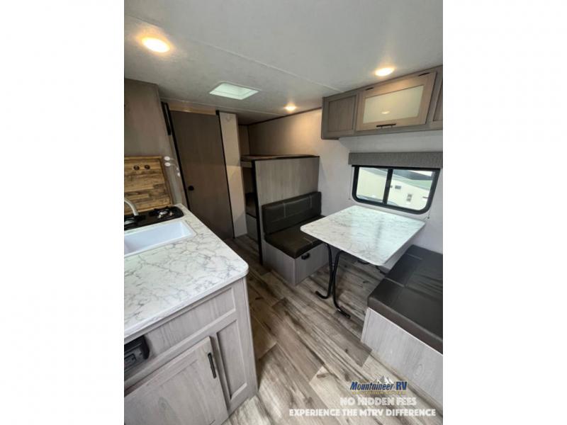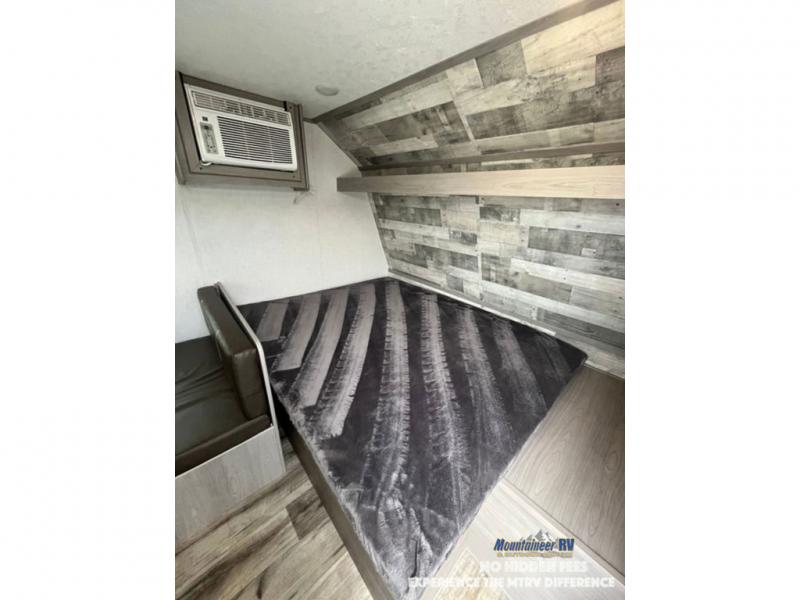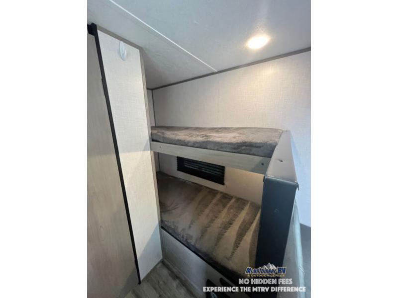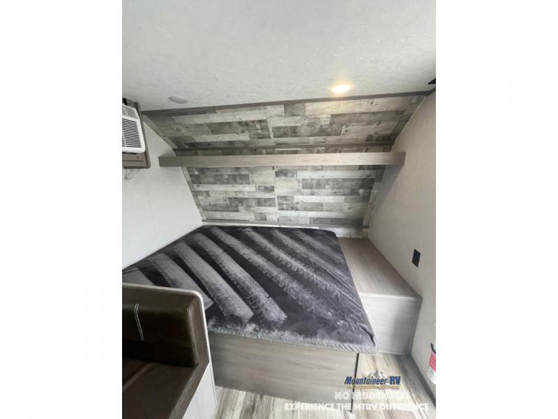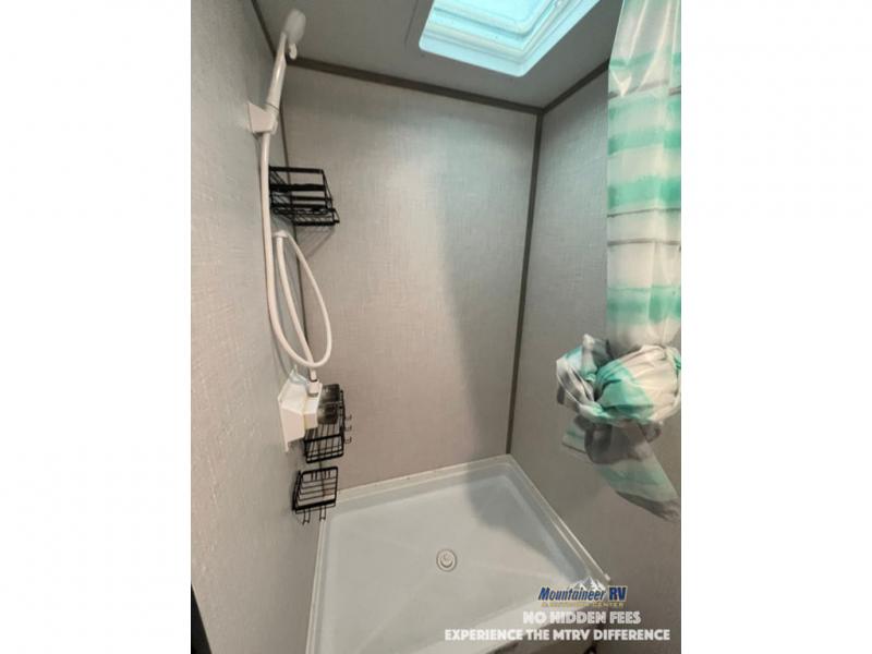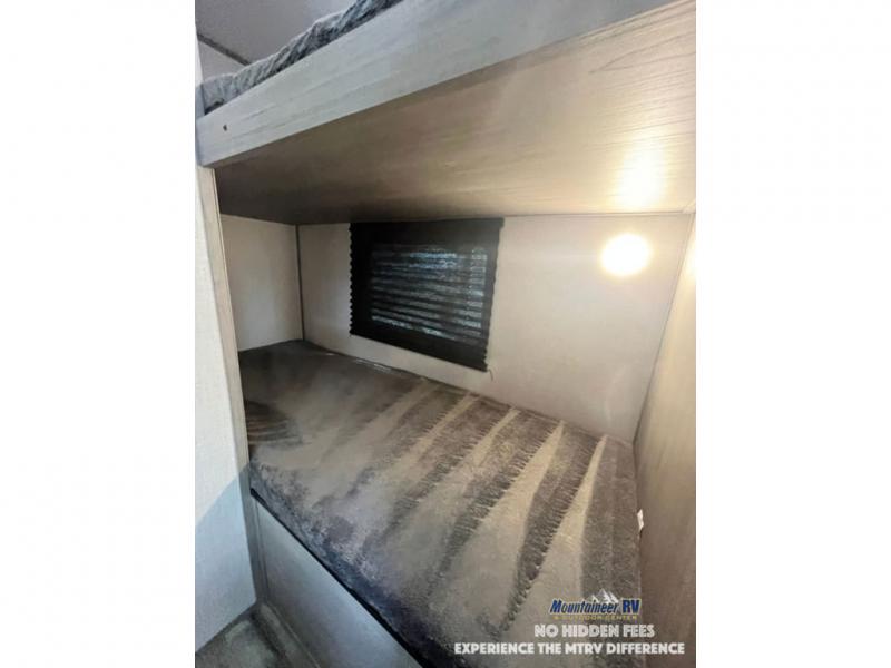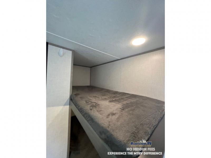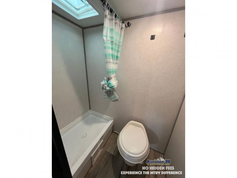 After making dinner on the two burner cooktop or inside the microwave, you can dine at the booth dinette or outside under the 8' power awning if you brought along your camping chairs. Either way you will be comfortable and the dinette may even sleep one person if needed. After playing outdoors all day, everyone can return to get cleaned up in the private bath with a shower and toilet, then fall asleep on the queen bed up front or the bunk beds in the rear corner.