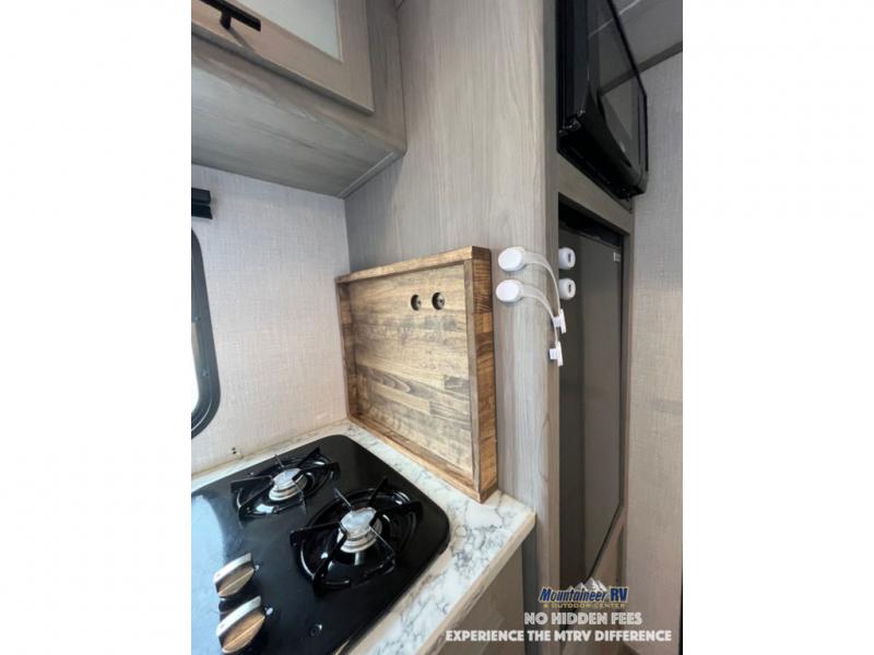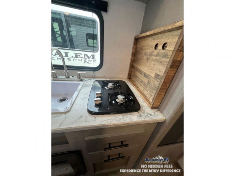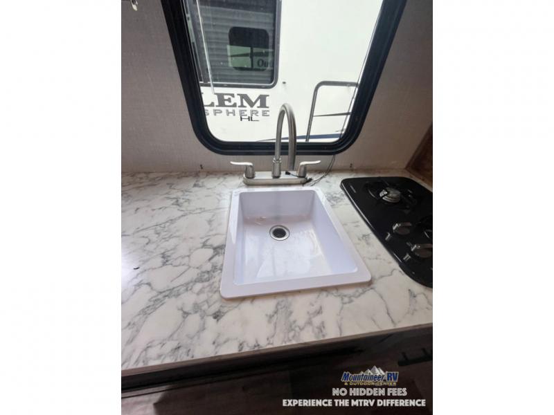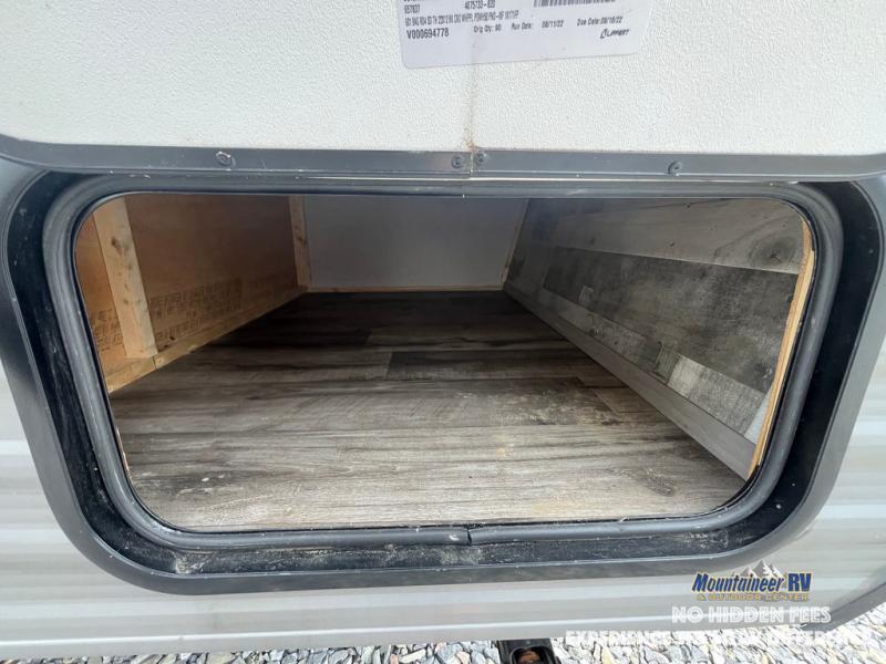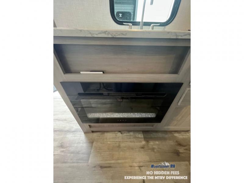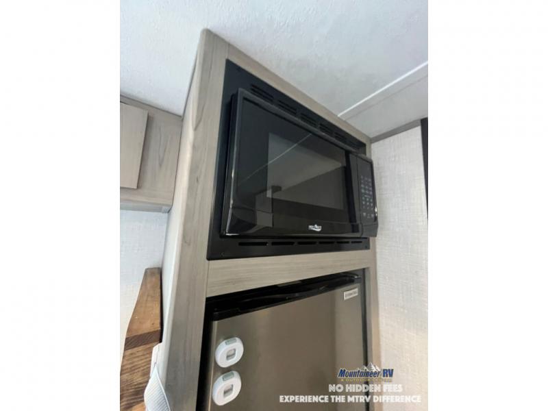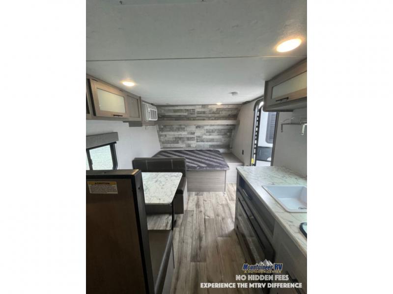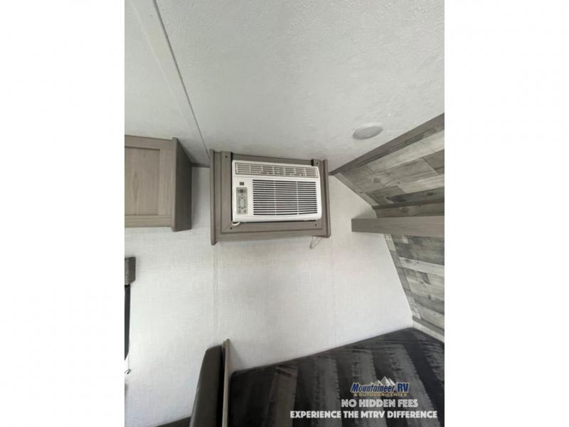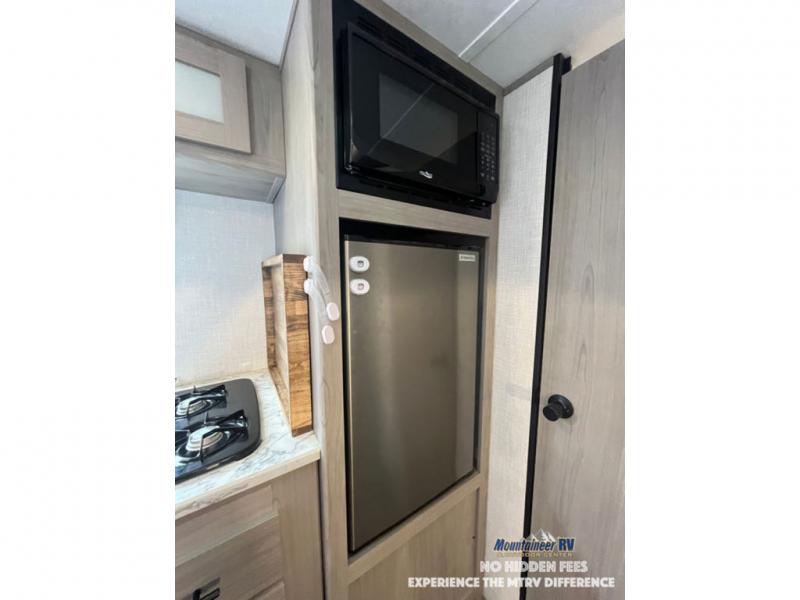 After making dinner on the two burner cooktop or inside the microwave, you can dine at the booth dinette or outside under the 8' power awning if you brought along your camping chairs. Either way you will be comfortable and the dinette may even sleep one person if needed. After playing outdoors all day, everyone can return to get cleaned up in the private bath with a shower and toilet, then fall asleep on the queen bed up front or the bunk beds in the rear corner.