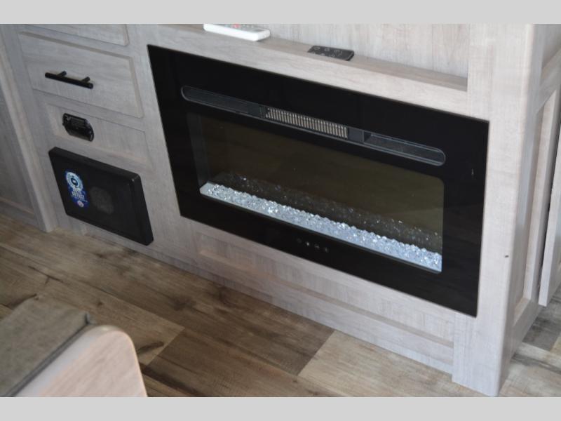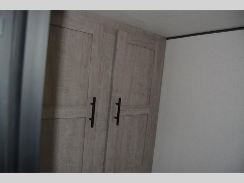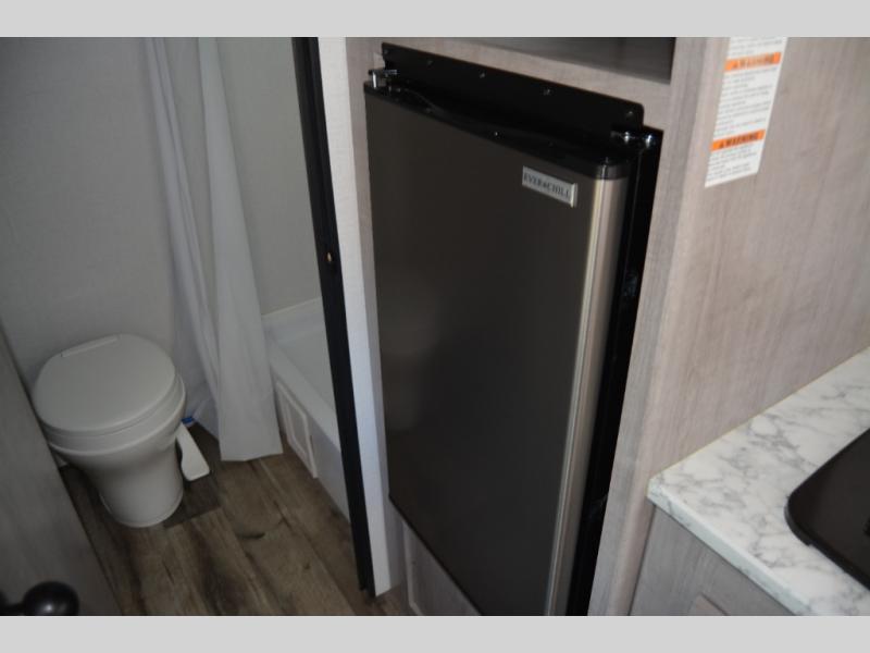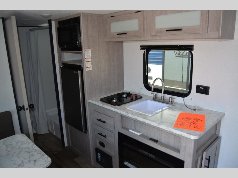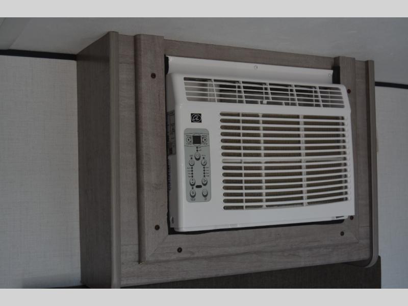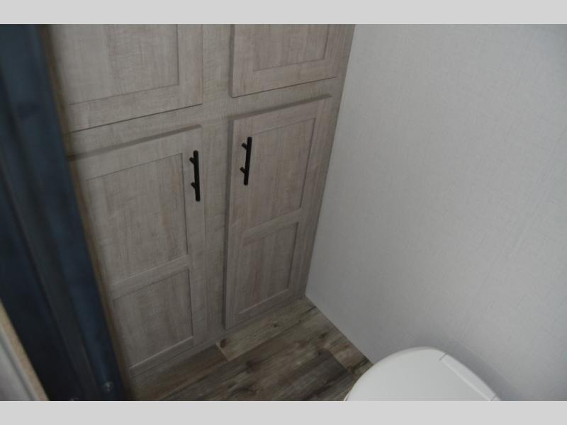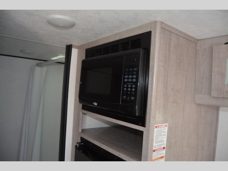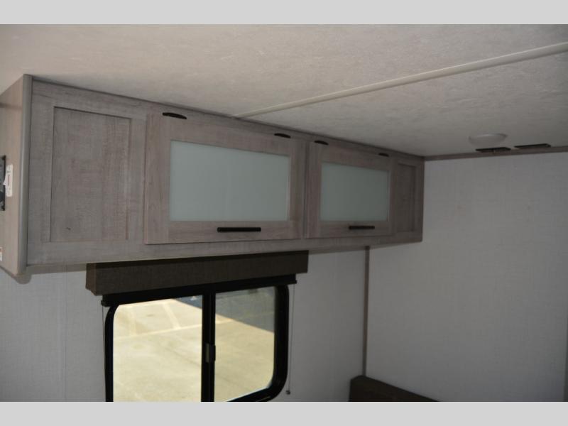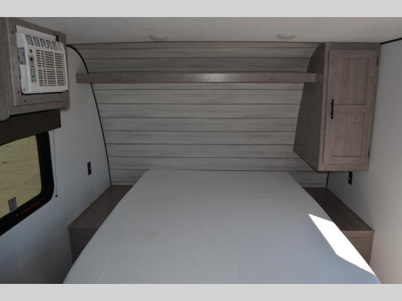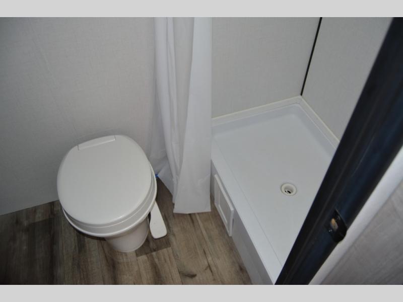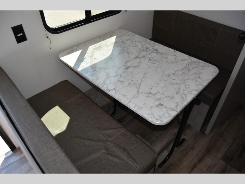 After making dinner on the two burner cooktop or microwave, you can dine at the booth dinette or outside under the power awning if you brought along your camping chairs. Either way you will be comfortable and the dinette can even be converted to sleep one person if needed. After playing outdoors all day, everyone can return to get cleaned up in the full rear bath including a walk-in shower. There is even a linen closet and space for some clothes that hang. You will get a great night's rest on the front queen bed, and the booth dinette can double as sleeping space for an extra guest or two!