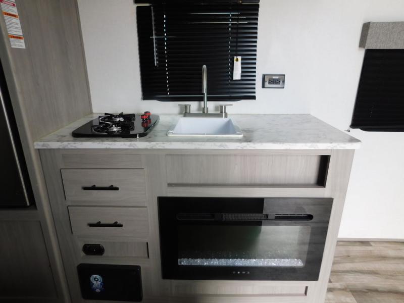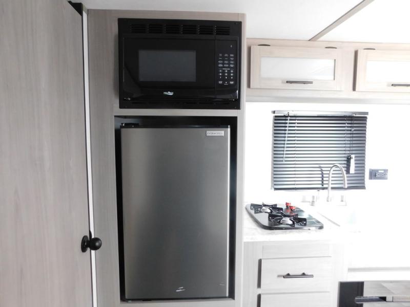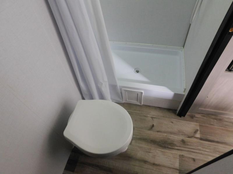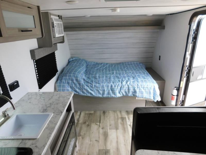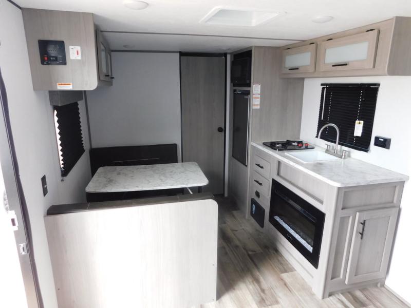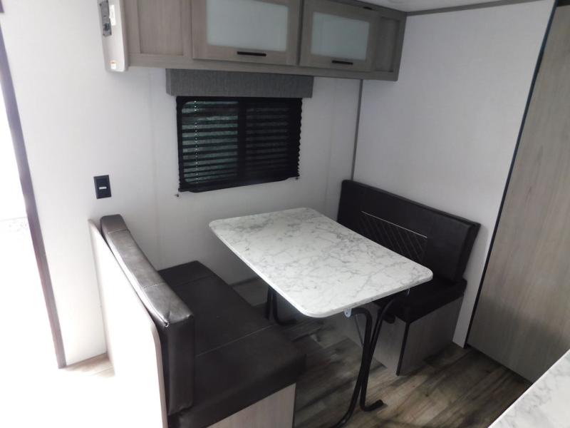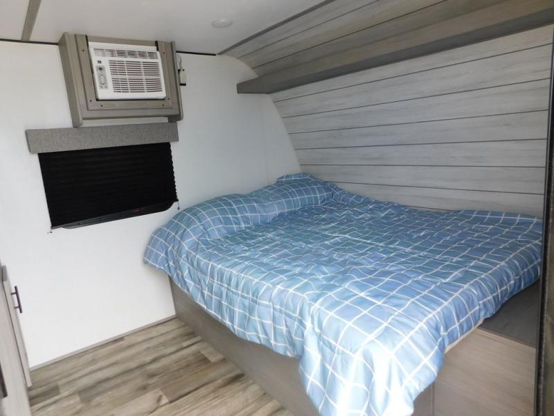 After making dinner on the two burner cooktop or microwave, you can dine at the booth dinette or outside under the power awning if you brought along your camping chairs. Either way you will be comfortable and the dinette can even be converted to sleep one person if needed. After playing outdoors all day, everyone can return to get cleaned up in the full rear bath including a walk-in shower. There is even a linen closet and space for some clothes that hang. You will get a great night's rest on the front queen bed, and the booth dinette can double as sleeping space for an extra guest or two!