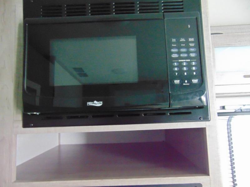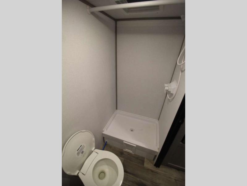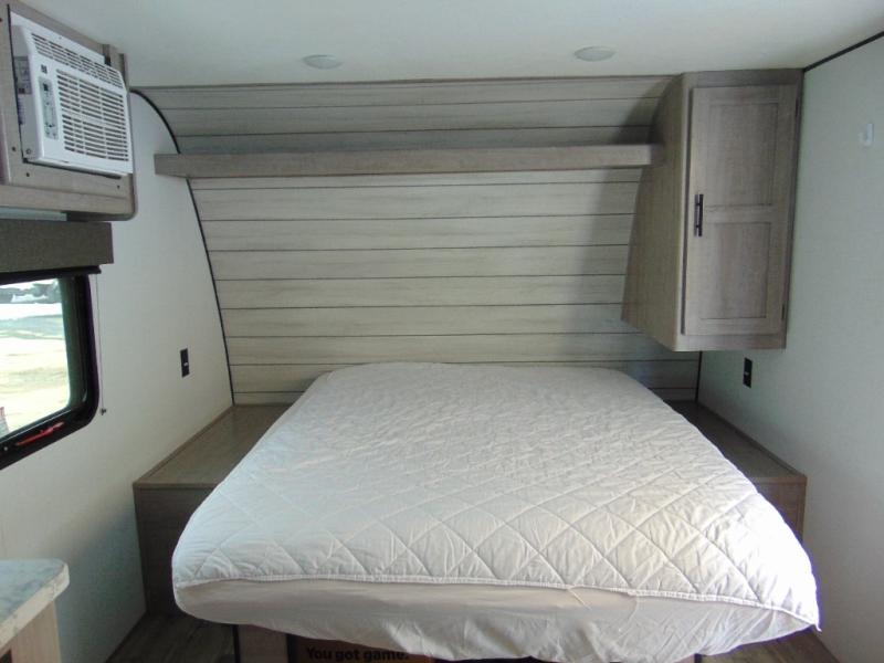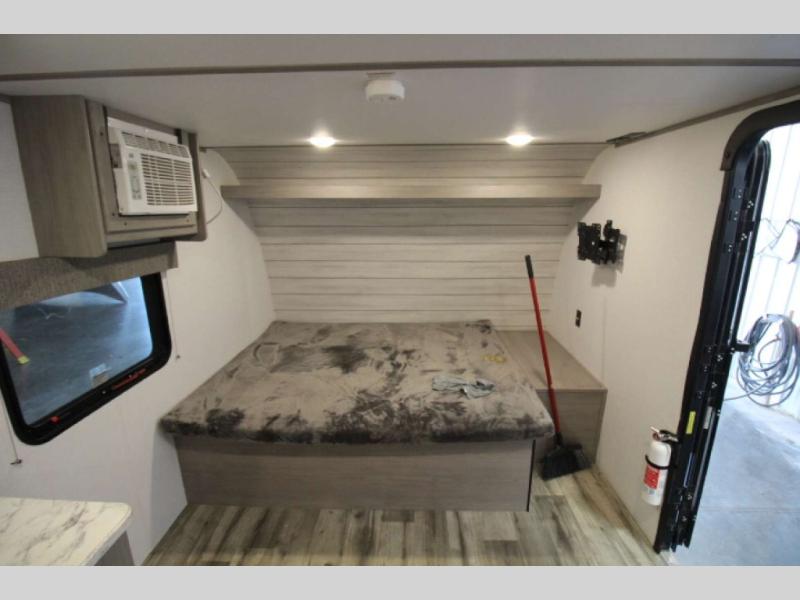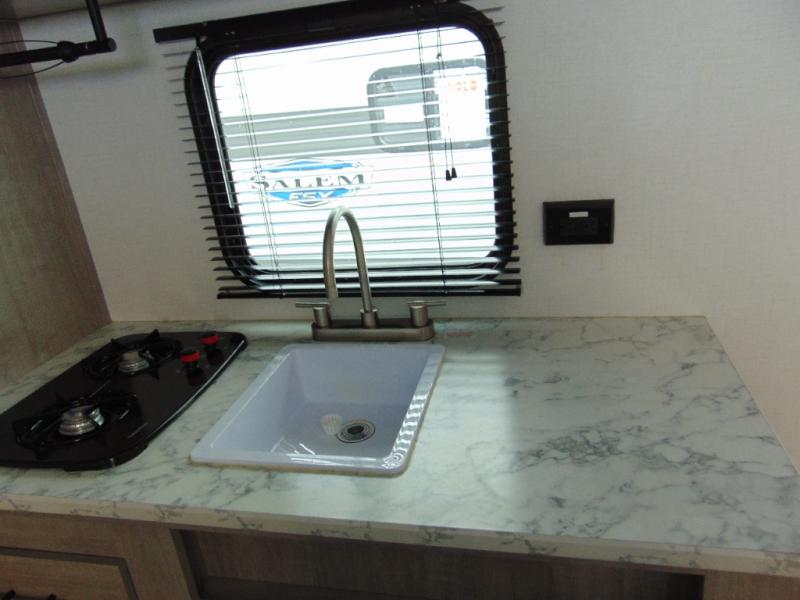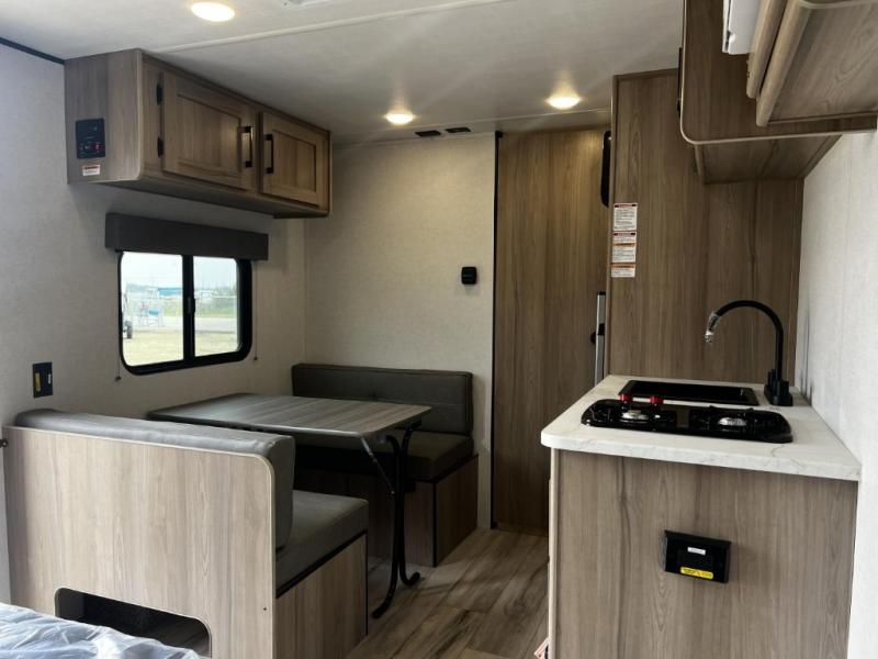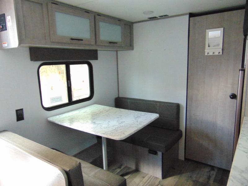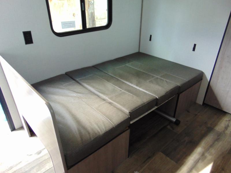 After making dinner on the two burner cooktop or microwave, you can dine at the booth dinette or outside under the power awning if you brought along your camping chairs. Either way you will be comfortable and the dinette can even be converted to sleep one person if needed. After playing outdoors all day, everyone can return to get cleaned up in the full rear bath including a walk-in shower. There is even a linen closet and space for some clothes that hang. You will get a great night's rest on the front queen bed, and the booth dinette can double as sleeping space for an extra guest or two!
