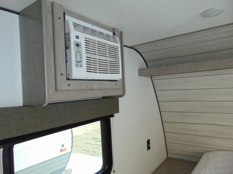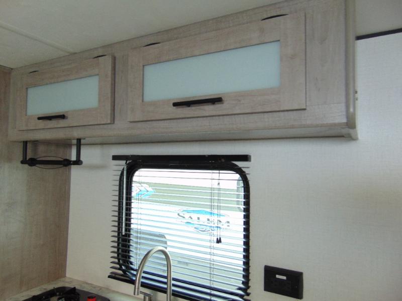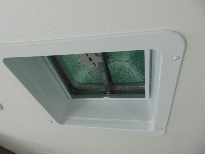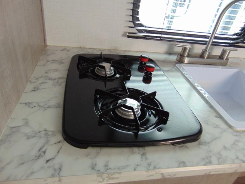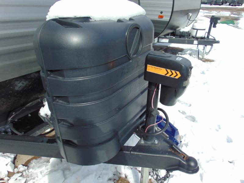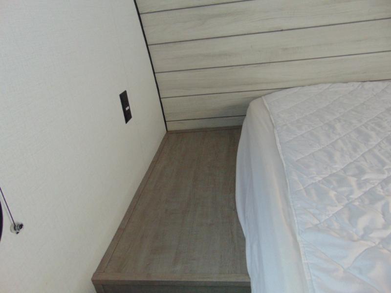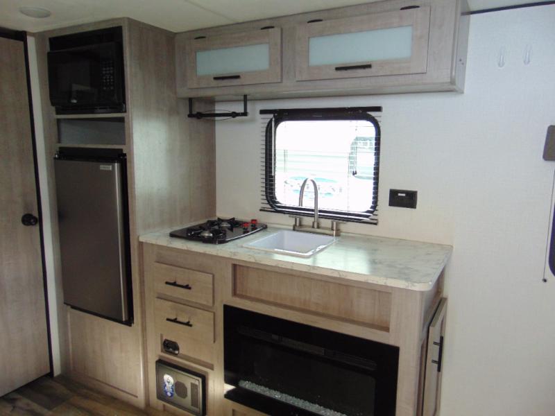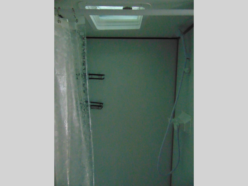 After making dinner on the two burner cooktop or microwave, you can dine at the booth dinette or outside under the power awning if you brought along your camping chairs. Either way you will be comfortable and the dinette can even be converted to sleep one person if needed. After playing outdoors all day, everyone can return to get cleaned up in the full rear bath including a walk-in shower. There is even a linen closet and space for some clothes that hang. You will get a great night's rest on the front queen bed, and the booth dinette can double as sleeping space for an extra guest or two!