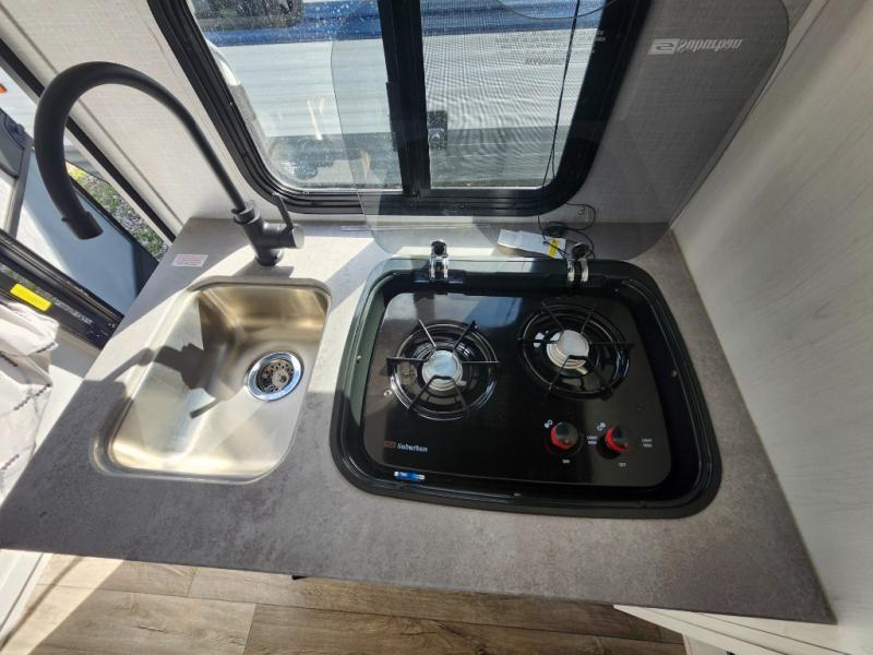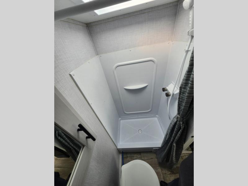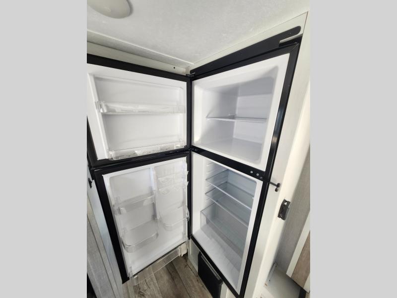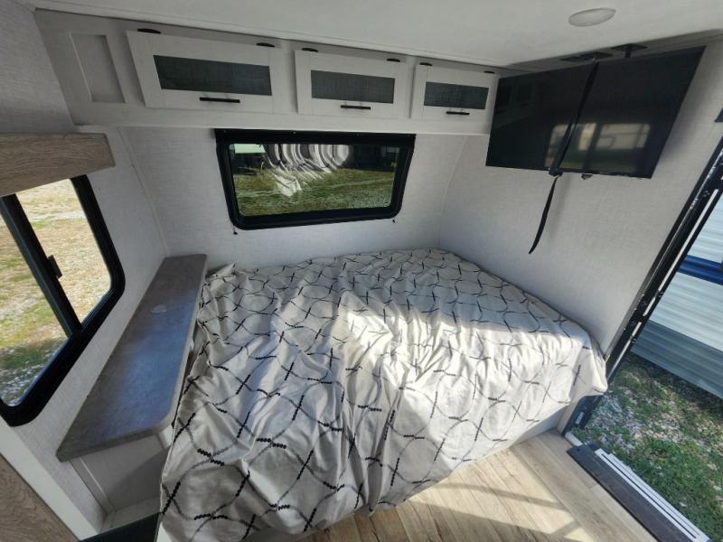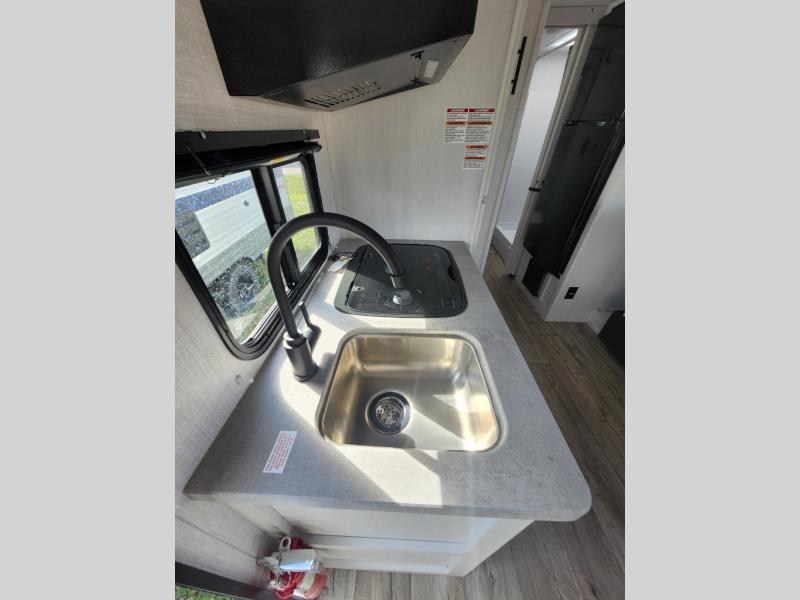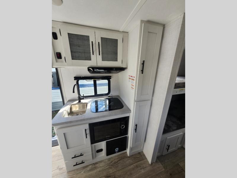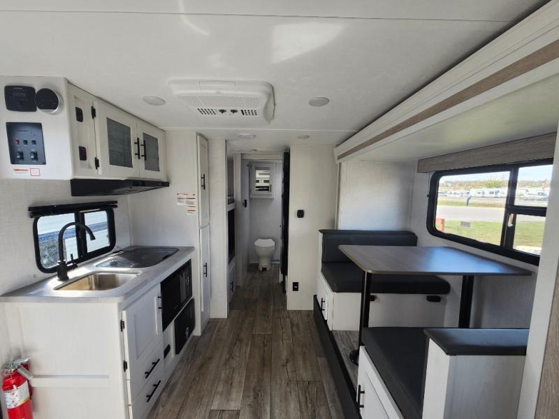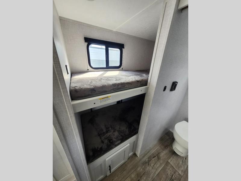 With a set of bunk beds, the whole family or friend gang can camp together in this travel trailer! And you will appreciate having a front queen bed to lay your head on at night. The two burner range is just waiting for you to prepare a delicious meal and the booth dinette is a great place to enjoy it at, plus it can be used as an extra sleeping space. The rear corner bathroom has a shower with a skylight above for added natural lighting as you get ready each morning!