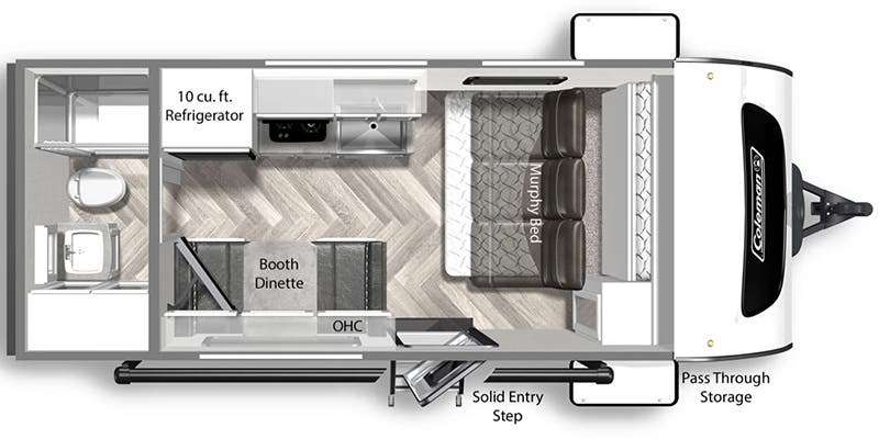 Lightweight and ready for the camp-loving couple, the Coleman Rubicon 1748RB has a surprising amount of space inside its laminated body. You’ll get plenty of room in the spacious and efficient rear bath with tons of storage space! To provide a lot of room during the day, the sleeping area is a fold-out Murphy bed / Sofa. Have a guest? They can snooze away on the convertible dinette. Check out the feature-laden Coleman Rubicon!