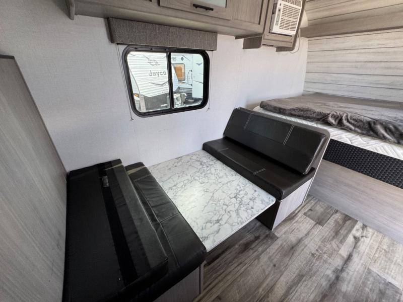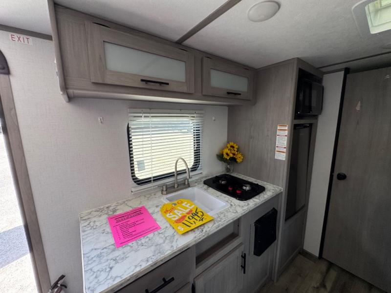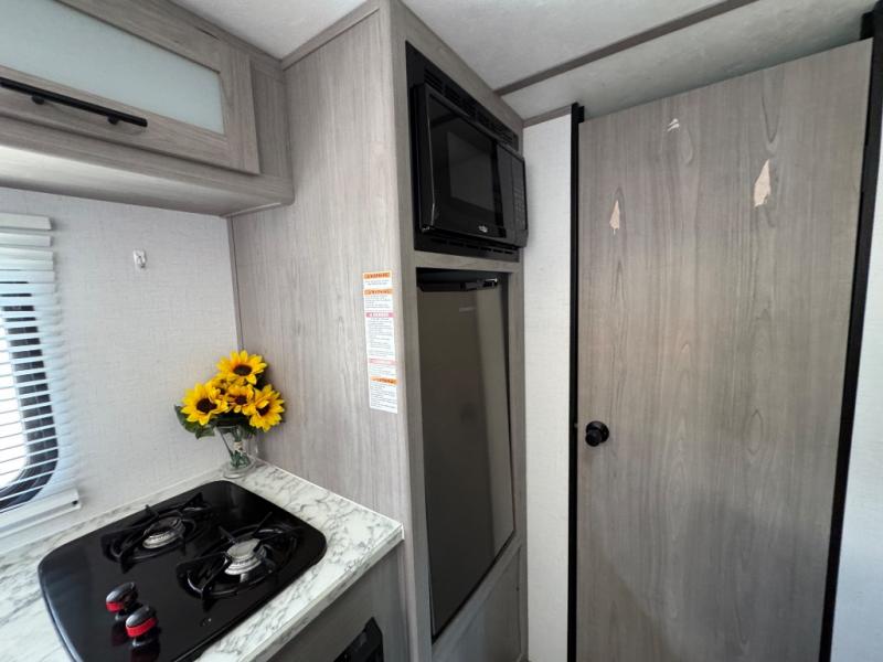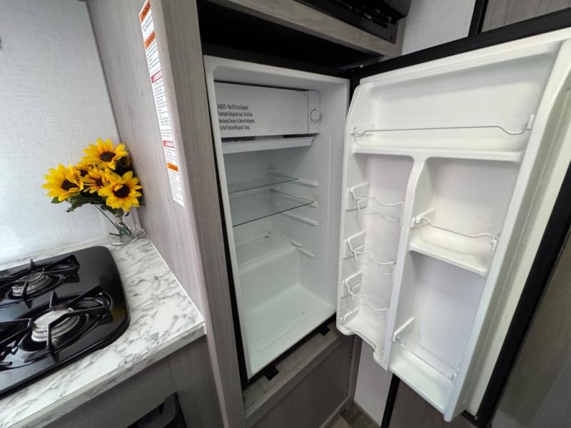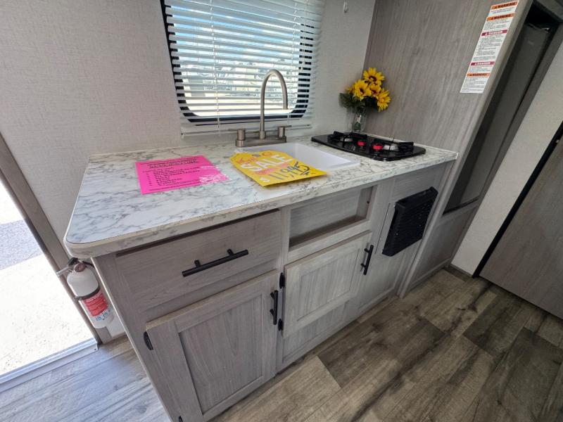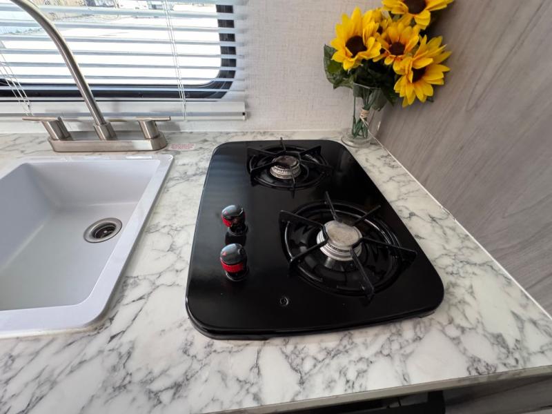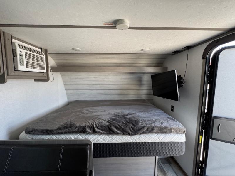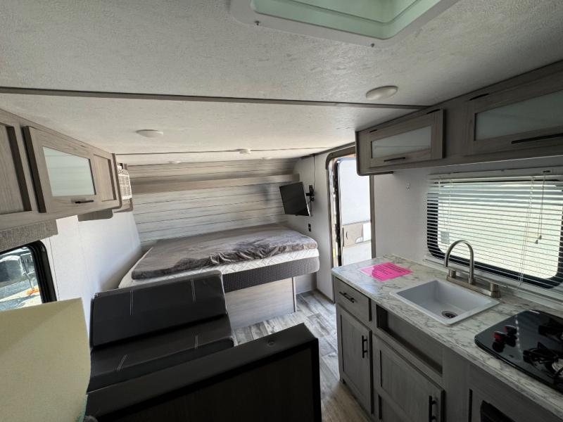 A perfect trailer for your family of three to five featuring a set of bunk beds for the kids or guests, a queen bed up front for you, and the booth dinette can be converted to sleep one or two more depending on size. This unit is cozy and convenient providing you just what you need to enjoy a little adventure away from home. For meals, there is a cooktop and sink, plus a refrigerator for your perishables. You will all appreciate the convenience of having your own private bath so that you don't need to use the campground facilities at night. You will also enjoy spending time outside with an 8' awning to provide even more living space outdoors!