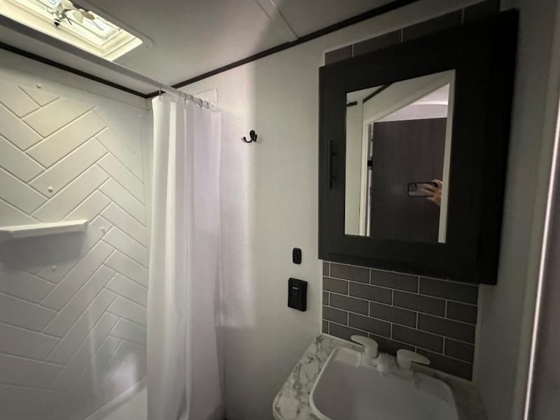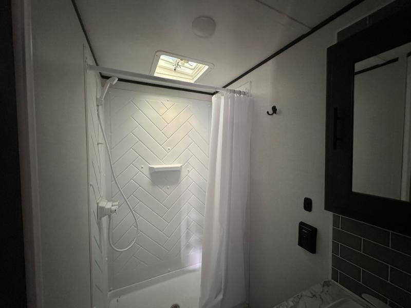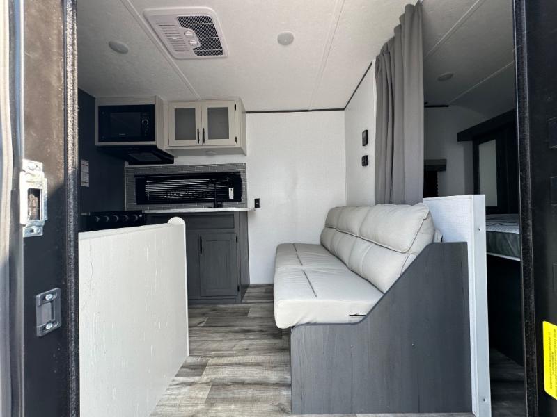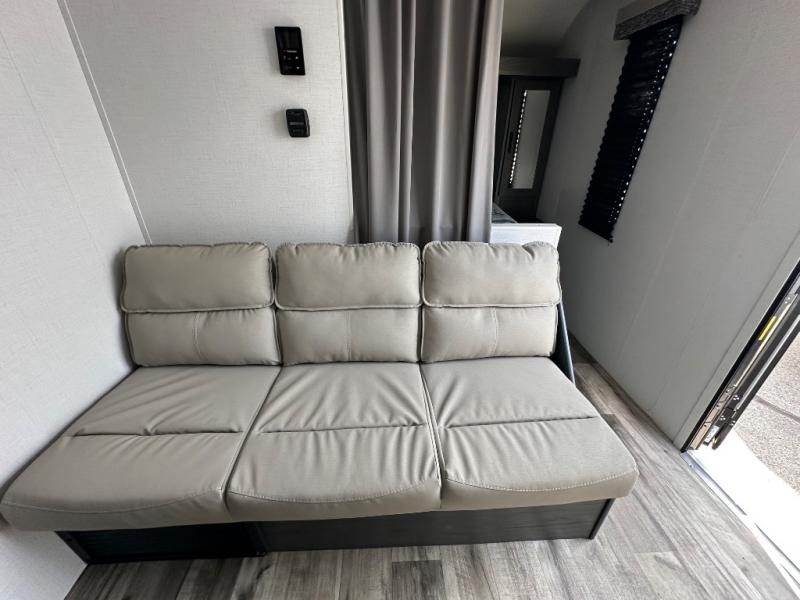 Load up for a fun weekend or long vacation with this trailer in tow! Whether you camp close or far away, you will have eight to nine sleeping spaces thanks to the residential queen bed in the semi-private bedroom, the double-size bunks near the rear corner bathroom, and the furniture in the middle. Everyone can take turns getting dressed in either the full bathroom, or front bedroom once the privacy curtain is closed. There is plenty of storage found throughout in the closets, overhead cabinets, and along the exterior in the pass-through compartment for those longer items. And the 14' power awning with LED lights gives you an outdoor living space protected from the elements, so just add your own camping chairs and such.