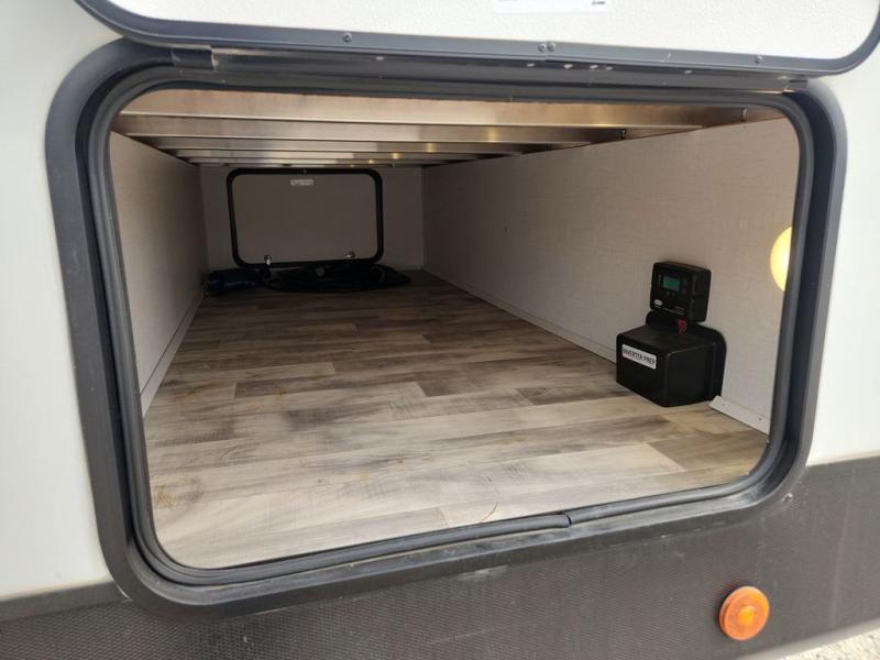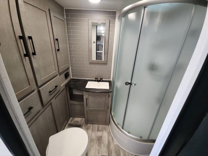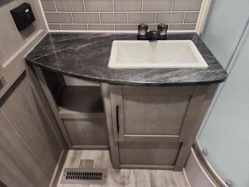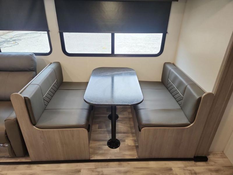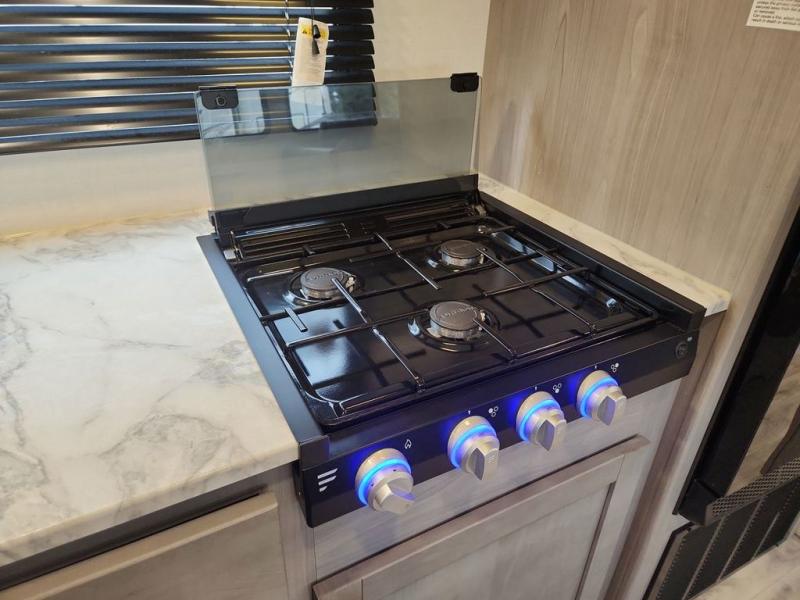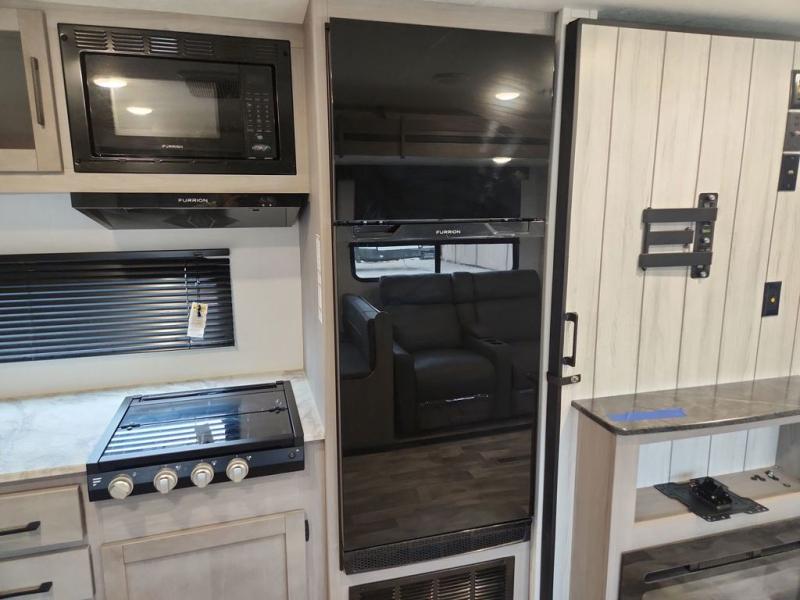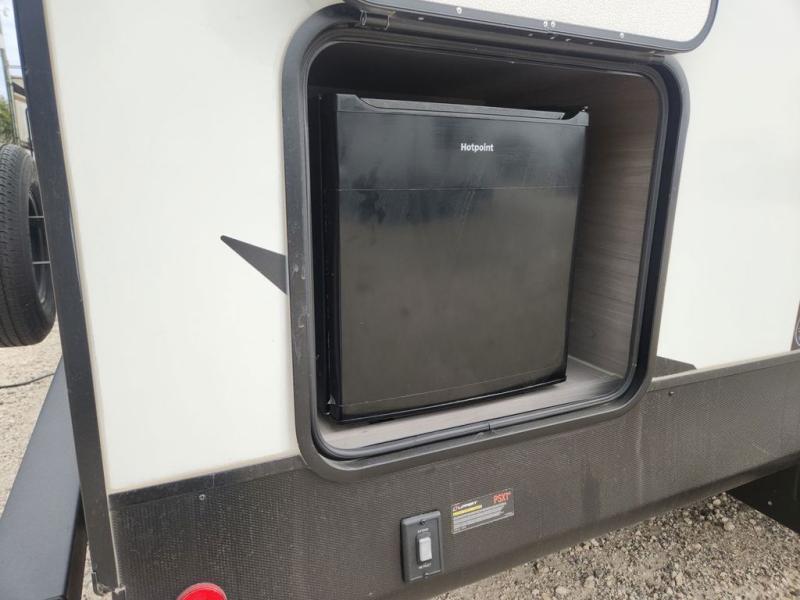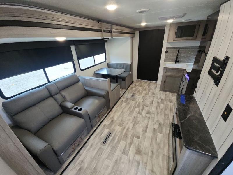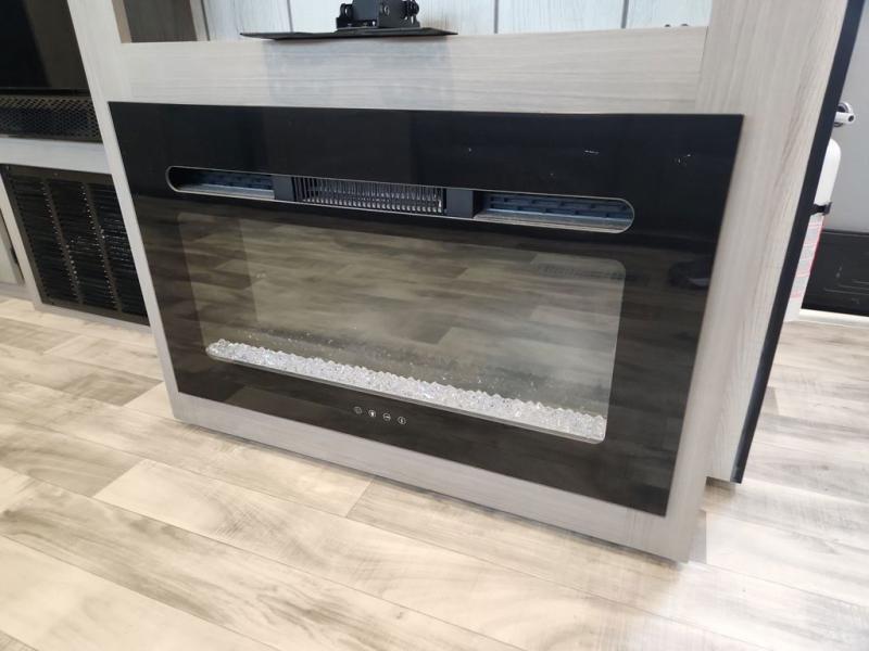 This travel trailer is ready to provide you with a home-like environment while you're at the campground. You can prepare meals each day on the two burner cooktop or in the microwave oven, and there is a 10 cu. ft. 12V refrigerator for perishables. Dine at the booth dinette or take your plate outdoors to sit under the 14' power awning with LED lights. There are also theater seats inside if you want to stay close to the fireplace with a good book instead. The full rear bath includes plenty of storage space, and the front private bedroom with a queen bed will feel just like home!