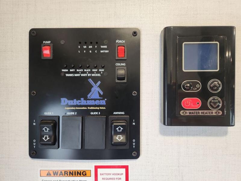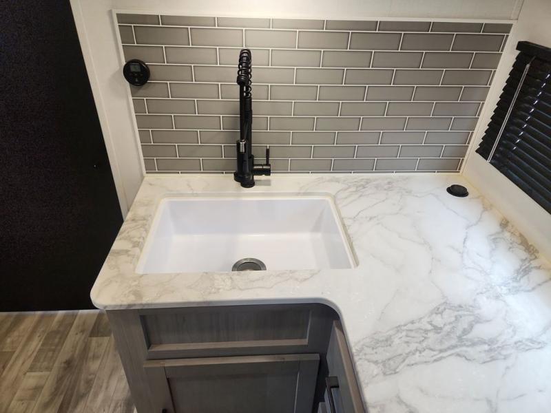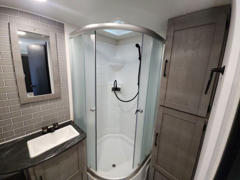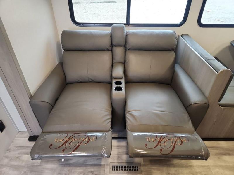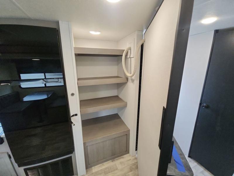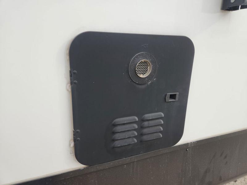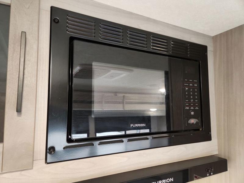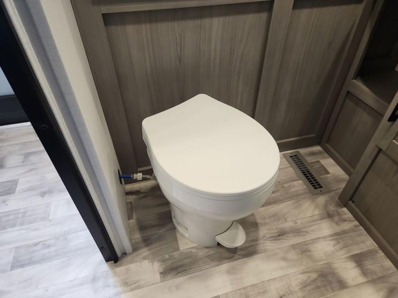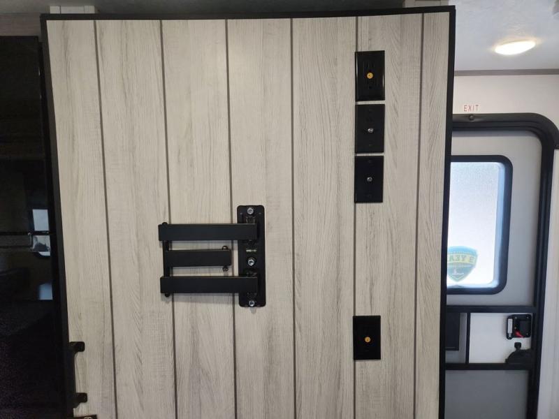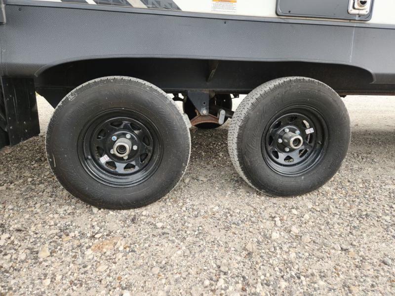 This travel trailer is ready to provide you with a home-like environment while you're at the campground. You can prepare meals each day on the two burner cooktop or in the microwave oven, and there is a 10 cu. ft. 12V refrigerator for perishables. Dine at the booth dinette or take your plate outdoors to sit under the 14' power awning with LED lights. There are also theater seats inside if you want to stay close to the fireplace with a good book instead. The full rear bath includes plenty of storage space, and the front private bedroom with a queen bed will feel just like home!