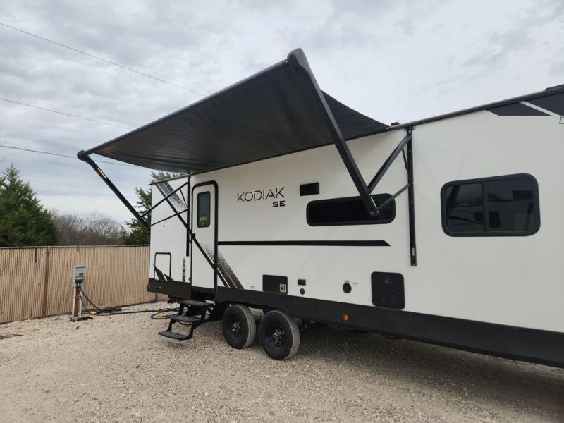 With any Kodiak SE travel trailer by Dutchmen RV, you can experience comfort while camping at a moment's notice. Each trailer includes features such as power front and rear stabilizer jacks and a power tongue jack which makes set-up easy, and a power awning with LED light for convenient outdoor living. Each model features HyperDeck flooring, and carpet free slides making them easy to clean. From the floor structure which includes a fully enclosed underbelly to the laminated walls with aluminum frame with block foam insulation, any Kodiak SE is built lightweight and ready for adventure!