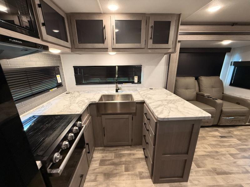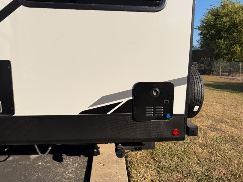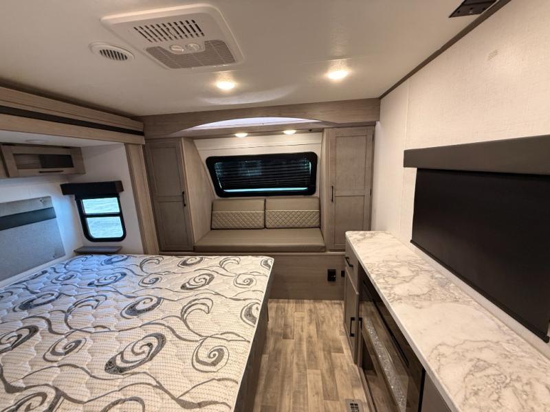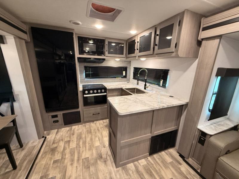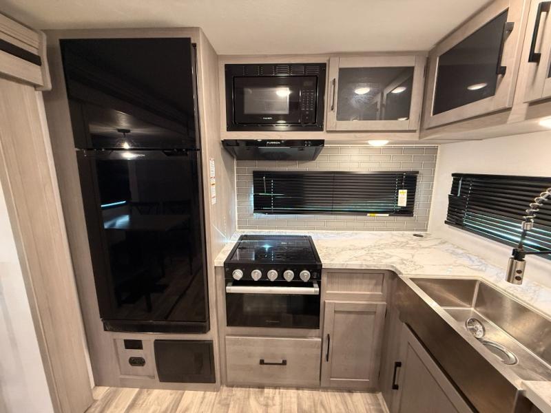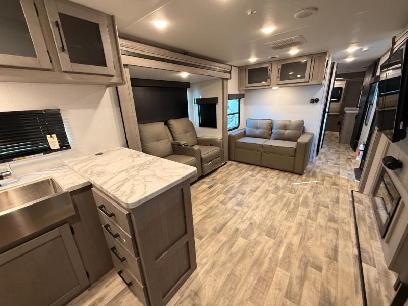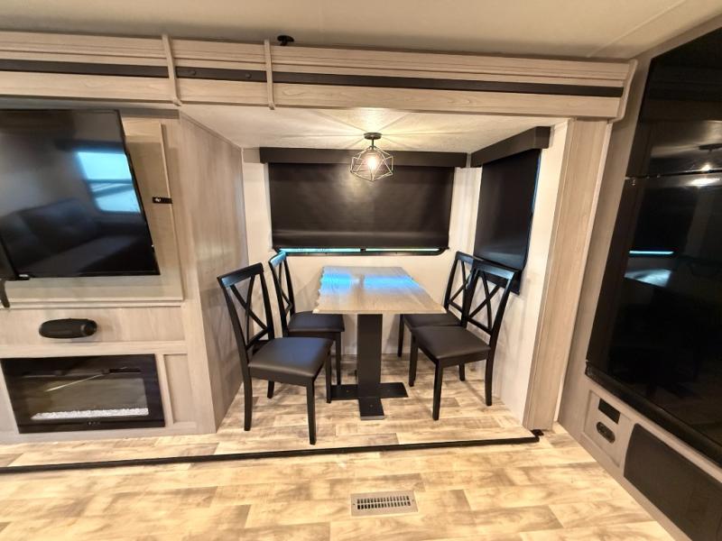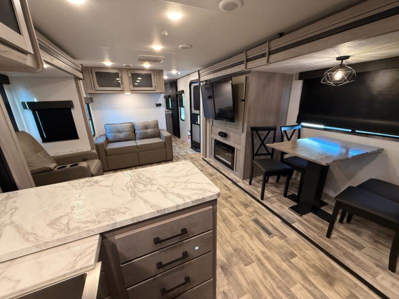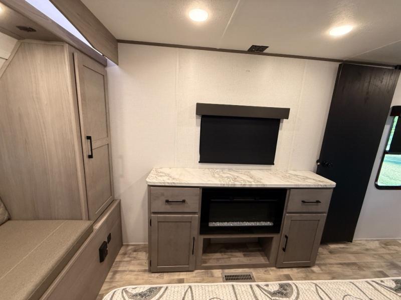 You will love weekends at the lake in this rear kitchen travel trailer that can sleep four to five. There is plenty of counter space in the kitchen, along with a 10 cu. ft. 12V refrigerator, a microwave oven for quick meals, and a booth dinette that can be switched out for an optional standing dinette. Your crew can get cozy on the theater seating with a foot rest directly across from the fireplace and hinged TV with shelving. There is also a jack knife sofa here for more seating and sleeping space for guests. The full bath includes a shower with a skylight and an LED backlit medicine cabinet to keep this space tidy. And you're going to love the front private bedroom with its king bed slide out, front bench seat with dual closets on either side, and bedroom fireplace!