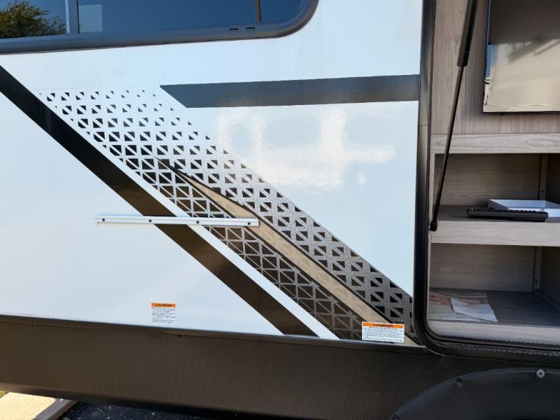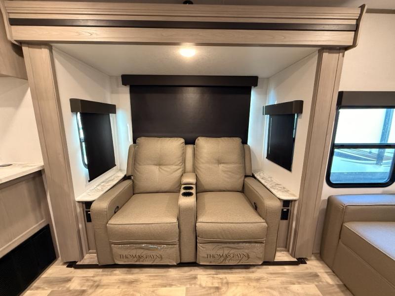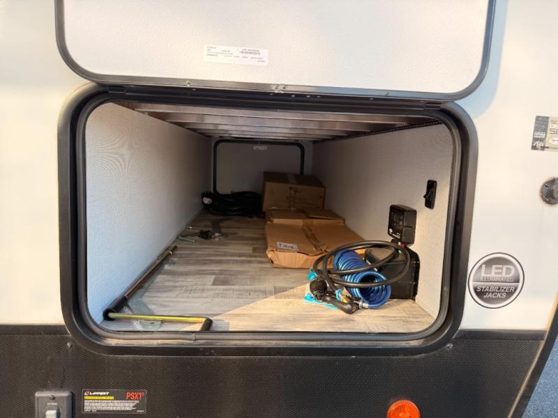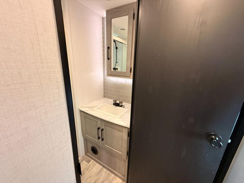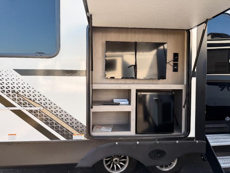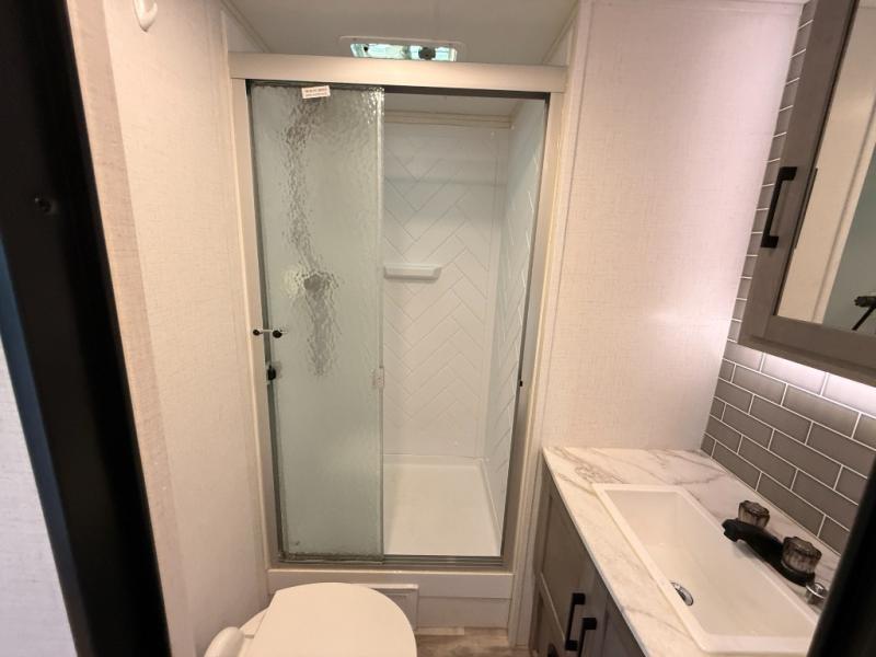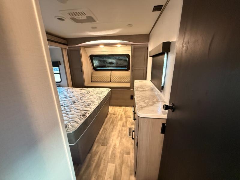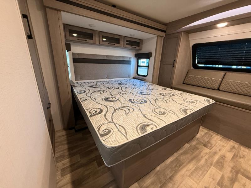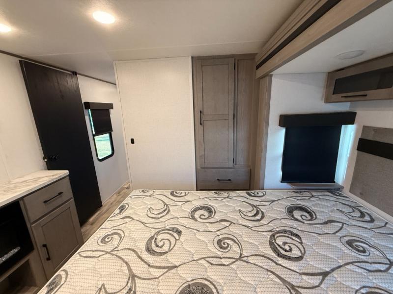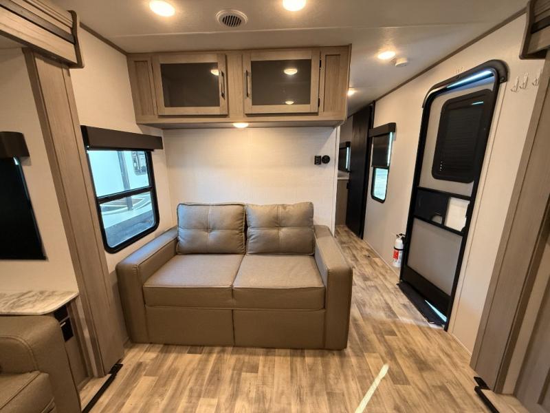 You will love weekends at the lake in this rear kitchen travel trailer that can sleep four to five. There is plenty of counter space in the kitchen, along with a 10 cu. ft. 12V refrigerator, a microwave oven for quick meals, and a booth dinette that can be switched out for an optional standing dinette. Your crew can get cozy on the theater seating with a foot rest directly across from the fireplace and hinged TV with shelving. There is also a jack knife sofa here for more seating and sleeping space for guests. The full bath includes a shower with a skylight and an LED backlit medicine cabinet to keep this space tidy. And you're going to love the front private bedroom with its king bed slide out, front bench seat with dual closets on either side, and bedroom fireplace!