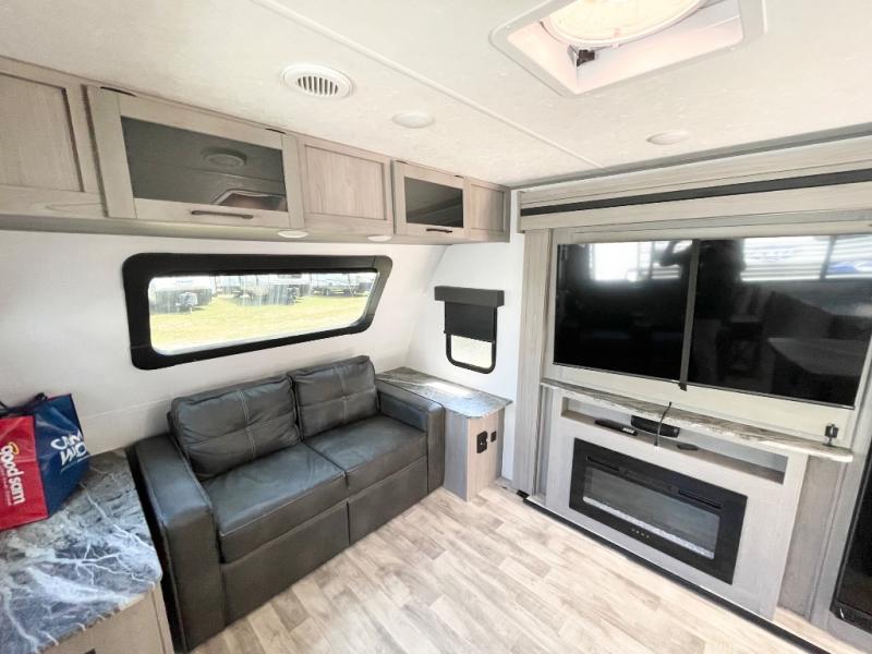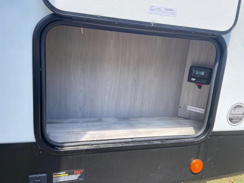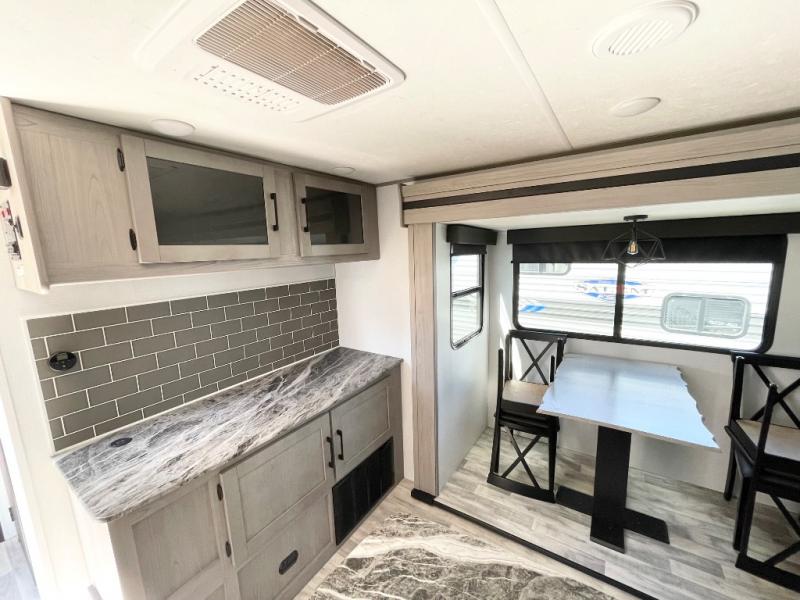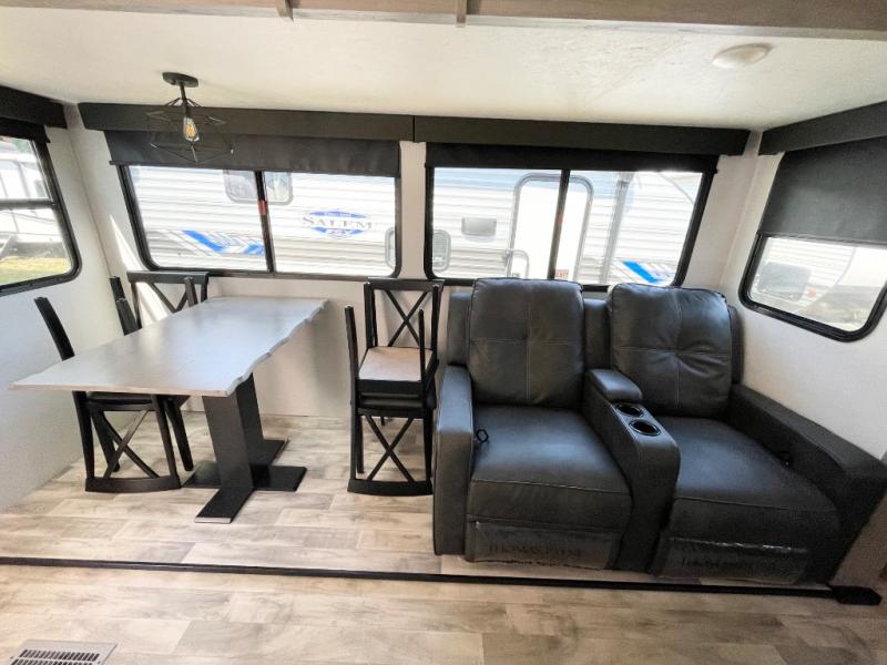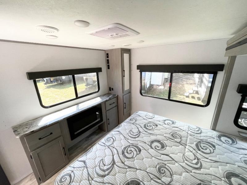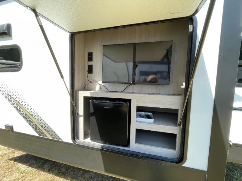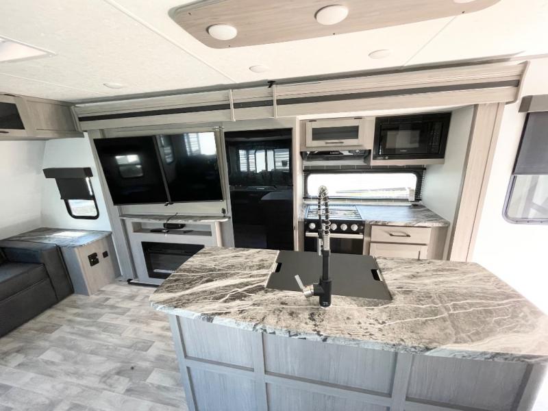 Enjoy ultimate family vacations or trips with friends in this spacious travel trailer. The dual opposing slides in the front living area open up the whole unit for a more at-home feel, and you'll find plenty of seating spaces on the theater seating with a foot rest, booth dinette, and jack knife sofa. The chef of the family will appreciate the extra counter space provided by the kitchen island, plus there is an extra counter with cabinets above for dishes and food. There is an outside kitchen that will come in handy if you like to cook breakfast outdoors, and the power awning with LED lights will provide your crew with shade as they wait for the food to be done. You and your spouse will love retreating to the rear private bedroom for bed each night. Here, the slide out king bed will provide a great night's rest, plus you will have your own fireplace, a closet, and linen storage for more belongings!