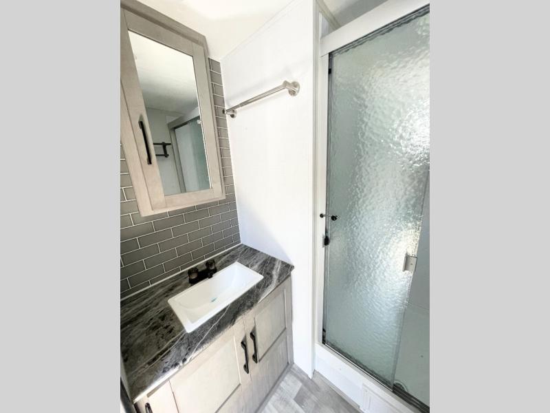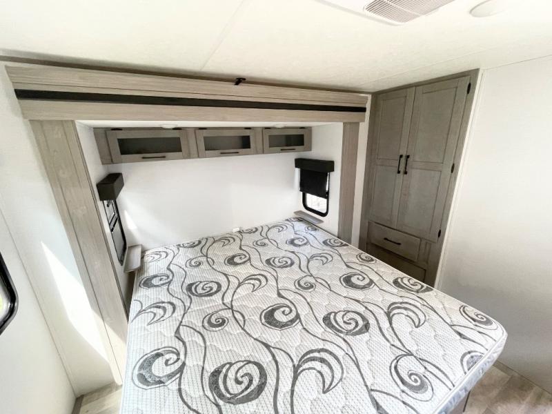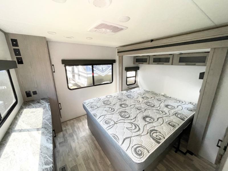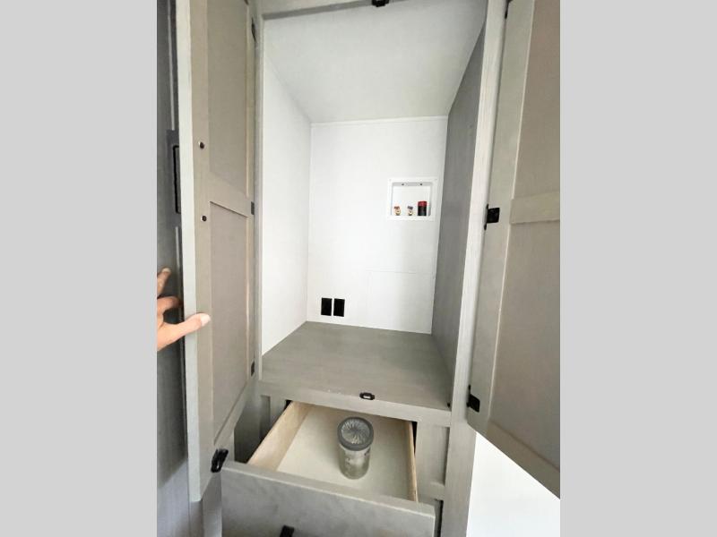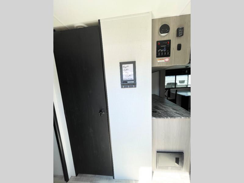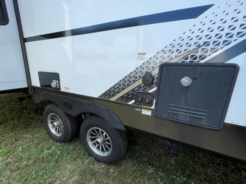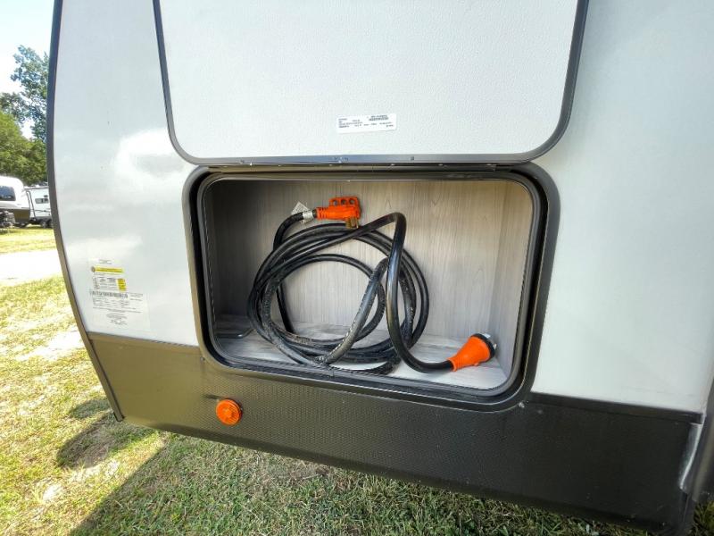 Enjoy ultimate family vacations or trips with friends in this spacious travel trailer. The dual opposing slides in the front living area open up the whole unit for a more at-home feel, and you'll find plenty of seating spaces on the theater seating with a foot rest, booth dinette, and jack knife sofa. The chef of the family will appreciate the extra counter space provided by the kitchen island, plus there is an extra counter with cabinets above for dishes and food. There is an outside kitchen that will come in handy if you like to cook breakfast outdoors, and the power awning with LED lights will provide your crew with shade as they wait for the food to be done. You and your spouse will love retreating to the rear private bedroom for bed each night. Here, the slide out king bed will provide a great night's rest, plus you will have your own fireplace, a closet, and linen storage for more belongings!