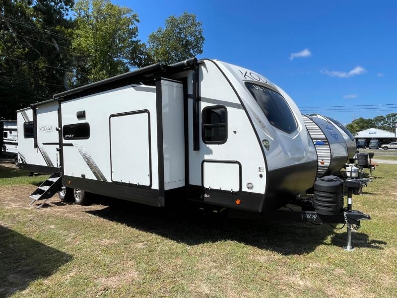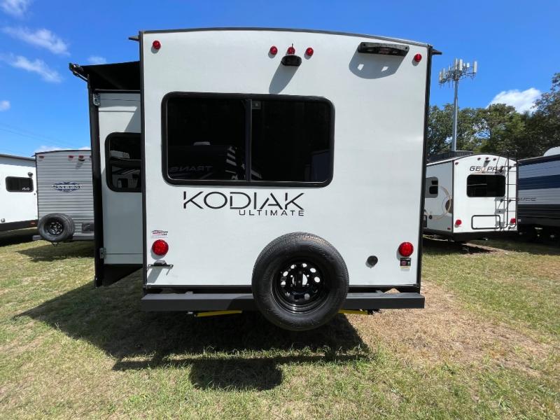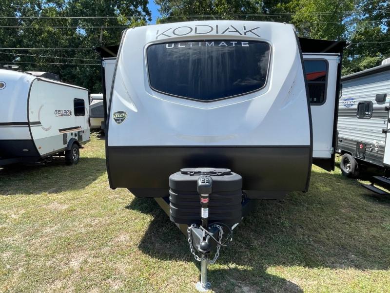 Each Kodiak Ultimate travel trailer by Dutchmen is constructed with an insulated reinforced front cap and diamond plate front rock guard to protect your RV from rock and debris on the way to the campground. The aluminum entry steps are not only dependably, but they collapse and expand quickly so you can get on the road in no-time! These models feature HyperDeck flooring that includes fiberglass reinforced thermoplastic and a fully enclosed underbelly, and the Bear Cave storage allows you to bring along all of your hiking and fishing gear. Some of the interior features you are sure to love are the modern decor choices, dual motion sensory bathroom LED lights, stainless kitchen sink with an apron front, plus a central control panel to easily keep track of your units functions. Your next adventure starts with a Kodiak Ultimate travel trailer!