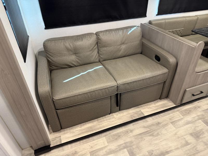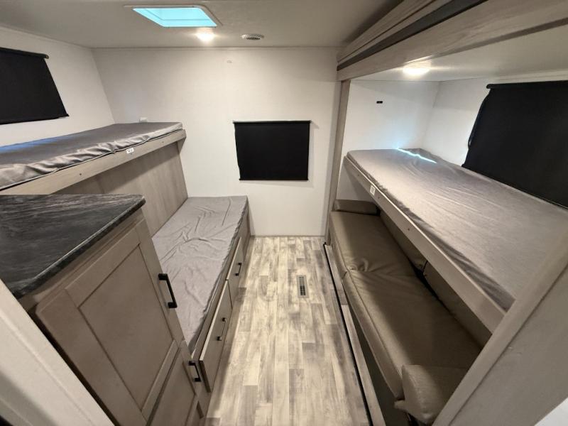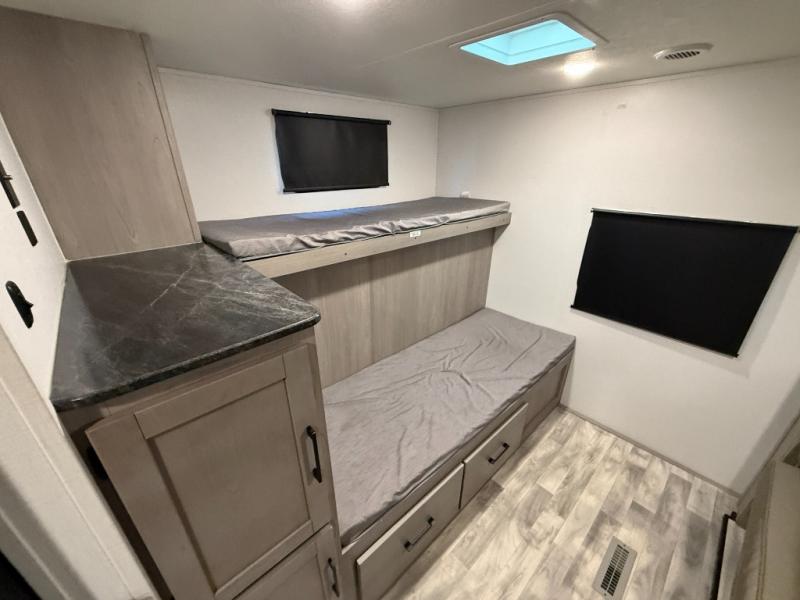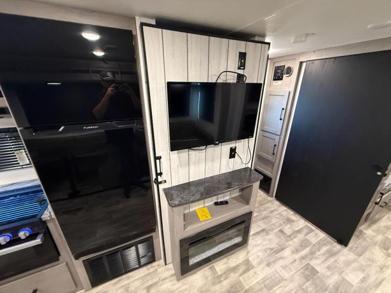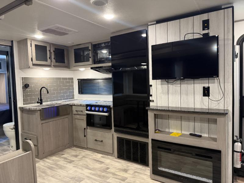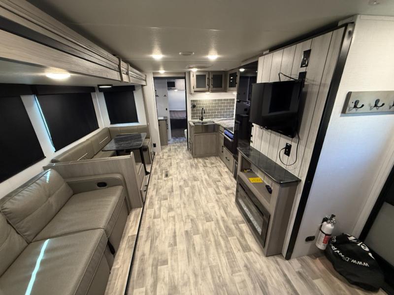 It will be so easy camping with friends in this spacious travel trailer with double slides and a rear private bunkhouse. Once you're set up at the campsite, prepare lunch on the outside kitchen and relax under the 18' power awning with LED lights. You may just decide to grab the fishing poles from the pass-through storage and head down to the river. Everyone can meet in the main living area around the U-shaped dinette or on the jack knife sofa with a foot rest, and the fireplace here will make it feel more like home.