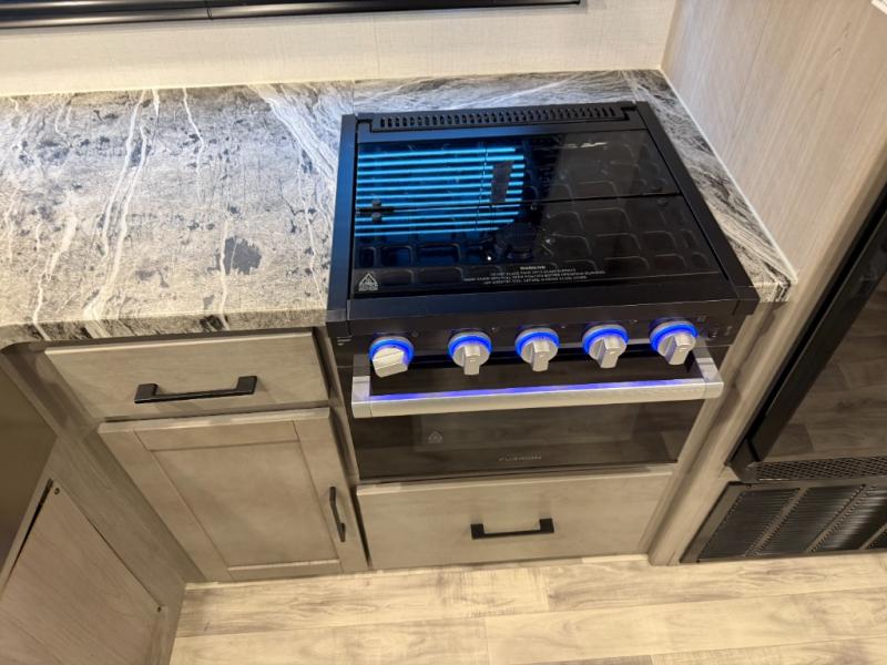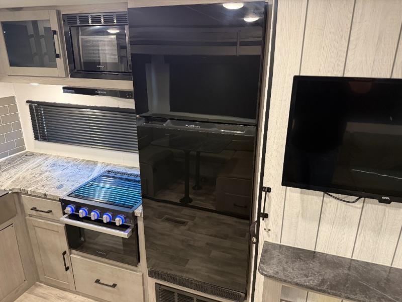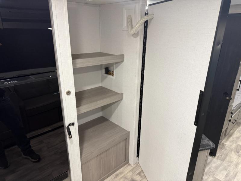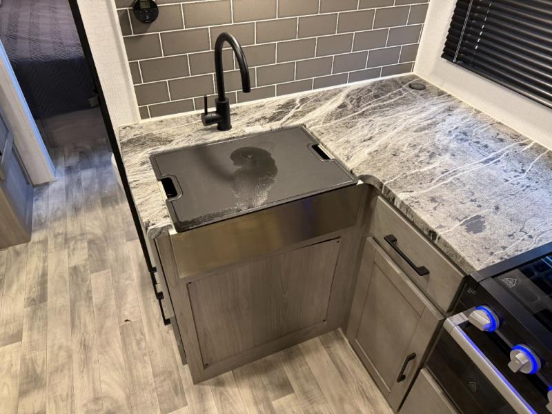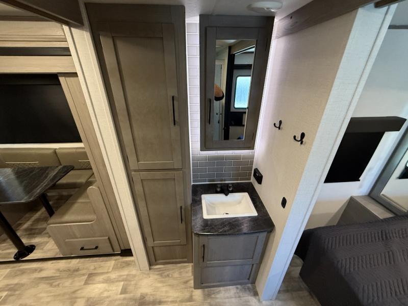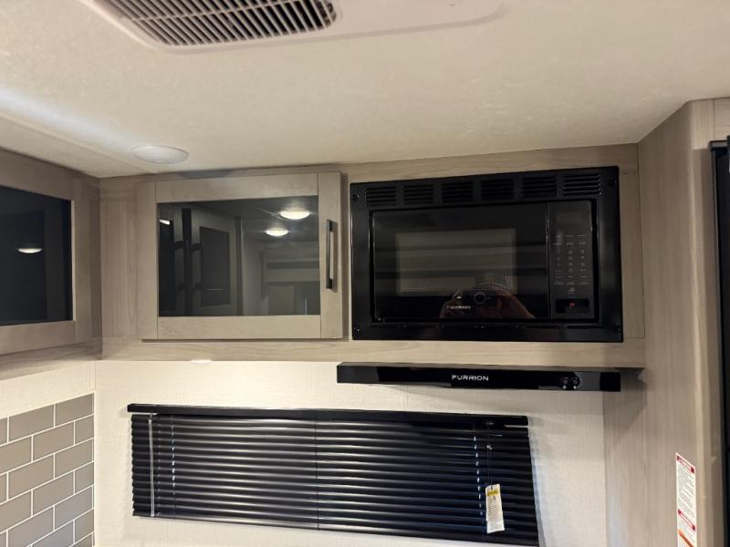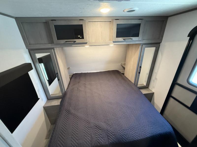 It will be so easy camping with friends in this spacious travel trailer with double slides and a rear private bunkhouse. Once you're set up at the campsite, prepare lunch on the outside kitchen and relax under the 18' power awning with LED lights. You may just decide to grab the fishing poles from the pass-through storage and head down to the river. Everyone can meet in the main living area around the U-shaped dinette or on the jack knife sofa with a foot rest, and the fireplace here will make it feel more like home.