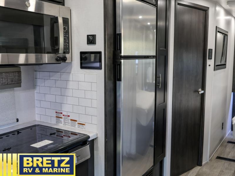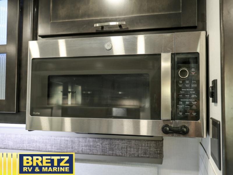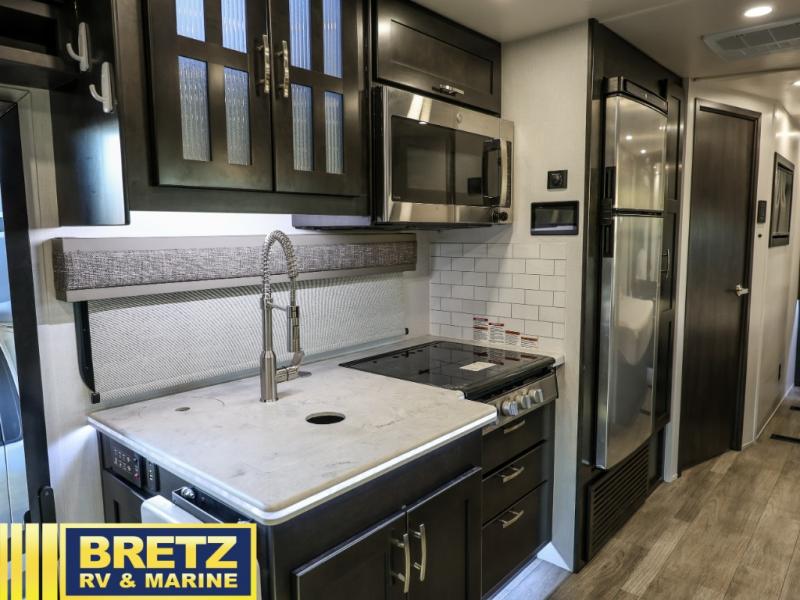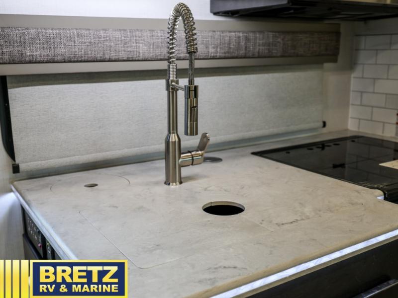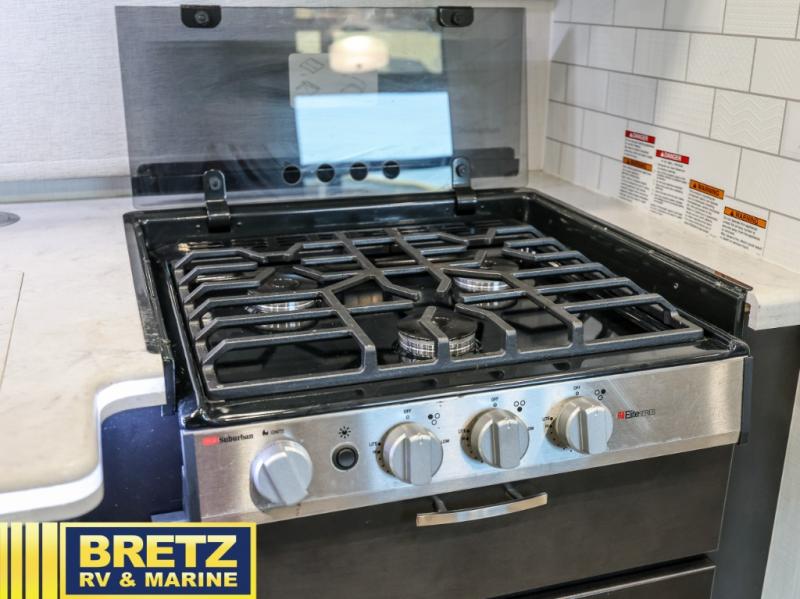 You will have plenty of space to walk about this motorhome with the dual slides! The booth dinette and sofa slide create an open concept living area and the sofa can be replaced for the optional theater seating if you prefer that instead. Freshen up after a long day of traveling in the rear corner bathroom with the designer shower that has a skylight above for more natural lighting and an Oxygenics body spa RV shower head for a more relaxing shower. Put on your comfy clothes stored in the wardrobe in the rear corner private bedroom then either lay on the 60" x 75" gel-infused memory foam mattress while you watch a movie on the 32" LED smart TV or head to the kitchen and whip up a meal with the three burner gas range and countertop extension. You could even head outside and watch a movie on the exterior 32" TV underneath the 16' dual-pitch armless awning!