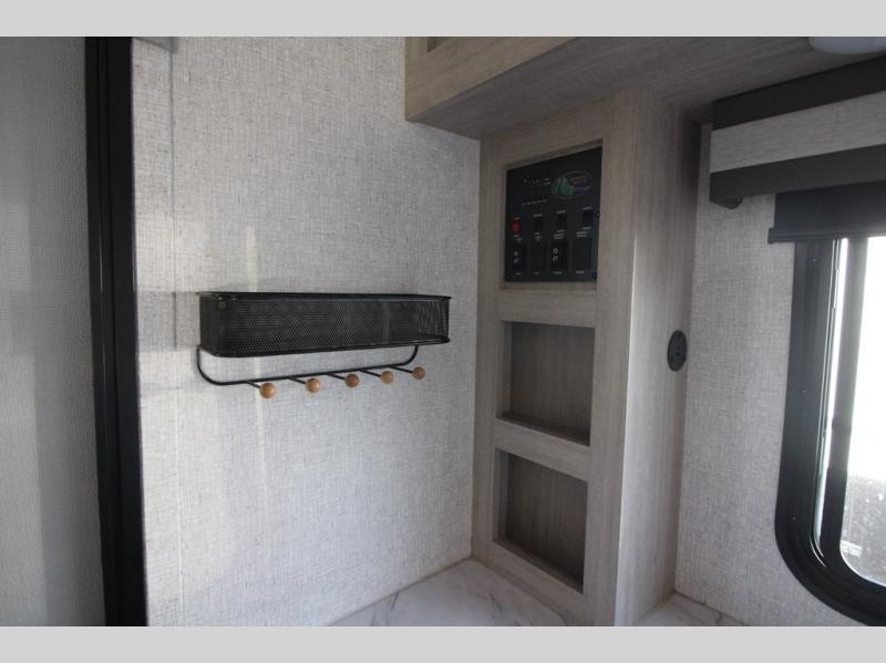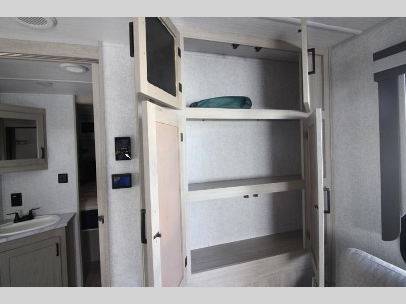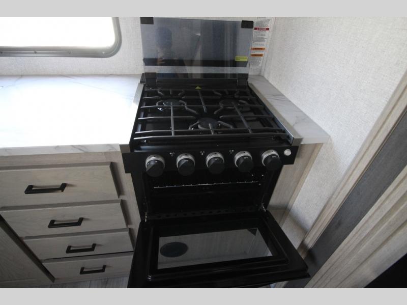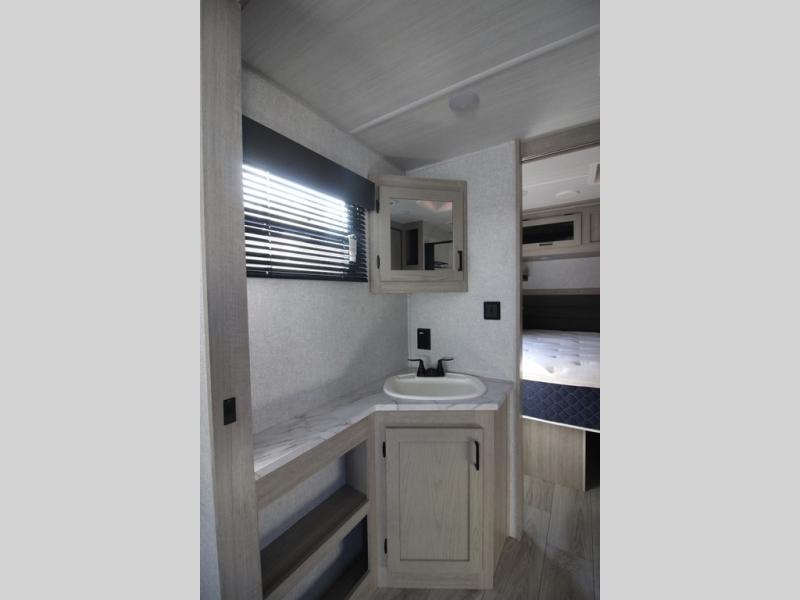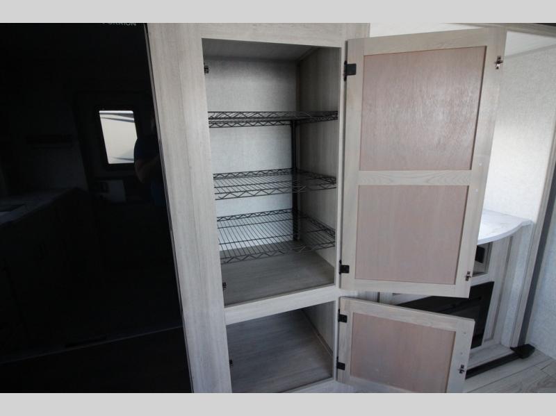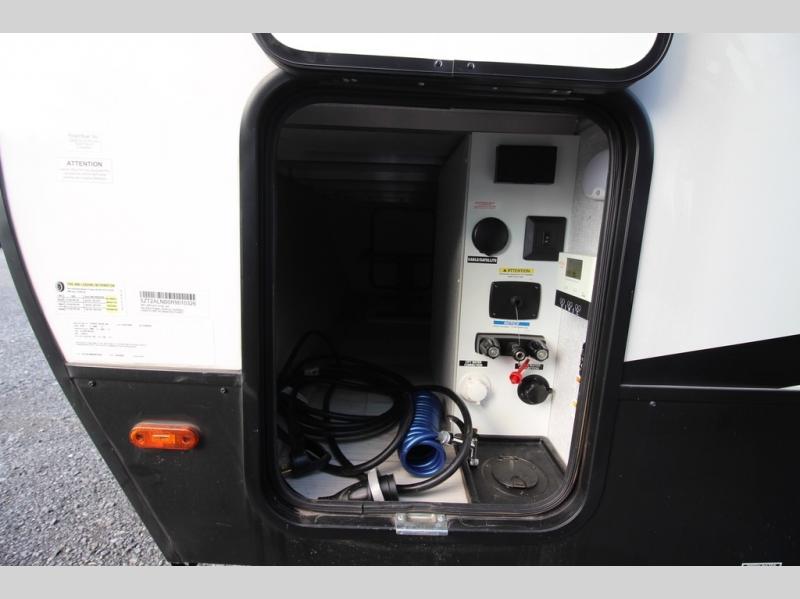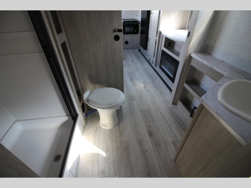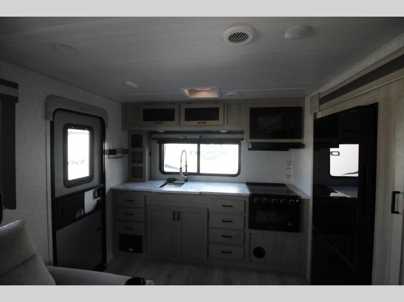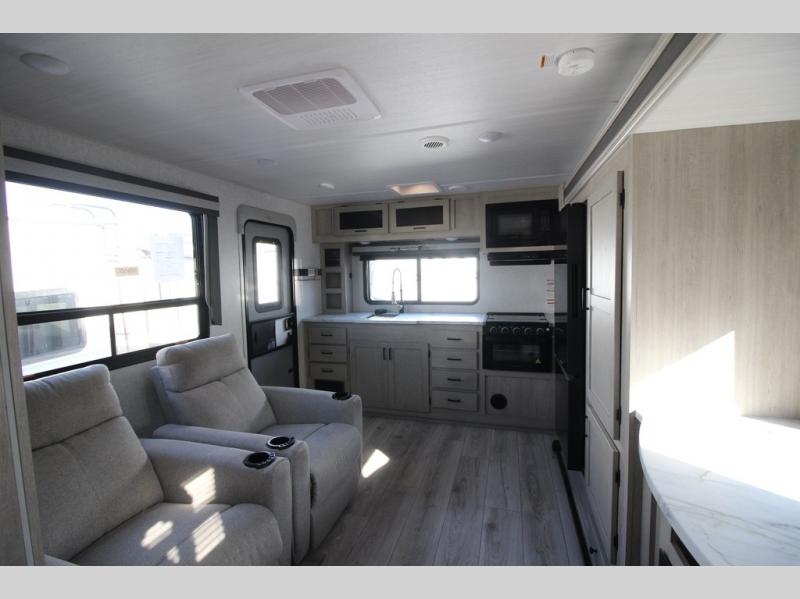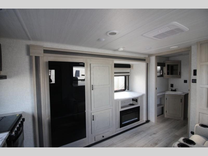 You're going to love this rear kitchen travel trailer with dual entry doors and a king bed in the front bedroom! The tri-fold sofa can be replaced by optional theater seats, plus there is a telescoping 40" TV with a fireplace for a more at-home feel. The walk-through bath will be easy for everyone to access, and there is a shower skylight here to let more natural light in. This model is also pet-friendly thanks to the pet dish under the refrigerator and the outside spray port to hose them off after a day in the river!