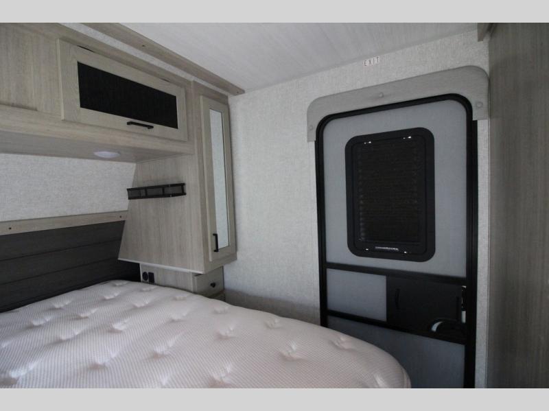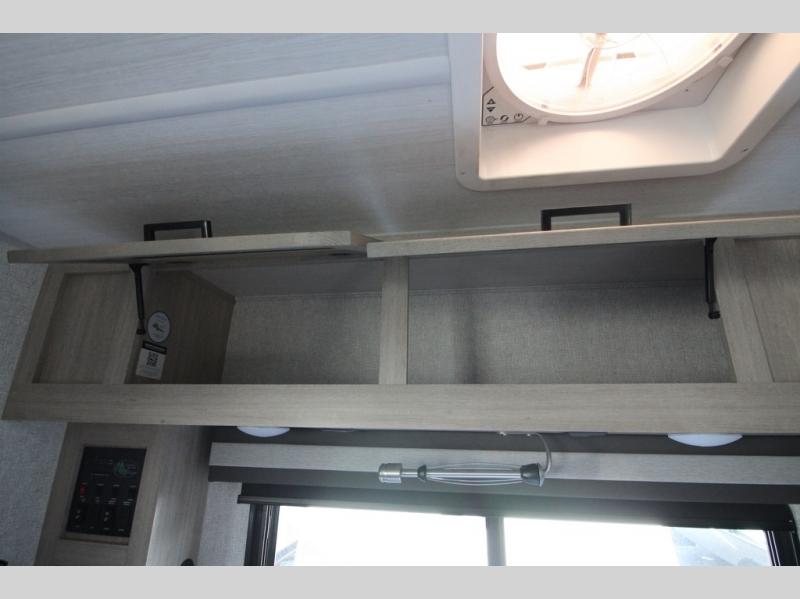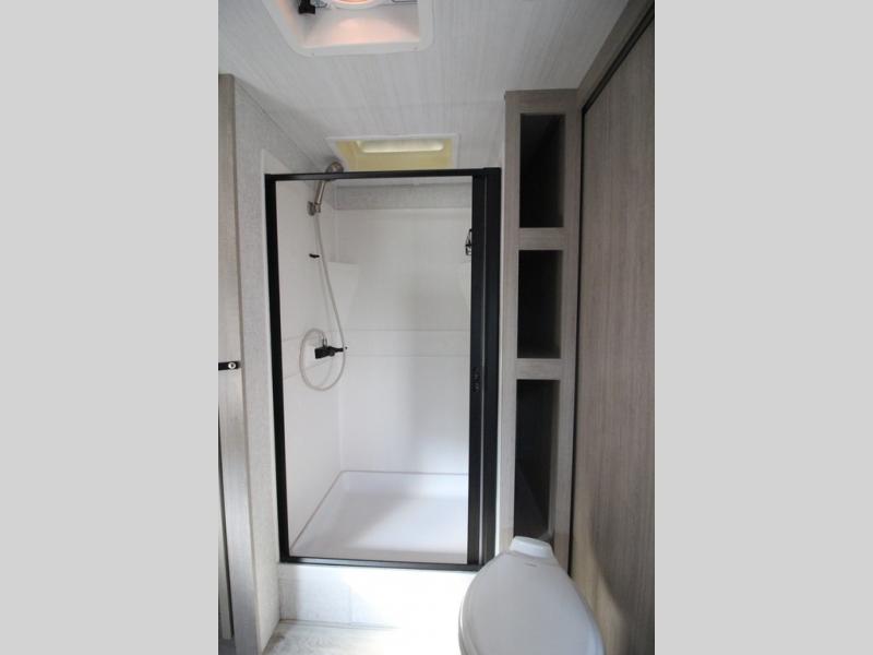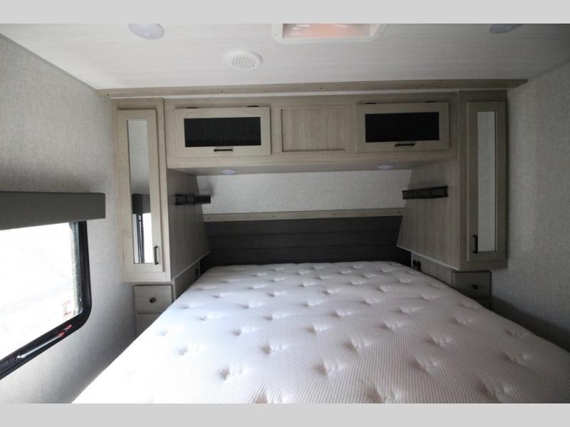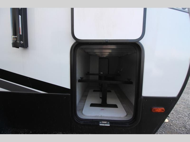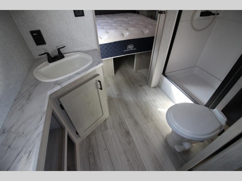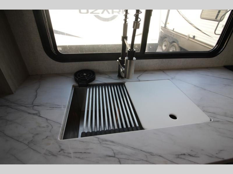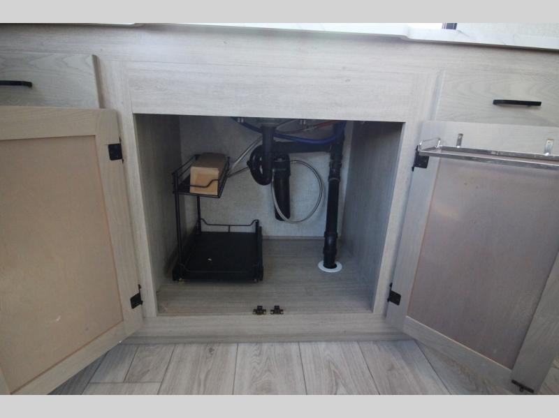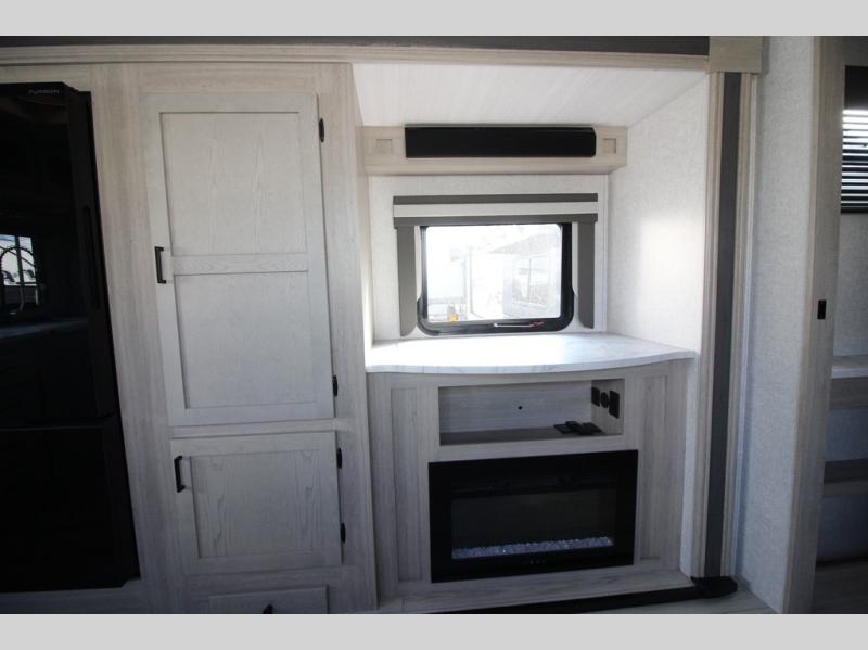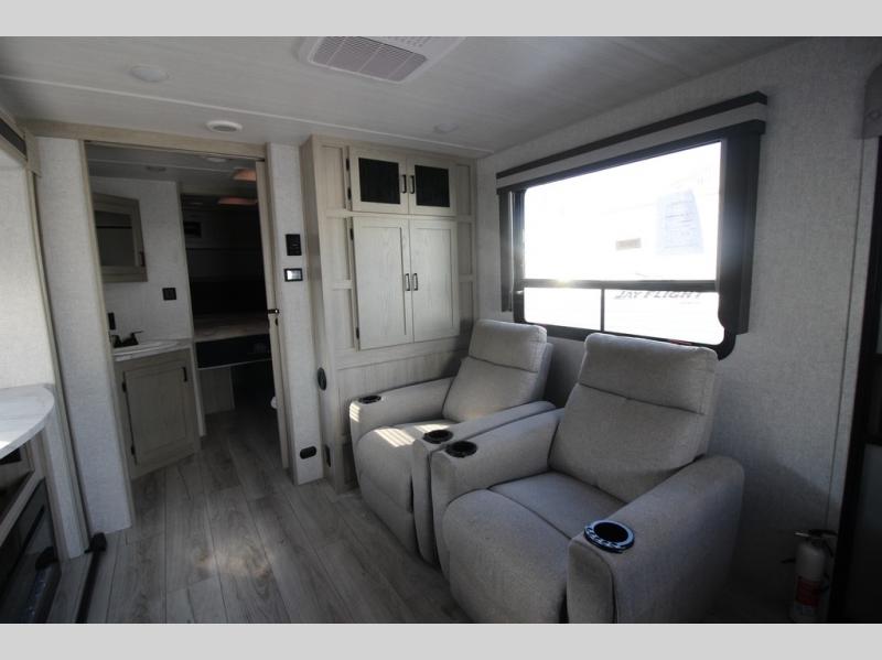 You're going to love this rear kitchen travel trailer with dual entry doors and a king bed in the front bedroom! The tri-fold sofa can be replaced by optional theater seats, plus there is a telescoping 40" TV with a fireplace for a more at-home feel. The walk-through bath will be easy for everyone to access, and there is a shower skylight here to let more natural light in. This model is also pet-friendly thanks to the pet dish under the refrigerator and the outside spray port to hose them off after a day in the river!