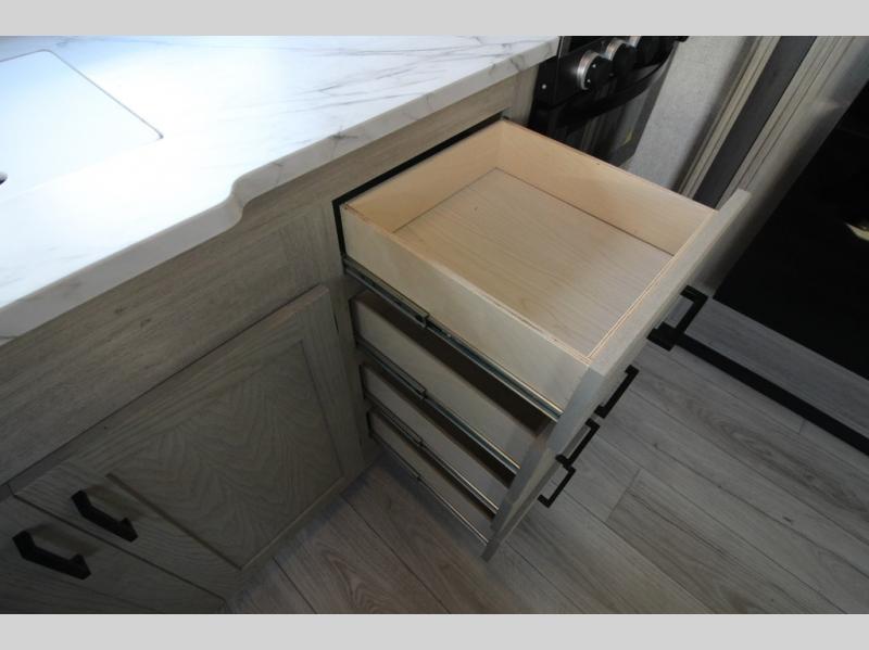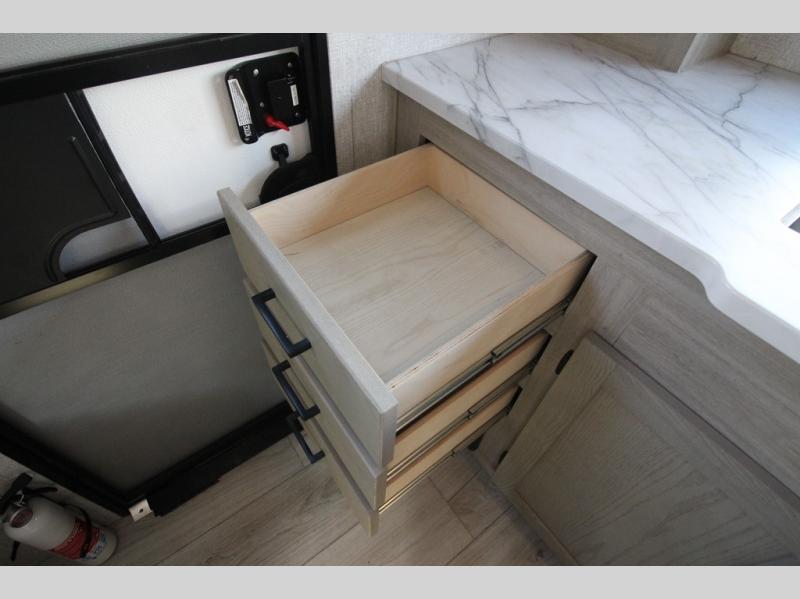 Each Alta travel trailer or toy hauler by EAST TO WEST is constructed with a 5" vacuum bonded roof, an enclosed and heated underbelly, and diamond plate front rock guard for added protection. Outside, you'll find marine-grade exterior speakers, a universal docking station, and back-up camera prep that can be added to make maneuvering in and out of campgrounds easier than ever. Inside, there are 4k interior LED lights, solid pressed membrane countertops, black roller shades, and many more interior comforts you are sure to love.
