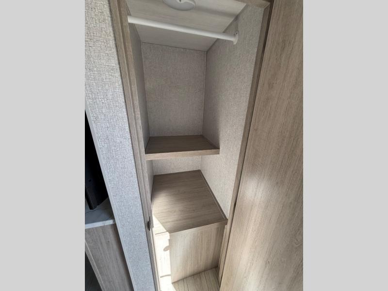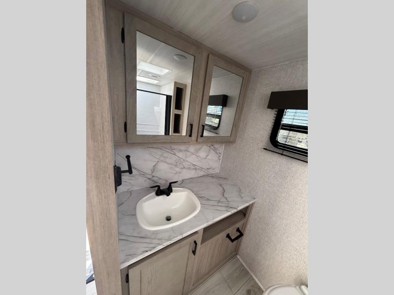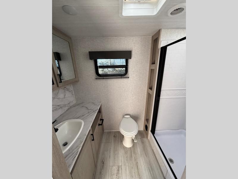 Wow! Check out the spacious full rear bath in this travel trailer for five! You'll appreciate a linen closet here and a shower skylight to let natural light in. Your crew can get comfortable on the tri-fold sofa that sits directly across from the fireplace for a more cozy feel. There is also a booth dinette here with storage space underneath for board games. Head to the kitchen to prepare dinner on the three burner cooktop, and use the countertop extension to cut fresh fruits and vegetables. A front private bedroom with a king bed and dual wardrobes will have you feeling right at home. Start camping today!