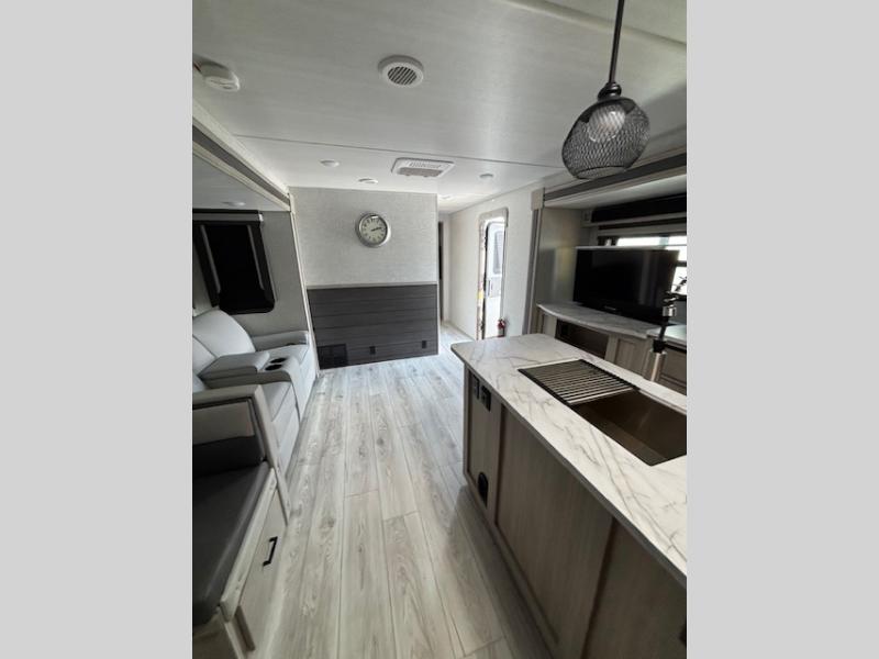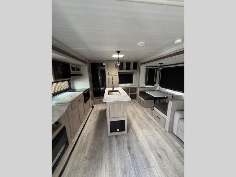 How does a king bed, a kitchen island, and an outdoor kitchen sound? You'll get all that and more in this spacious travel trailer. The dual opposing slides opens up the whole trailer, and the desk in the back will allow you to work while you're away from home. A three burner cooktop and microwave oven comes standard indoors, along with plenty of counter space and a pantry for snacks. Head outdoors to find the outside kitchen under the 21' power awning with LED lights, and when you're ready for bed the king bed will be waiting for you!