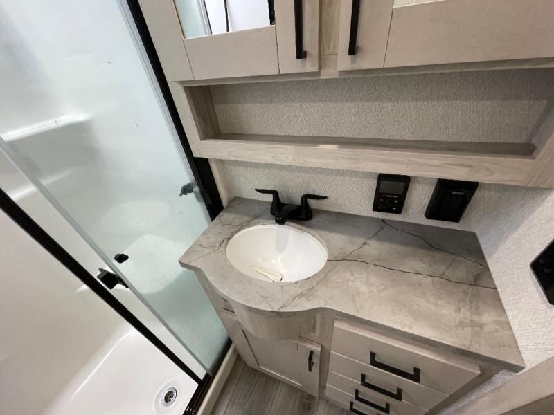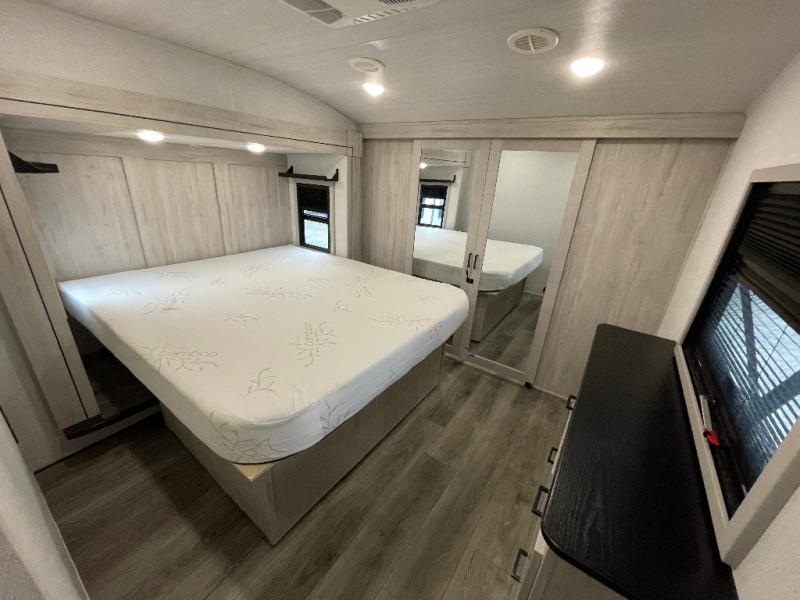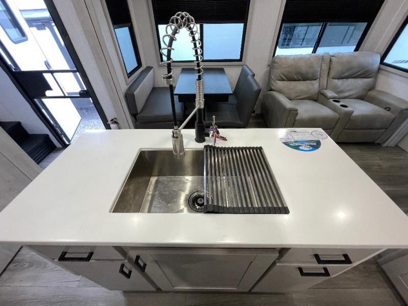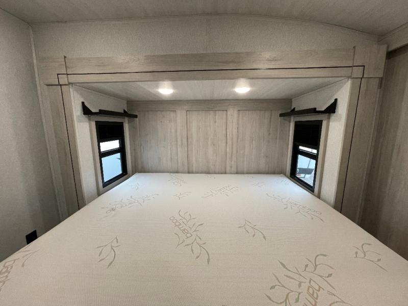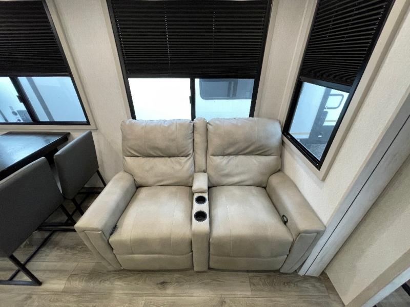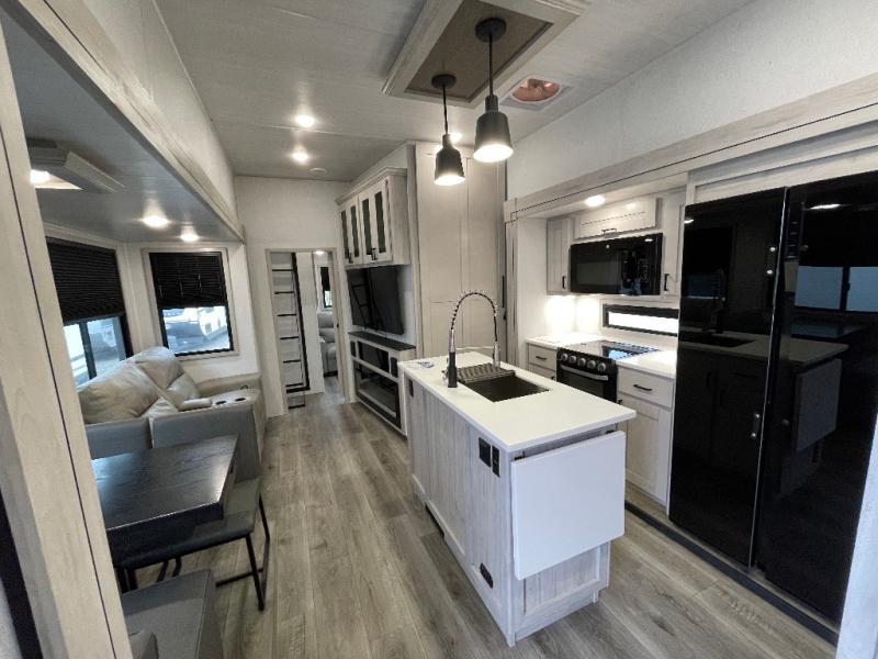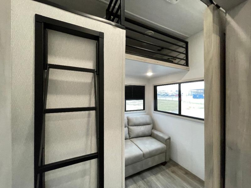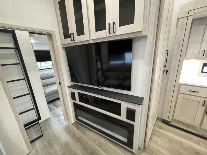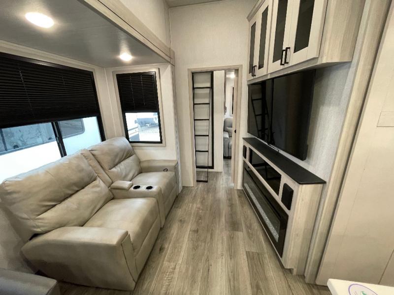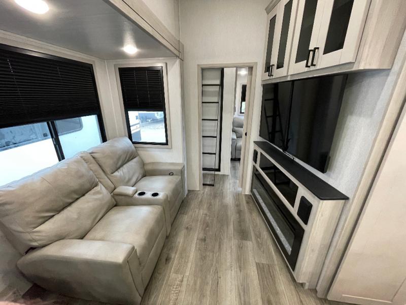 One look at this fifth wheel and you'll be sold! There is a rear private bunkhouse suite with a half bath, a hide-a-bed sofa, plus loft storage/bed! You will have the front private bedroom with a king bed slide out all to yourselves, plus there is a full-length wardrobe, a dresser with TV prep, and bedside shelves for your things. The spacious full bath is close by the bedroom and you'll appreciate the linen closet for clean towels and the shower skylight for added natural light. Everyone will love to gather together in the main living area/kitchen that includes theater seating across from a 50" TV with a fireplace, a free-standing dinette, plus a kitchen island with countertop extensions. And have you checked out the storage found throughout this model; overhead cabinets, loft storage, bedroom storage, and an oversized pass-through compartment outside!