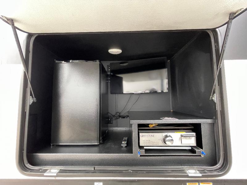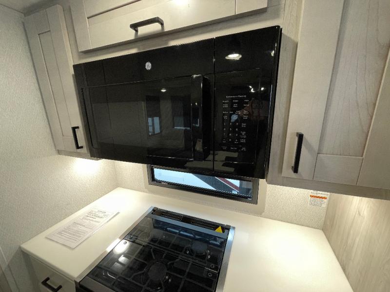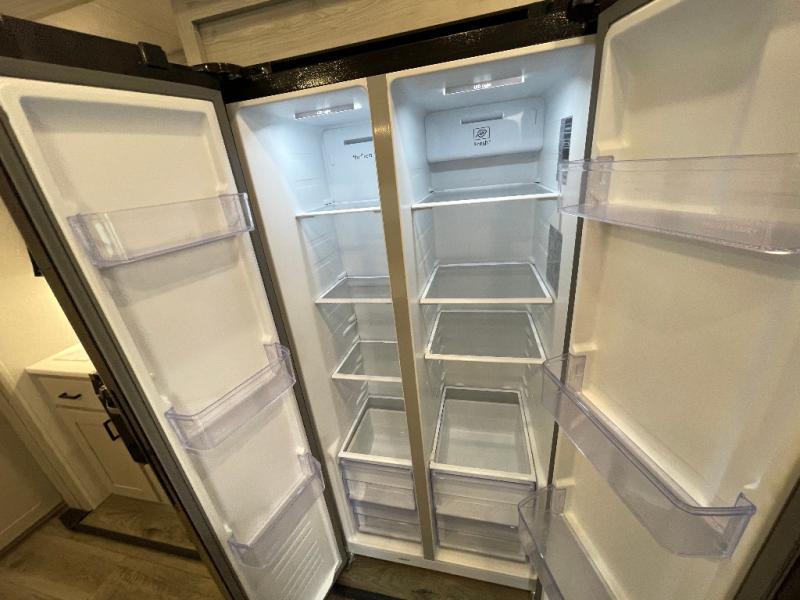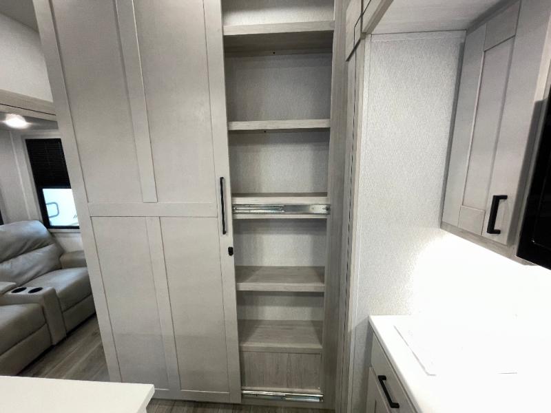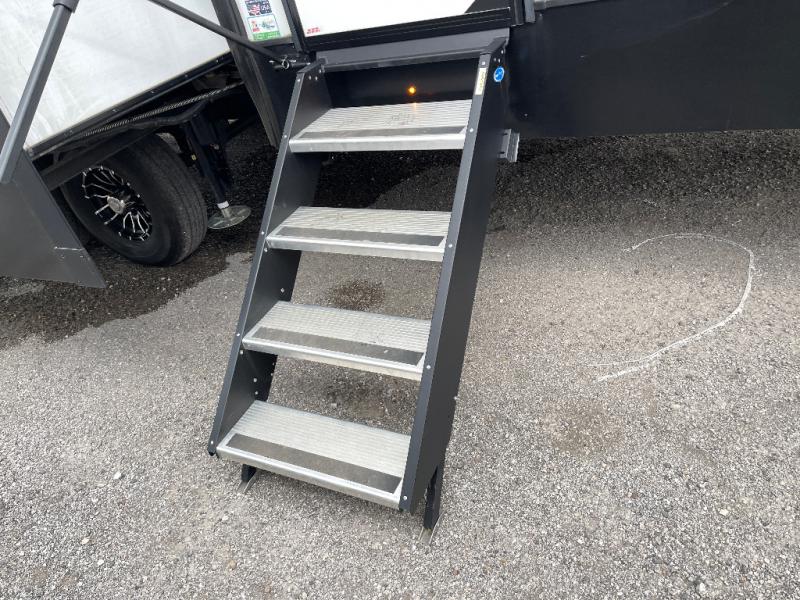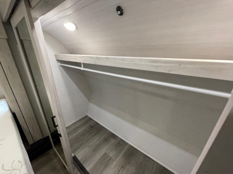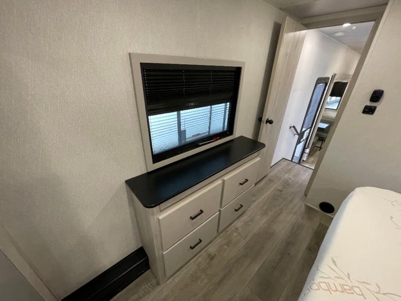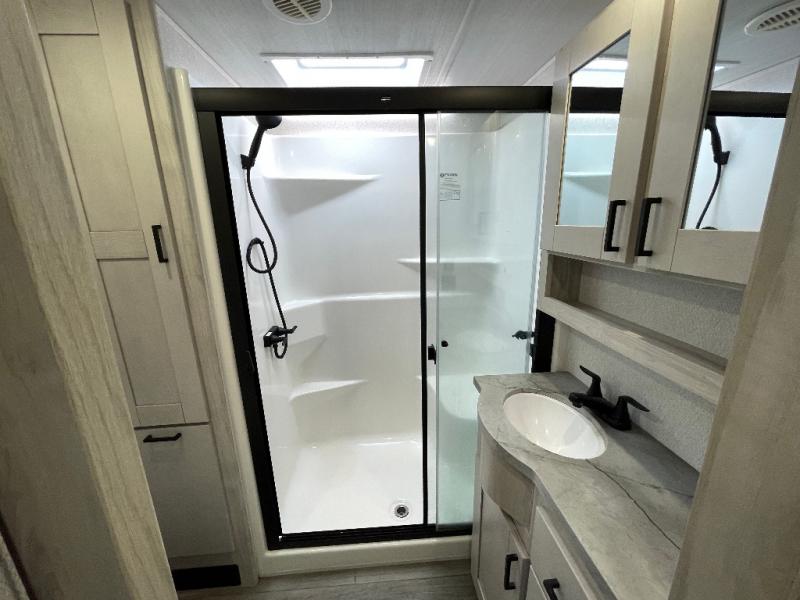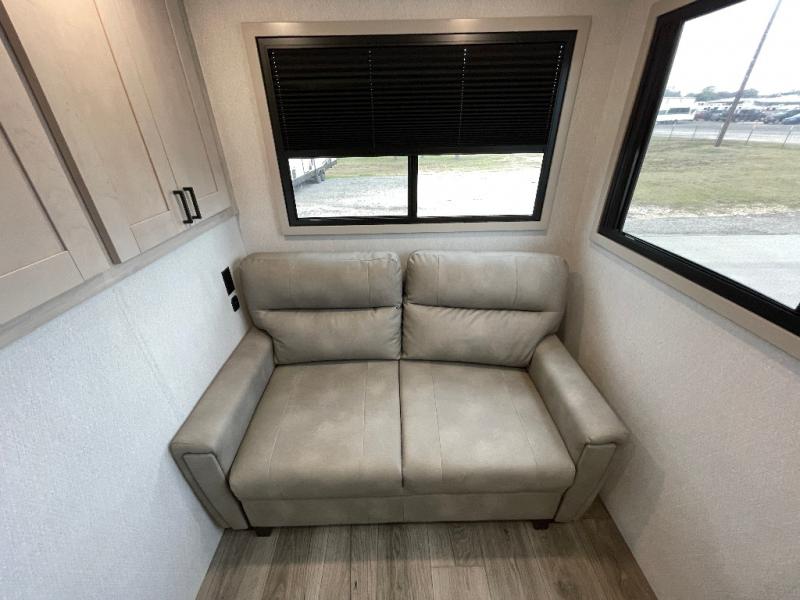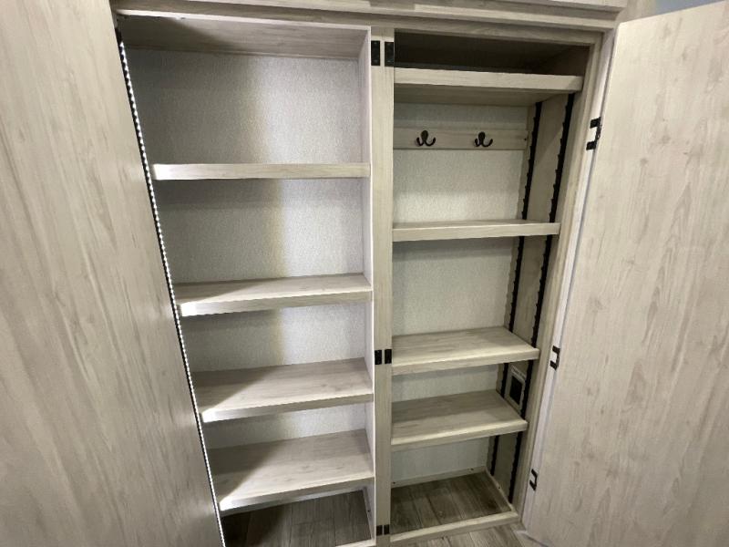 One look at this fifth wheel and you'll be sold! There is a rear private bunkhouse suite with a half bath, a hide-a-bed sofa, plus loft storage/bed! You will have the front private bedroom with a king bed slide out all to yourselves, plus there is a full-length wardrobe, a dresser with TV prep, and bedside shelves for your things. The spacious full bath is close by the bedroom and you'll appreciate the linen closet for clean towels and the shower skylight for added natural light. Everyone will love to gather together in the main living area/kitchen that includes theater seating across from a 50" TV with a fireplace, a free-standing dinette, plus a kitchen island with countertop extensions. And have you checked out the storage found throughout this model; overhead cabinets, loft storage, bedroom storage, and an oversized pass-through compartment outside!
