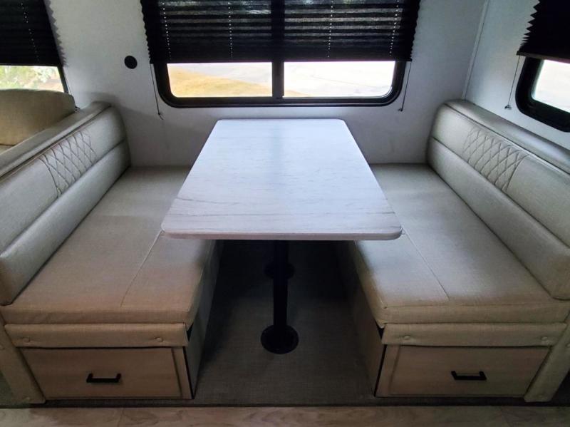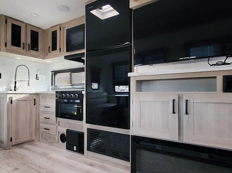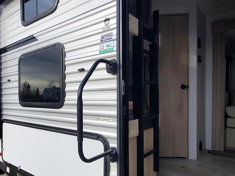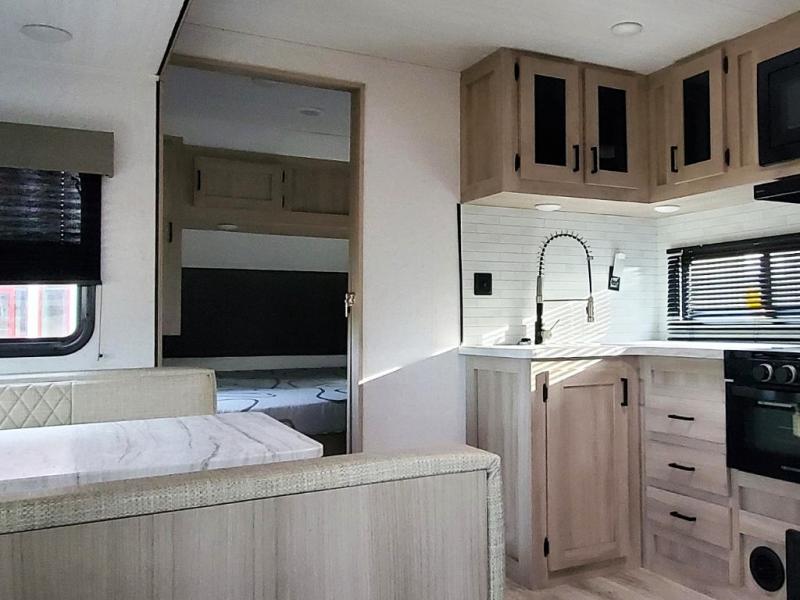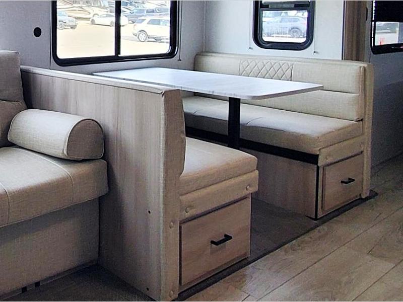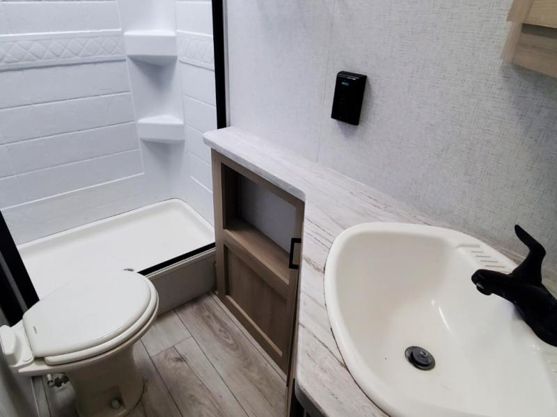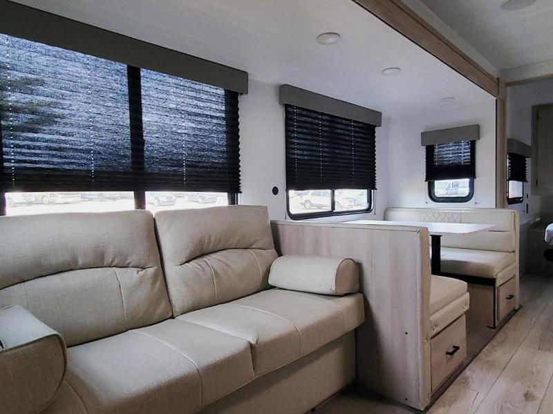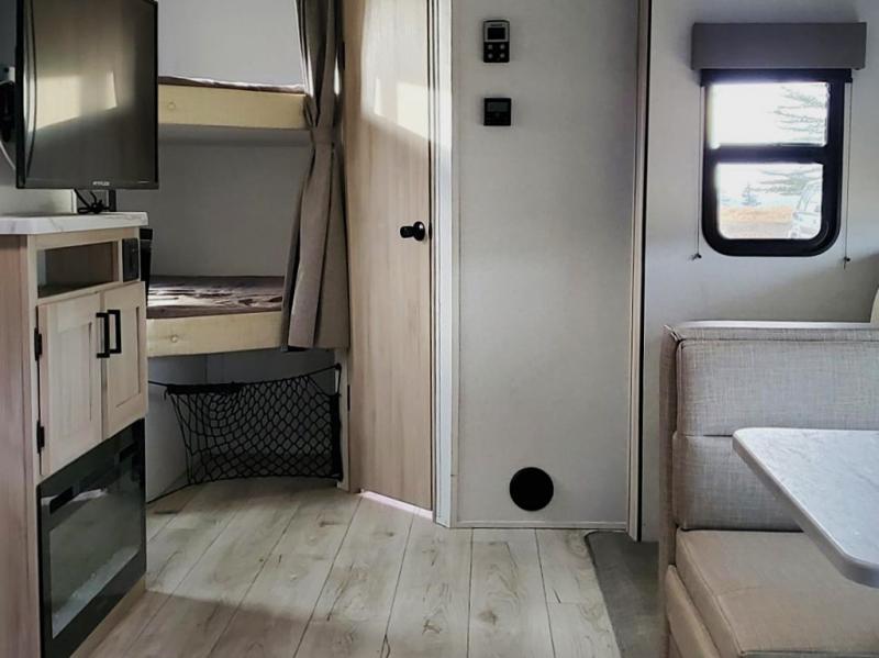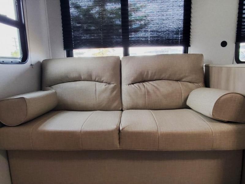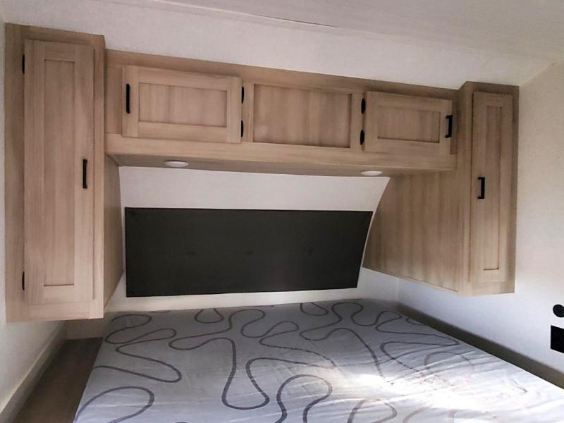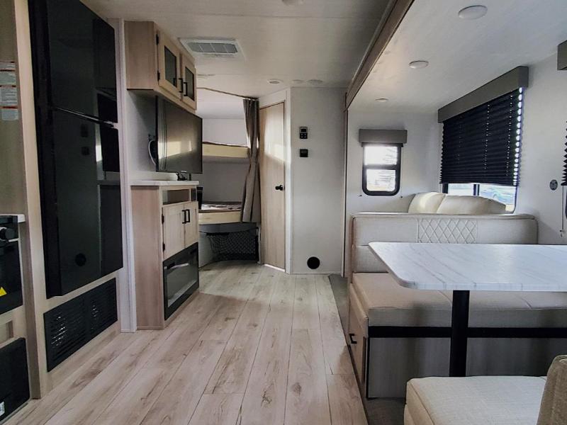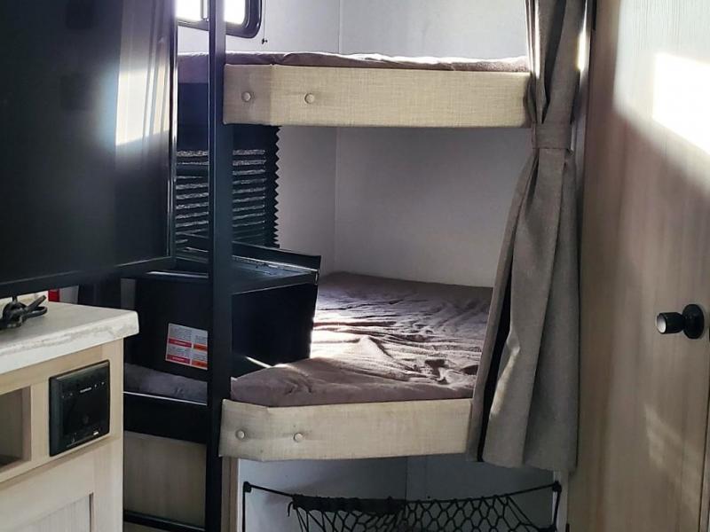 Pack up the whole gang since this unit features sleeping for ten! As you enter you will find easy access to the rear corner bath including a 24" x 40" walk-in shower, toilet, and vanity with sink, plus medicine cabinet just steps away. The slide creates an open and spacious feel for relaxing and dining inside. Here you will find a jackknife sofa and oversized booth dinette with both featuring underneath storage. You will sleep like a king in the front private bedroom with a king bed and a space saving sliding door. Your family and or friends will love sleeping on the double-size bunks and furniture once easily setup for nighttime. This unit also features pass-through storage outside, more exterior storage beneath the double bed bunks, and an optional outside kitchen with fridge and pull-out griddle can be added for those who love to cook outdoors!