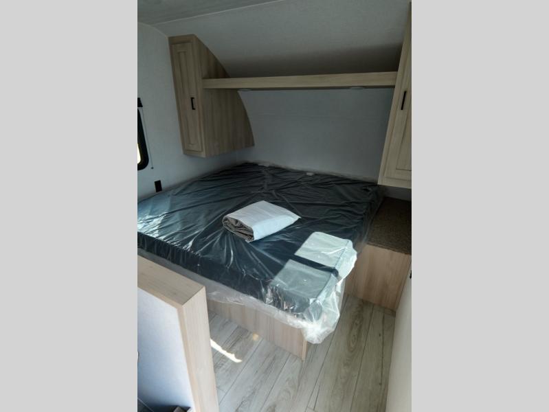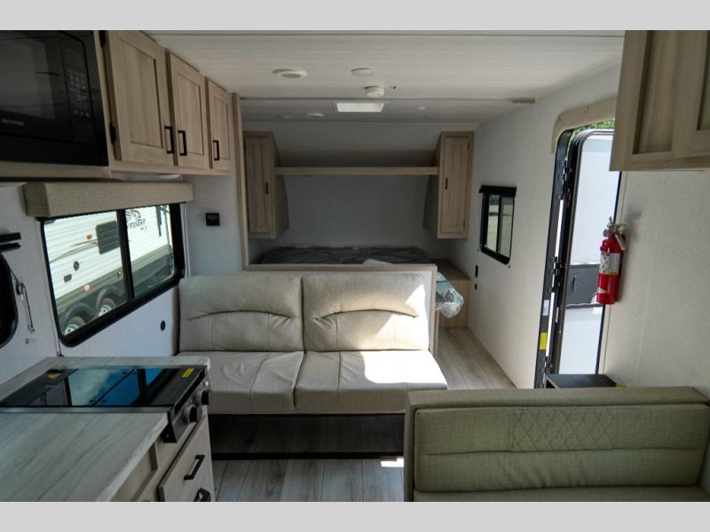 Head to your favorite camping spot in this travel trailer for four to five campers! You will love waking up each morning on the 72" x 80" king bed that includes storage underneath plus dual wardrobes to keep your clothes wrinkle-free. The full rear bath with a 24" x 40" walk-in shower will let you freshen up, and the linen closet here is convenient for towels and toiletries. Head to the kitchen where you can make breakfast on the two burner cooktop or make instant oatmeal in the microwave oven. There is a booth dinette and jack knife sofa for seating space, or you might just want to sit outdoors under the 15' power awning!