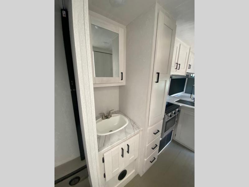 When traveling you want comfort no matter if you are driving, riding, or relaxing once at your campsite. Well, you will have it in this coach! There is a 62" sofa and 42" x 68" booth dinette that can be used for lounging together after an afternoon of walking around the campground, plus the bunk over the cab and the queen-size bed can be utilized if you are too tired to stay up for another minute. Once you are fully rested, head to the kitchen to prepare a delicious breakfast feast with the convection microwave and cooktop. Use the double sink to clean up, and the 10.7-cubic foot refrigerator to keep your perishables fresh. You can even add some extra prep space to this area by pulling out the flip-up countertop. There is also storage all throughout this motorhome with bedside closets, the bathroom shelves, a kitchen pantry, cab storage, and within overhead cabinets.