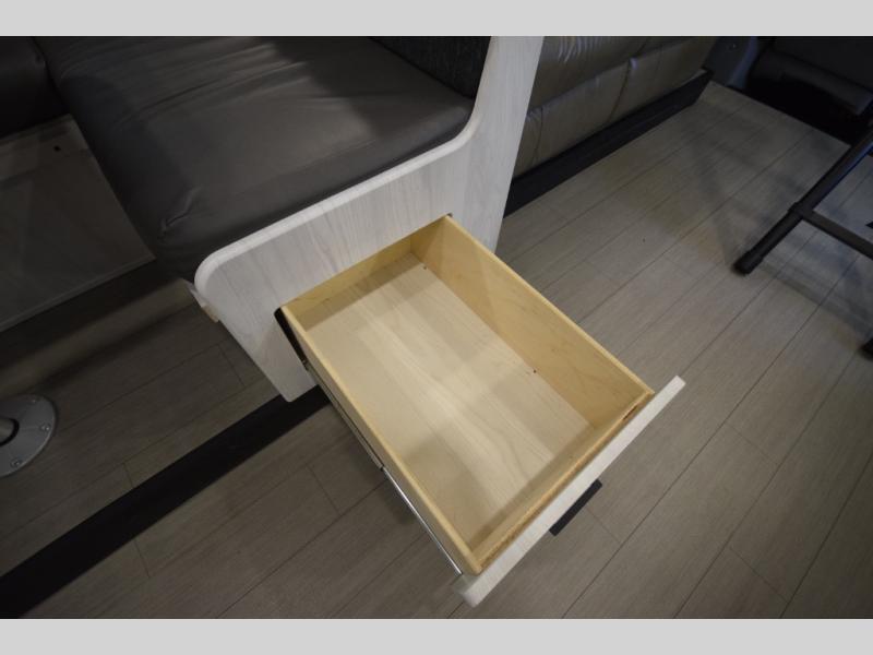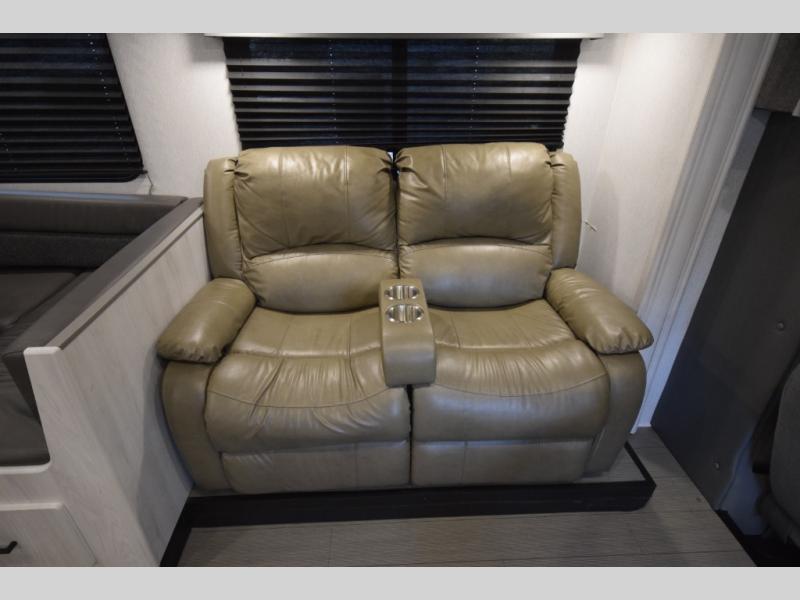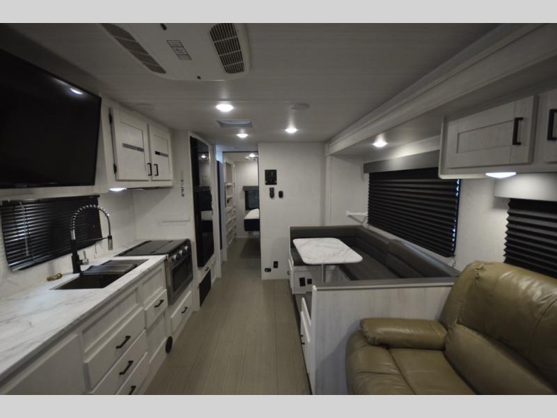 Step inside and be greeted by a wide-open living area featuring a large slide-out with a comfy sofa and a roomy U-shaped dinette—perfect for game nights, meals, or simply kicking back after a day of adventure. Overhead, a full-size 60" x 80" bunk provides extra sleeping space, making this coach ideal for families or guests on board.
