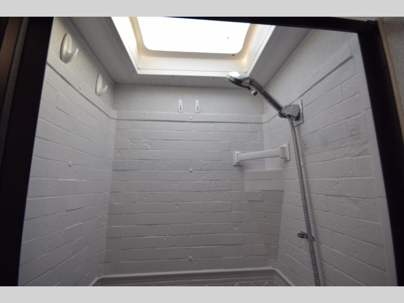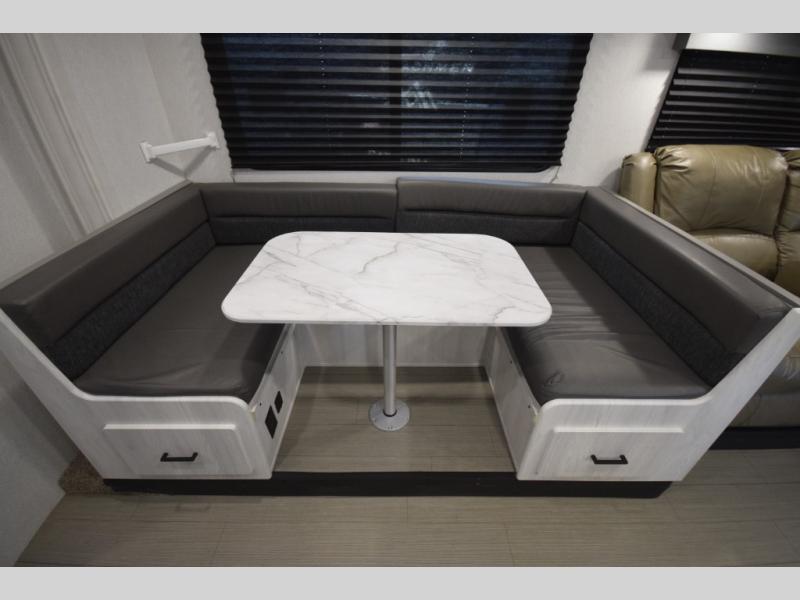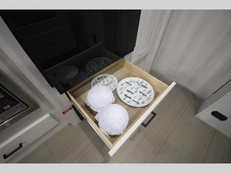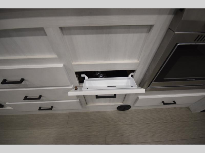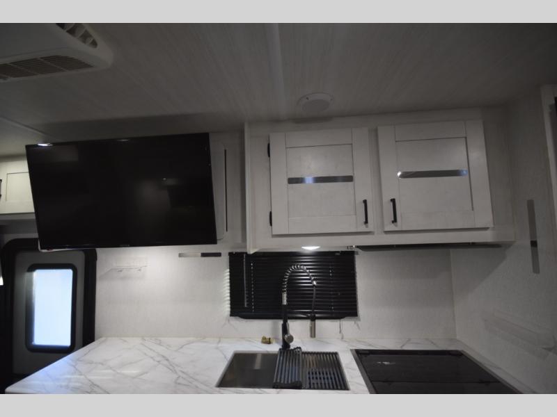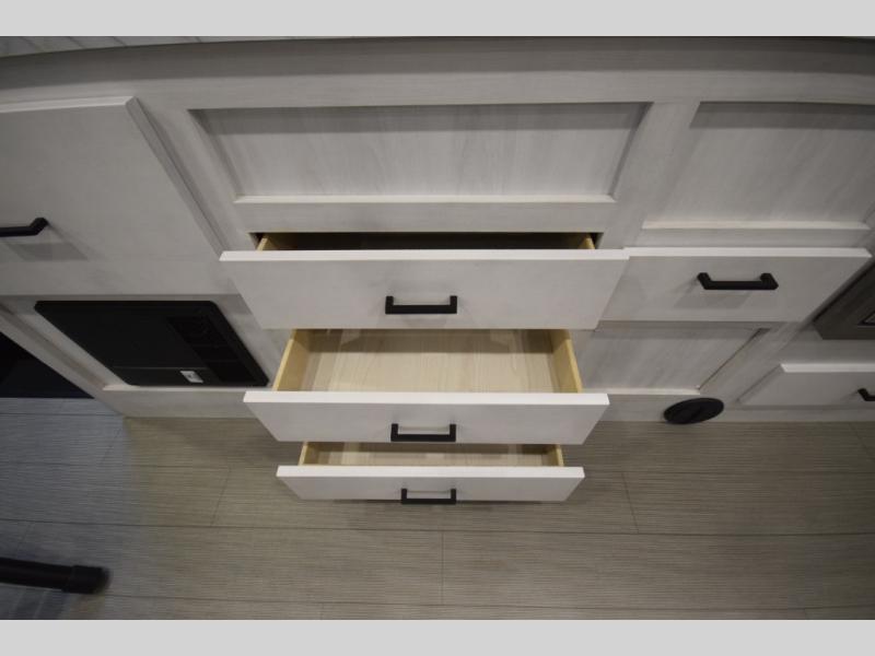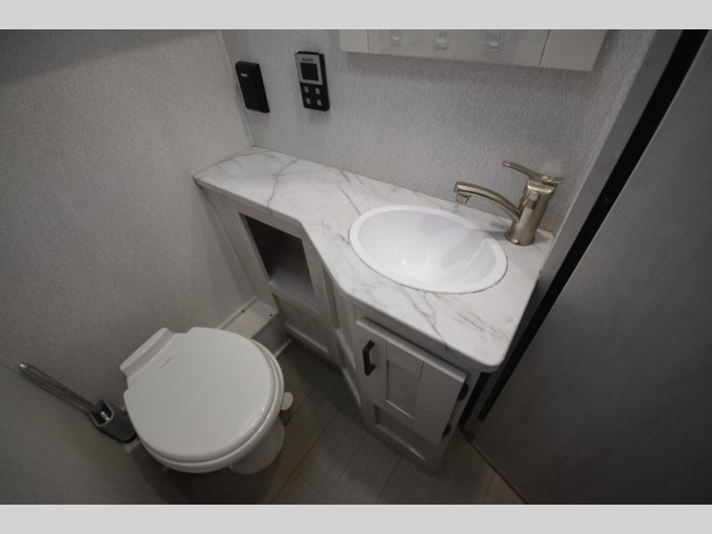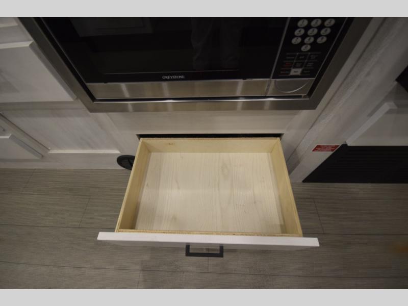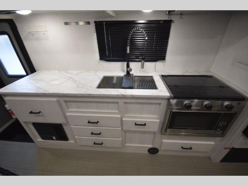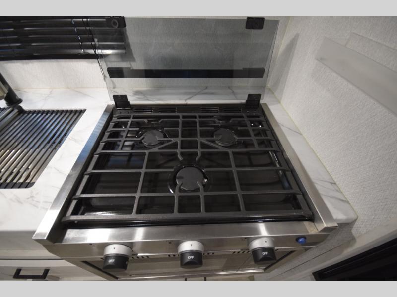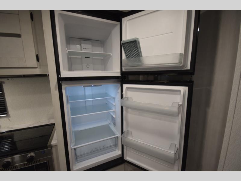 Cooking is a breeze with the fully equipped kitchen, featuring a three-burner cooktop, convection microwave, deep sink, extended countertop space, and a 10.7 cu. ft. 12V refrigerator to keep your ingredients fresh. And when it's time to freshen up, the split bathroom layout allows two people to use the space at once—shower on one side, private toilet and sink on the other.