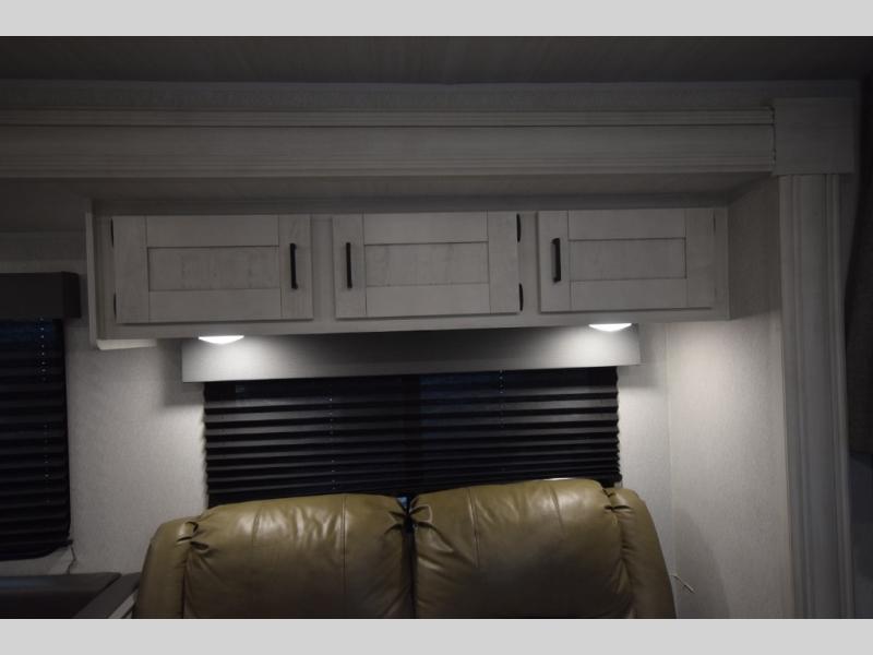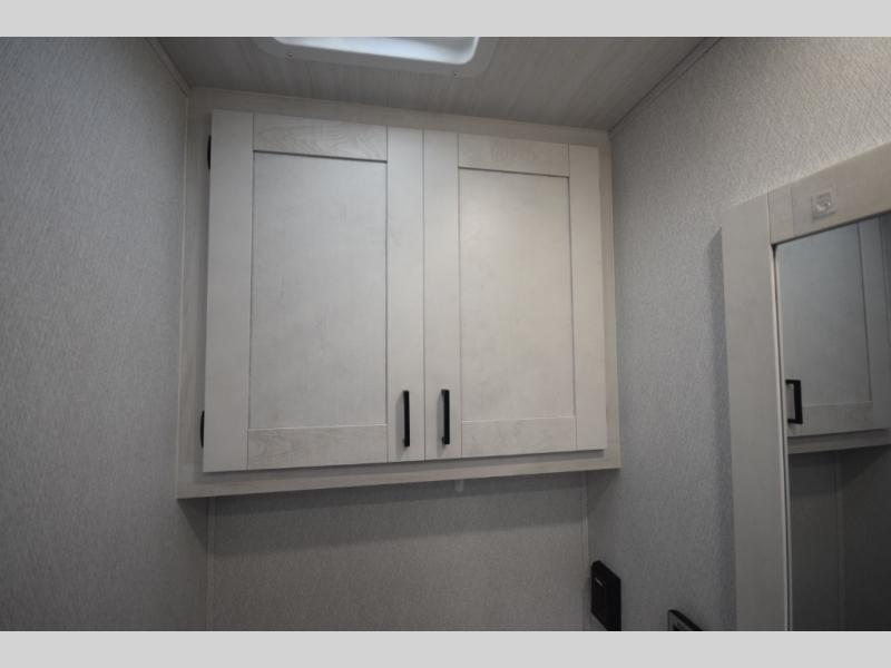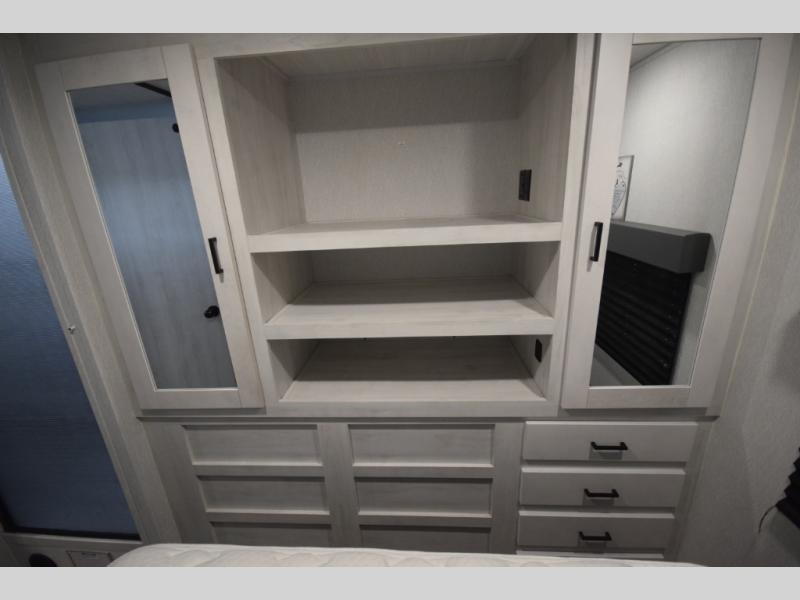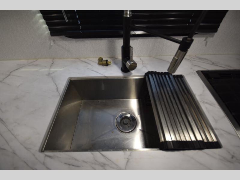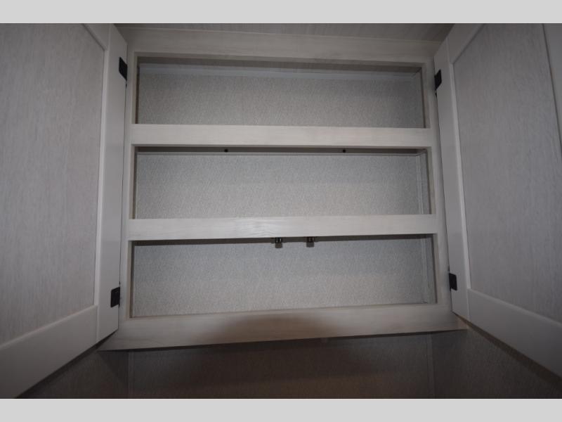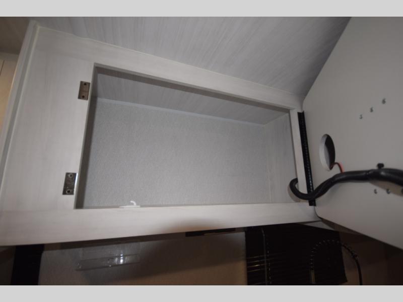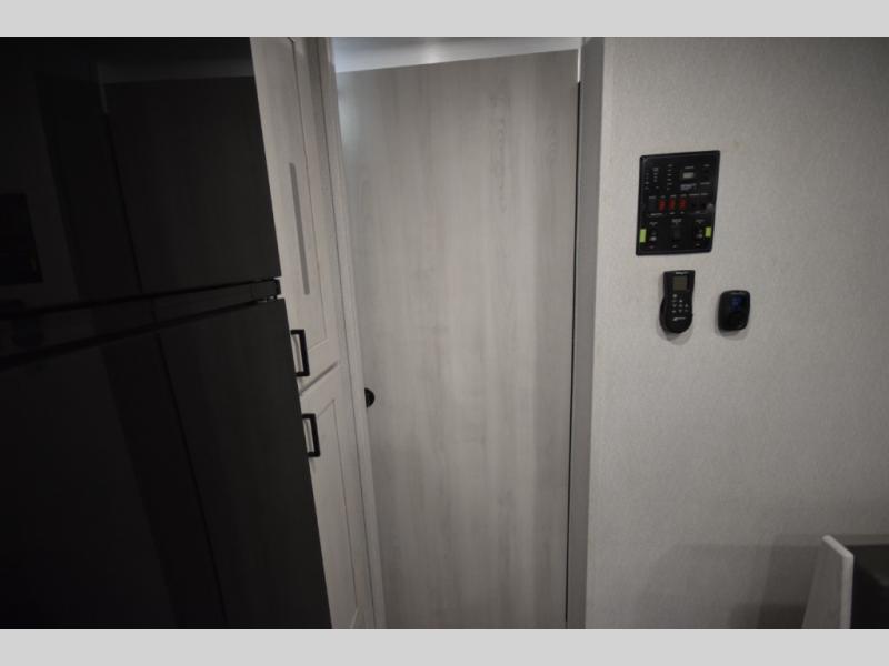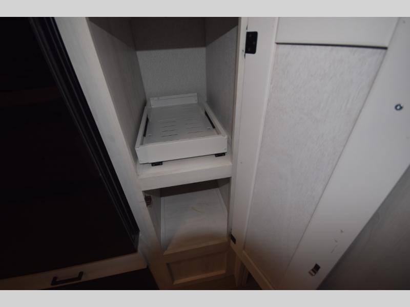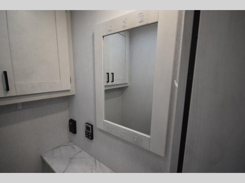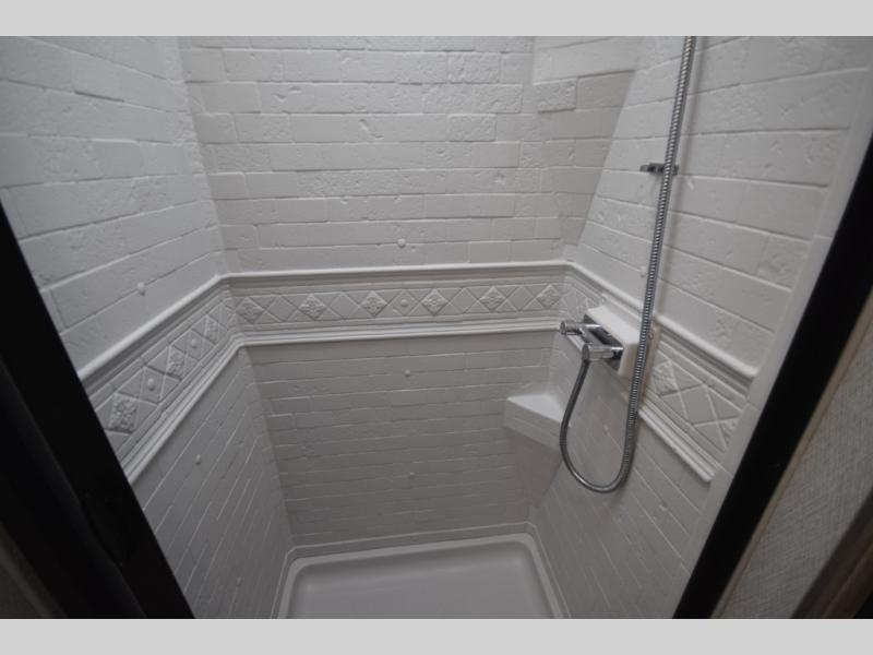 Cooking is a breeze with the fully equipped kitchen, featuring a three-burner cooktop, convection microwave, deep sink, extended countertop space, and a 10.7 cu. ft. 12V refrigerator to keep your ingredients fresh. And when it's time to freshen up, the split bathroom layout allows two people to use the space at once—shower on one side, private toilet and sink on the other.