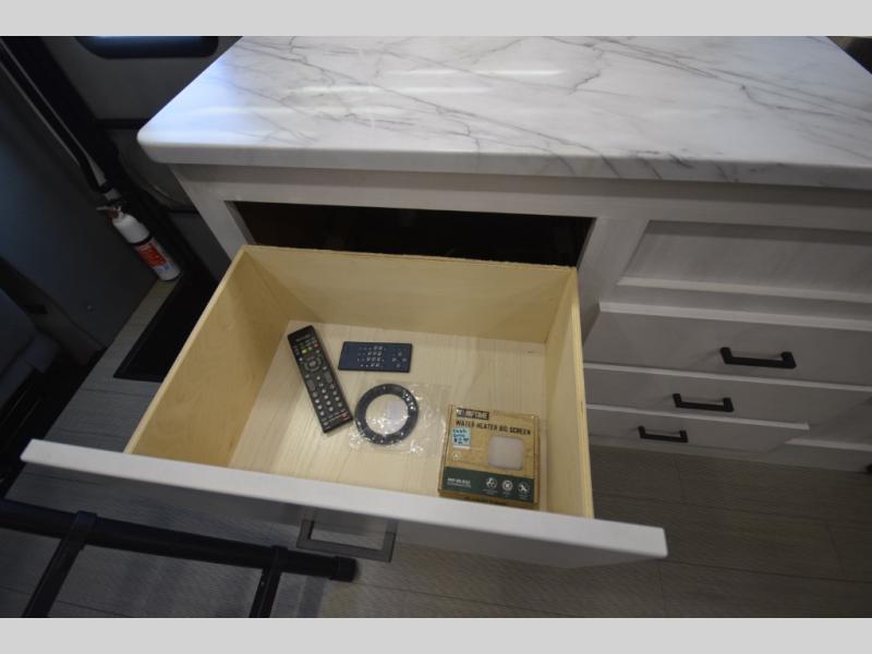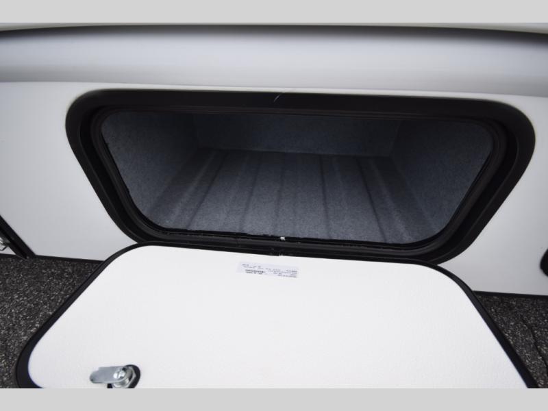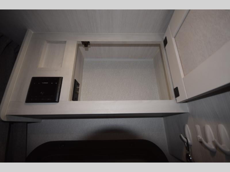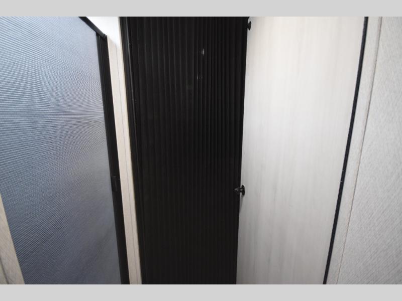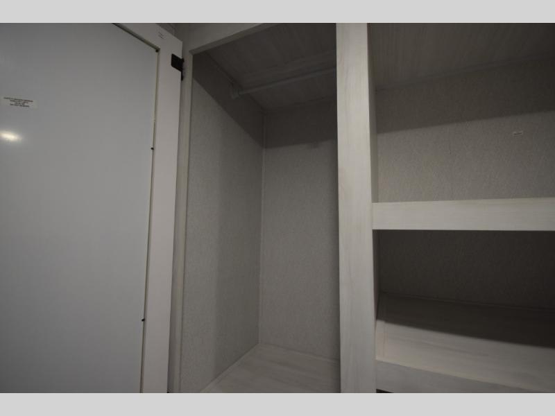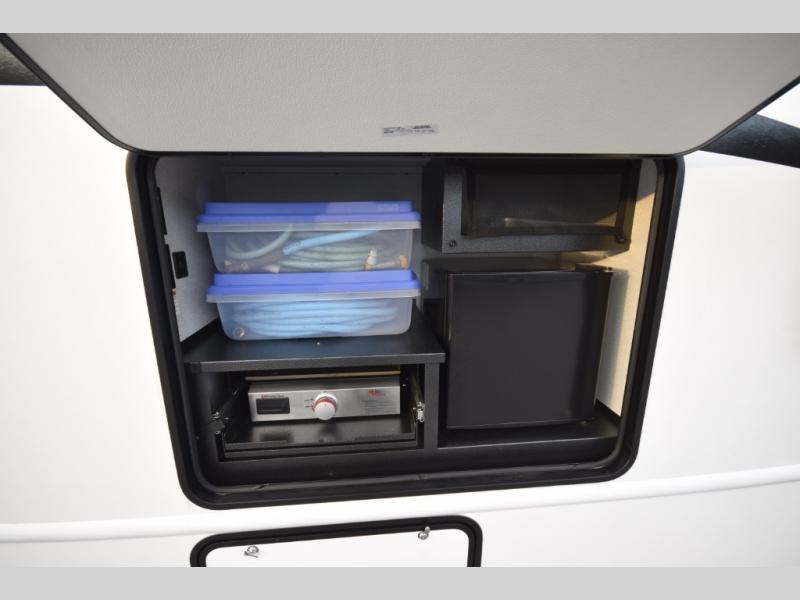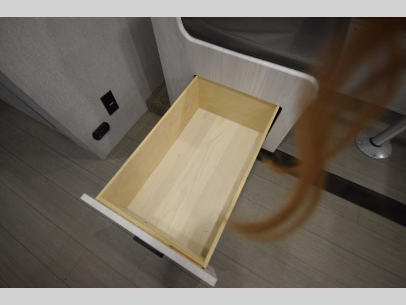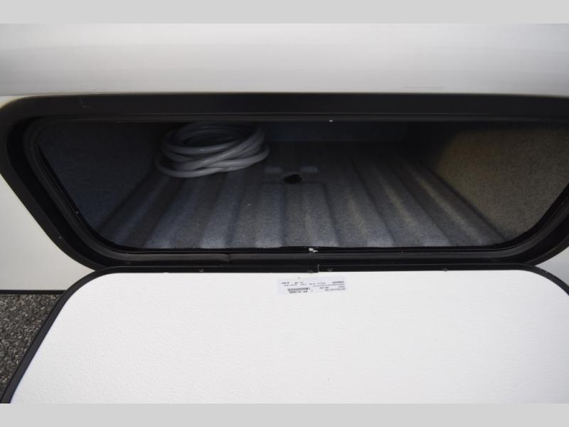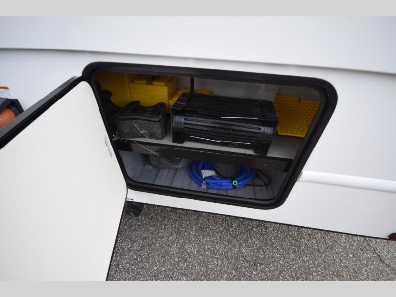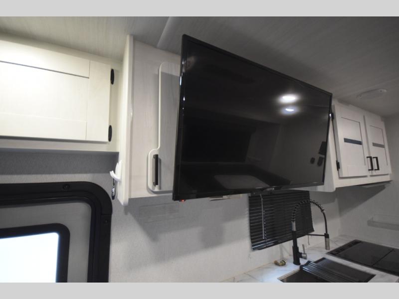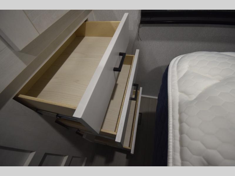 Cooking is a breeze with the fully equipped kitchen, featuring a three-burner cooktop, convection microwave, deep sink, extended countertop space, and a 10.7 cu. ft. 12V refrigerator to keep your ingredients fresh. And when it's time to freshen up, the split bathroom layout allows two people to use the space at once—shower on one side, private toilet and sink on the other.